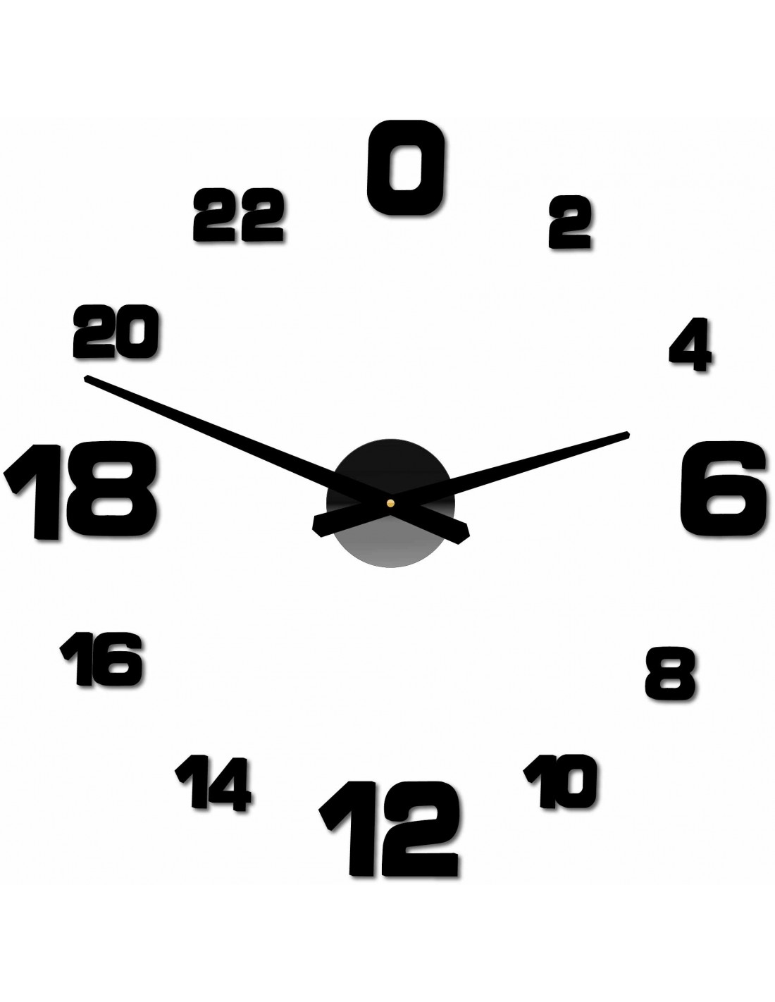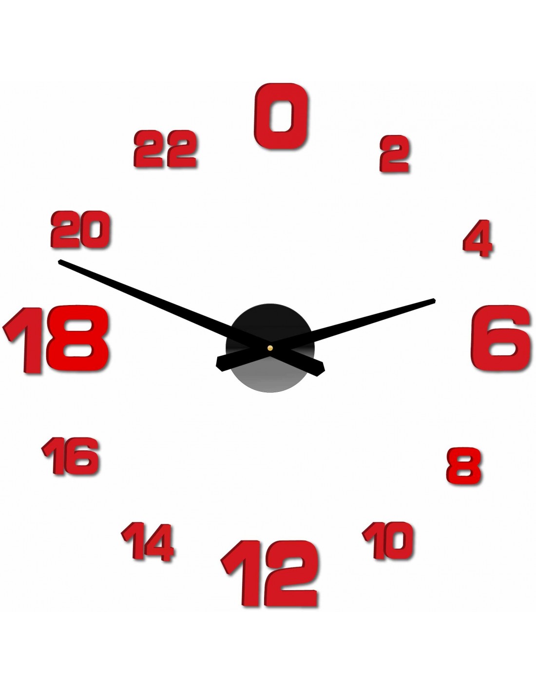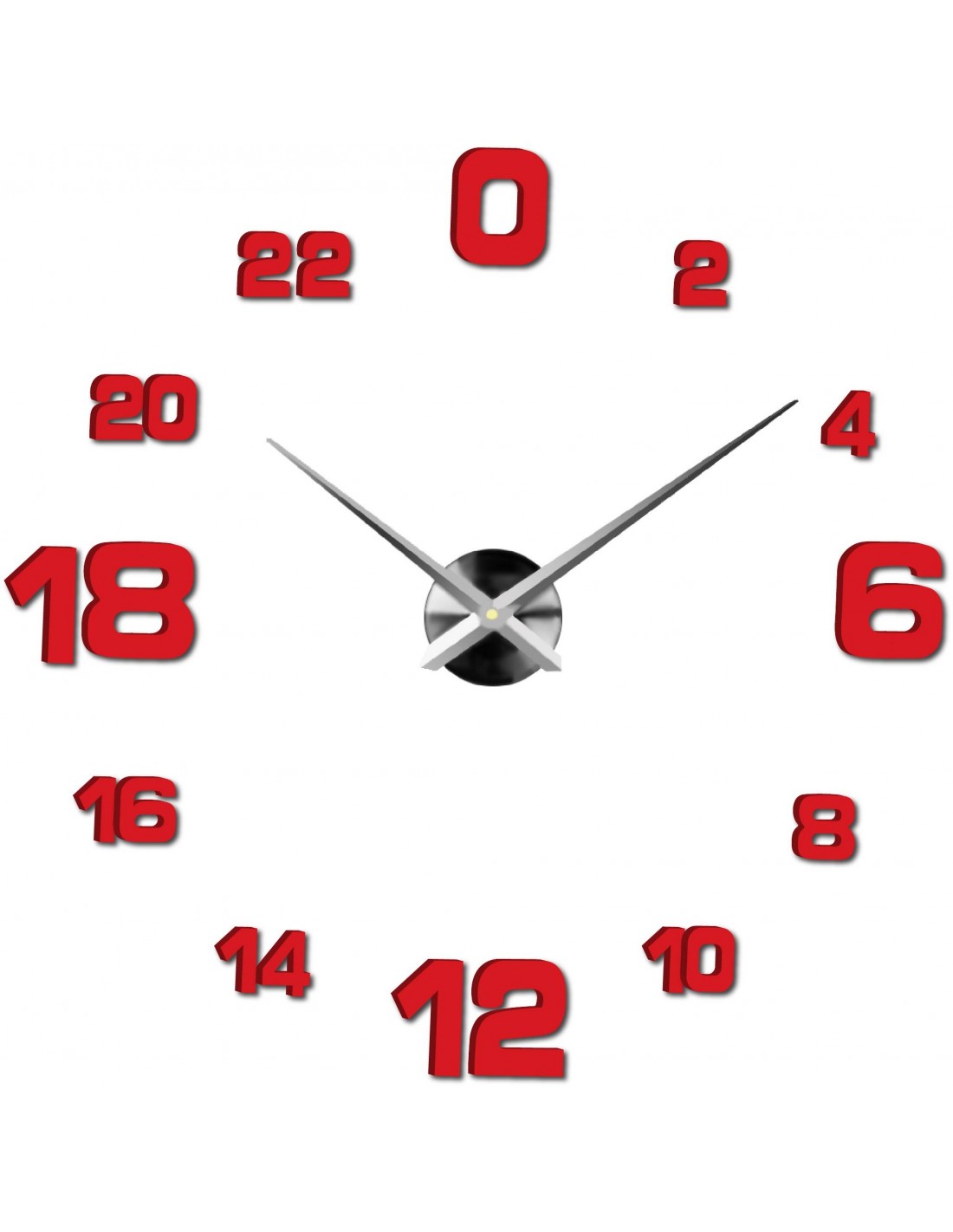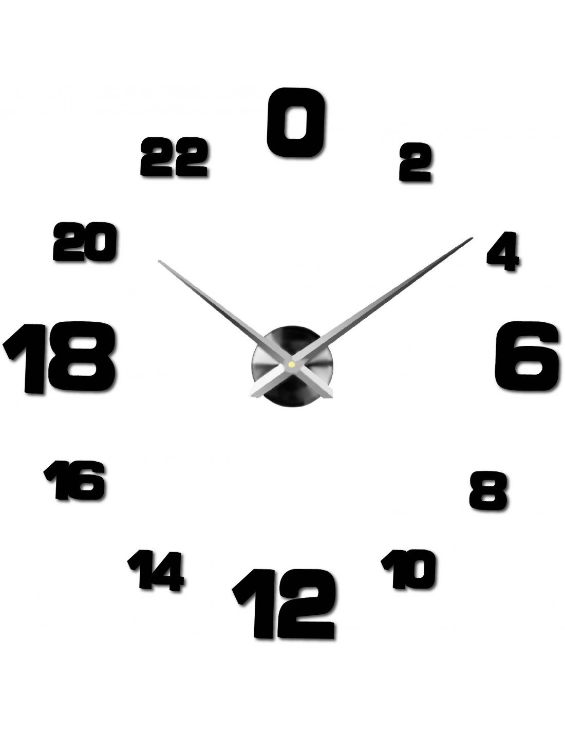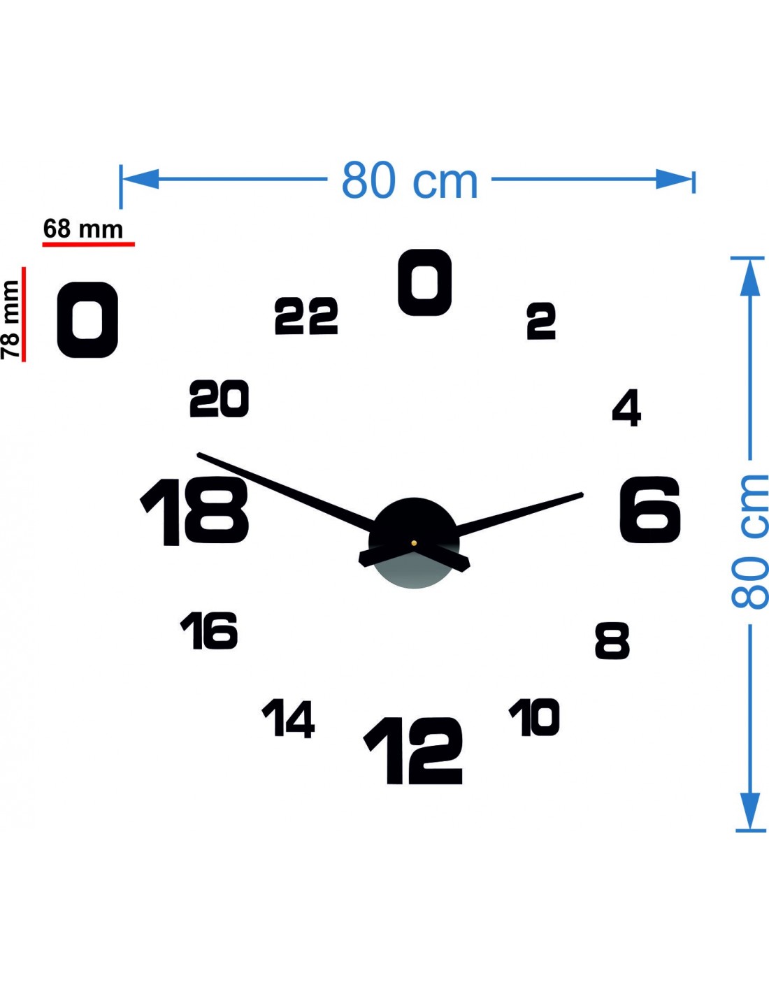 Minimum sticker dimensions: 800 x 800 mm, can be enlarged up to 1300 x 1300 mm. Clockwork dimensions: 100 x 100 mm. Hand length: 30 - 40 cm.