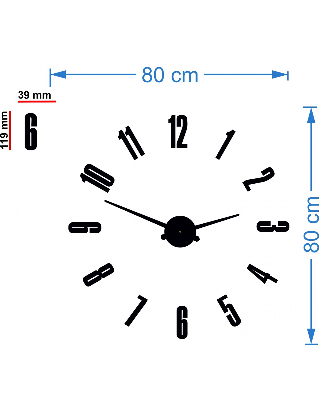 Sticker dimensions: 800 x 800 mm, can be enlarged up to 1300 x 1300 mm. Clockwork dimensions: 100 x 100 mm. Hand length: 30 - 40 cm.