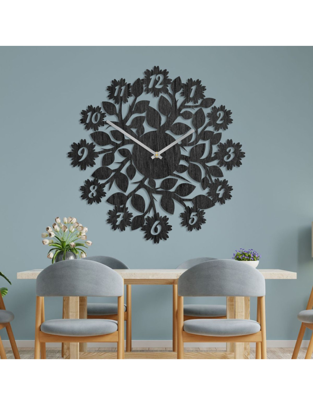 Elegant wooden clock with silent operation and a delicate floral motif. Natural design suitable for both modern and rustic interiors.