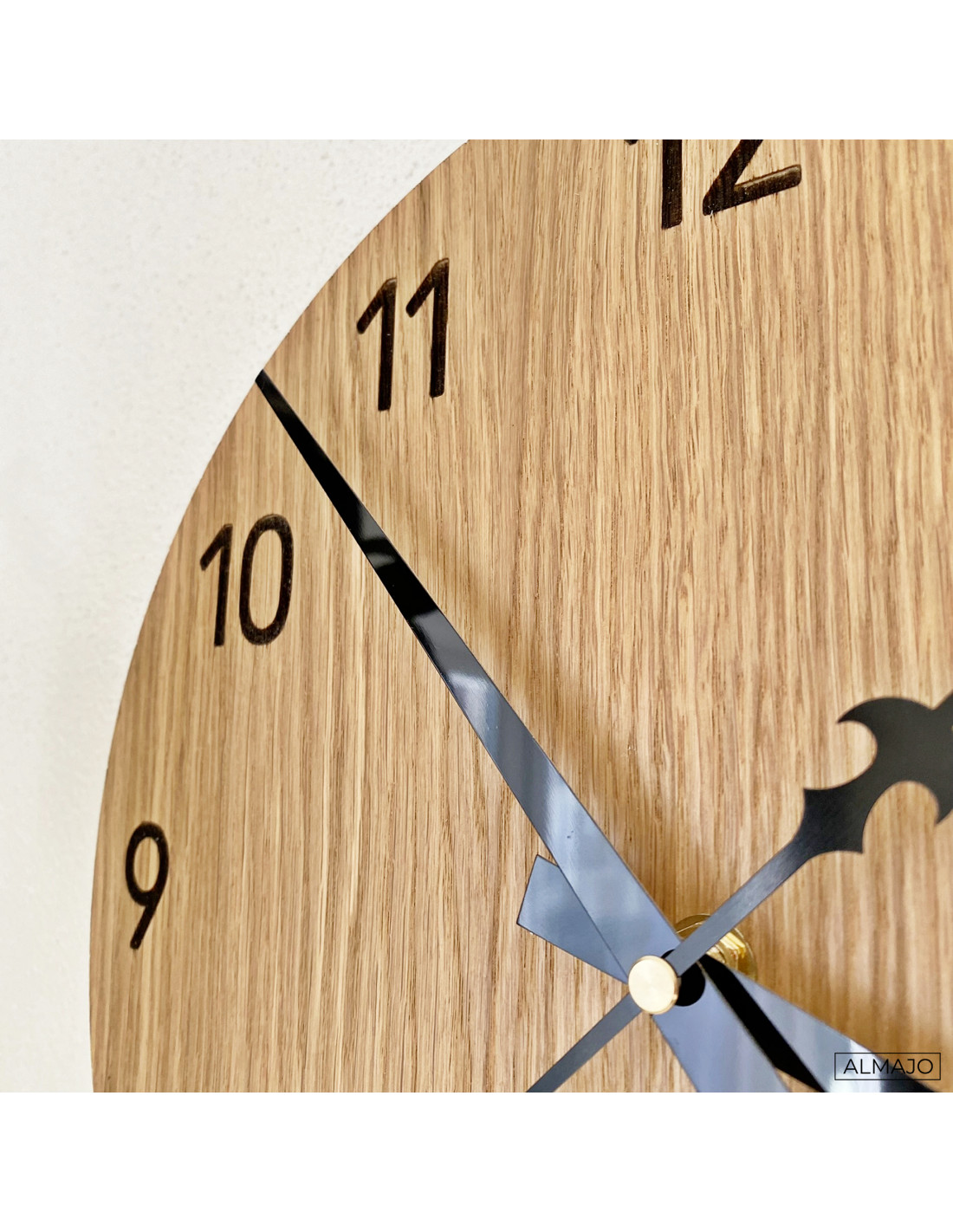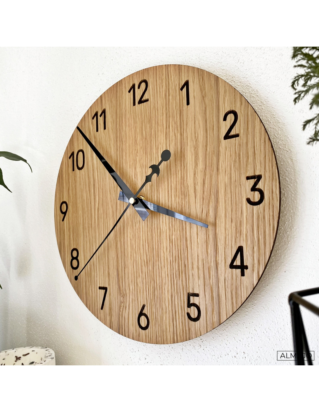 The natural beauty of oak wood combined with elegant black hands creates a subtle and modern look. The clock blends perfectly with both rustic and minimalist interiors and brings a harmonious visual element to the space.