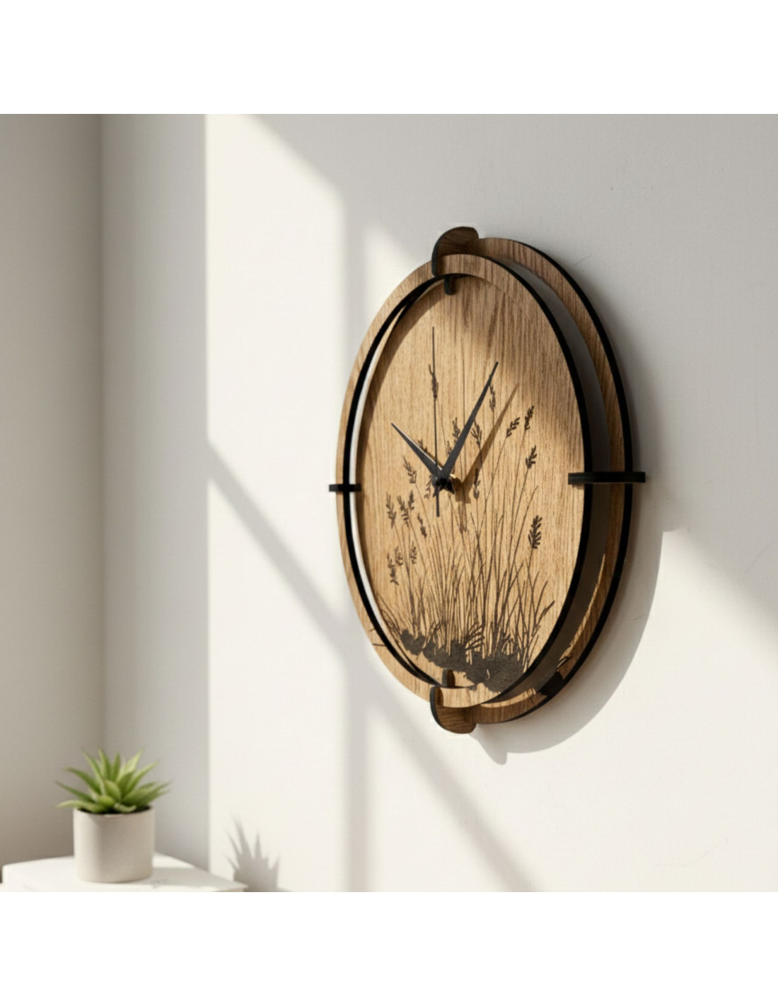 Modern wooden wall clocks with a delicate engraved motif of meadow grasses bring natural harmony and timeless design to the interior.