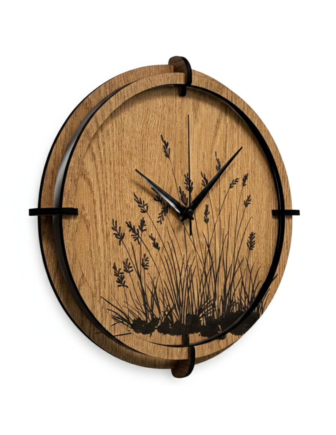 Modern wooden wall clocks with a delicately engraved natural meadow grass motif bring peace, harmony and timeless elegance to the interior.