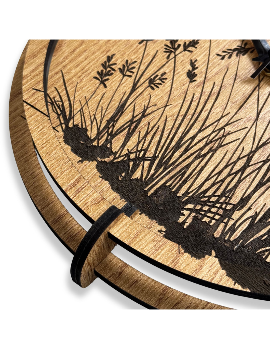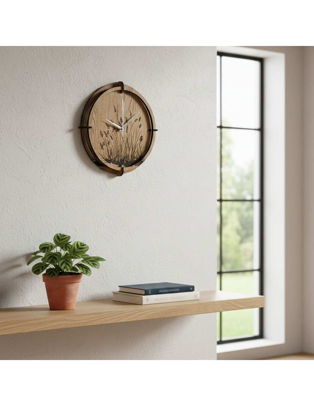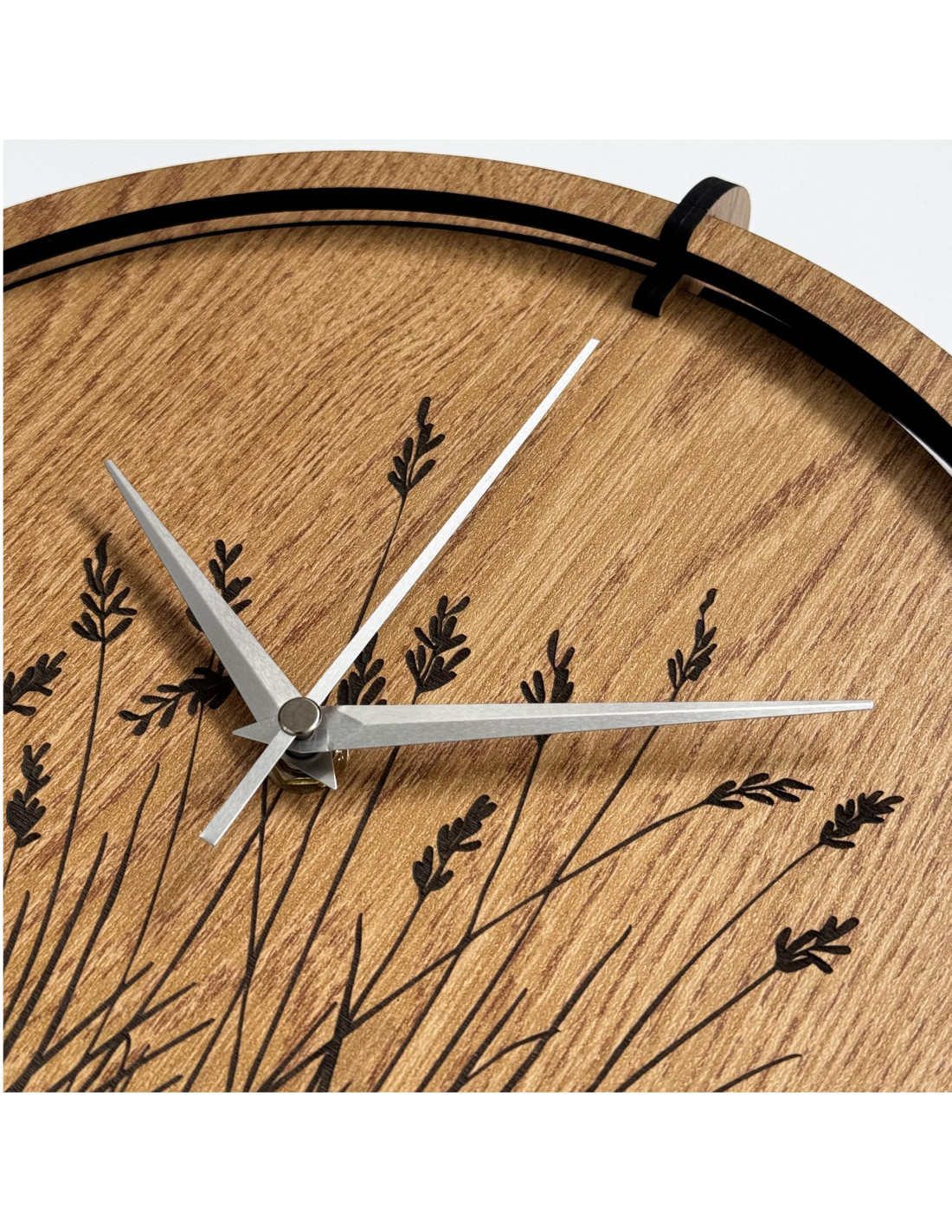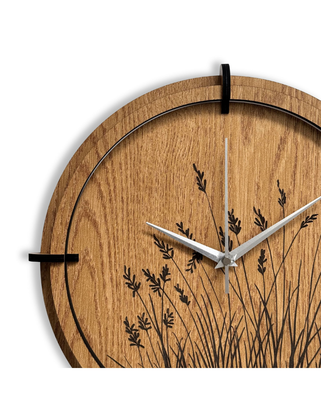 Modern wooden wall clocks with a delicate engraved motif of meadow grasses bring natural harmony and timeless design to the interior.