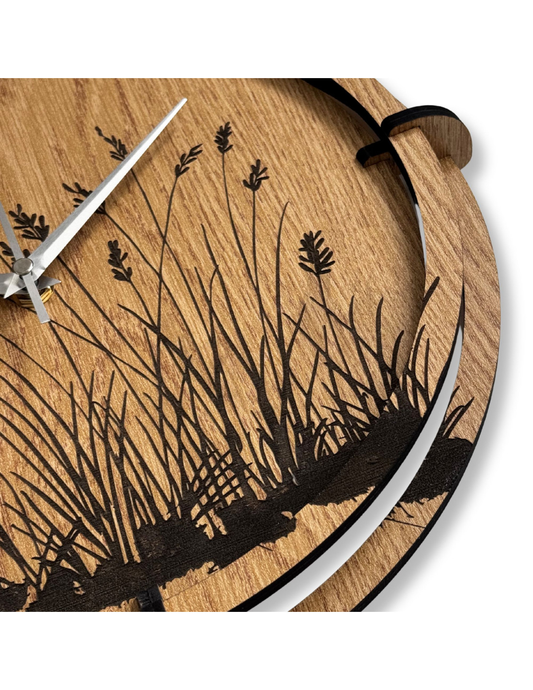 Modern wooden wall clocks with a delicately engraved natural meadow grass motif bring peace, harmony and timeless elegance to the interior.