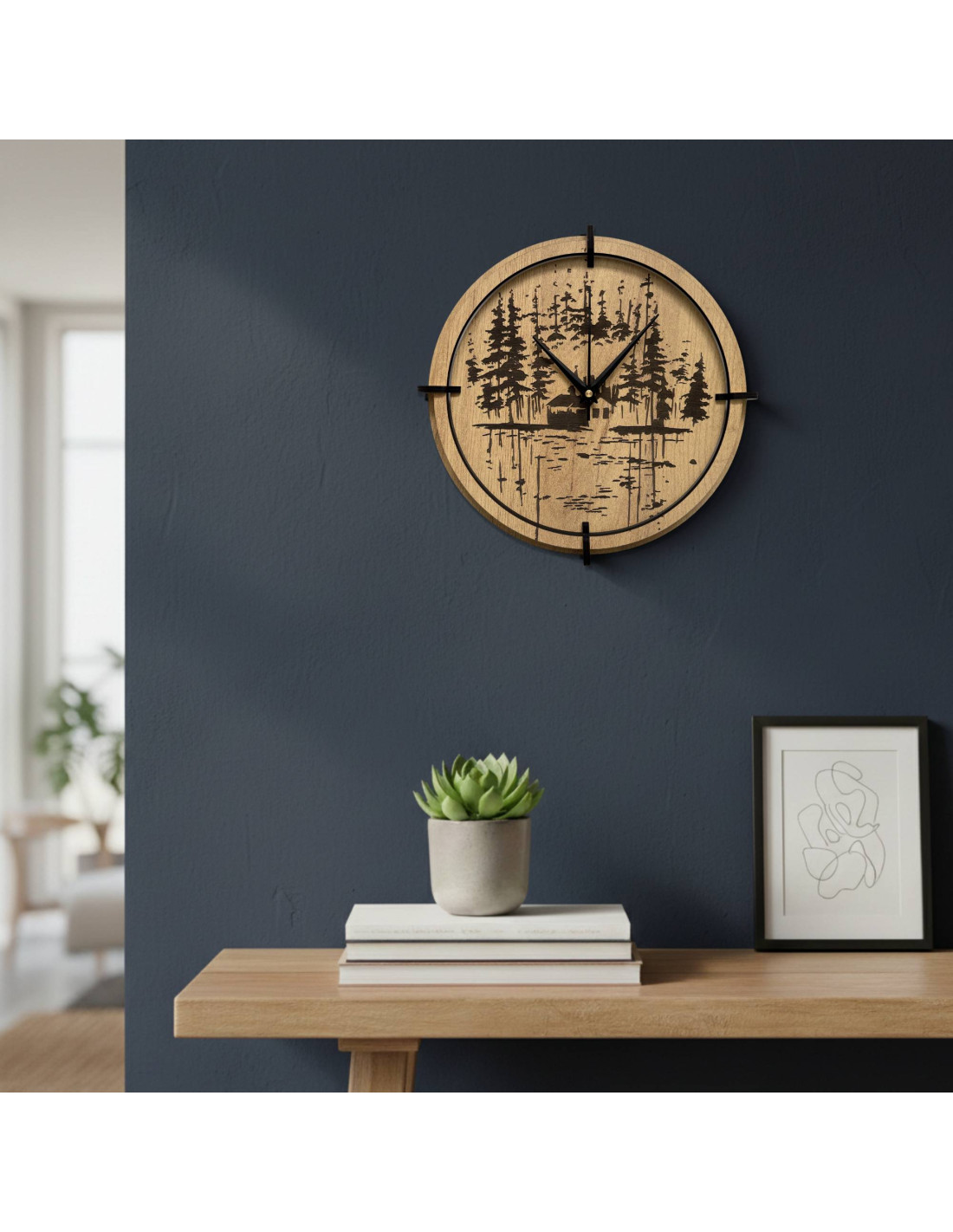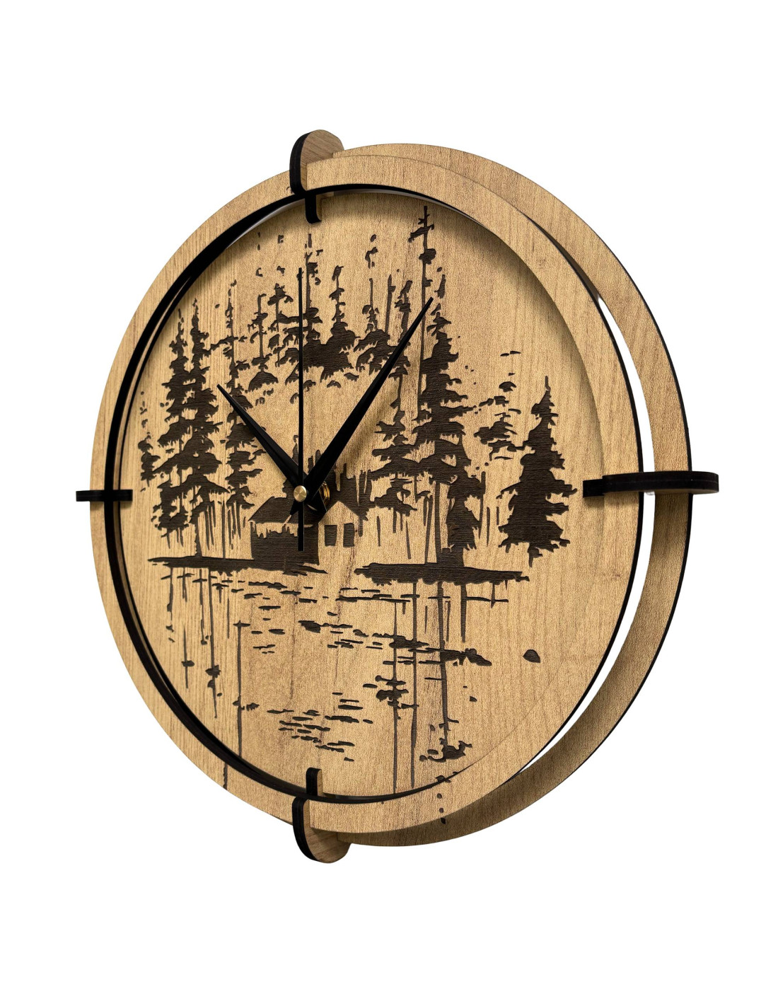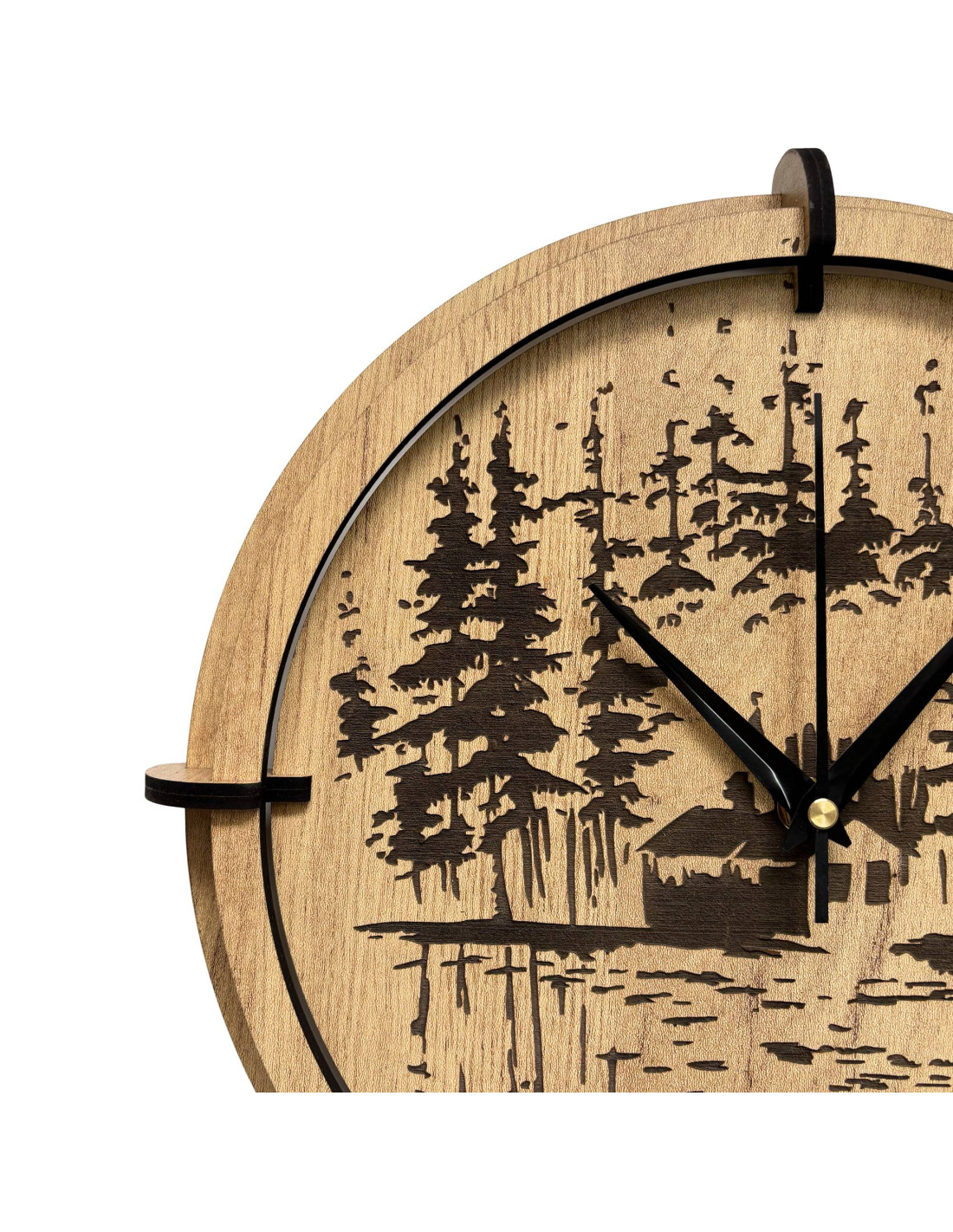 Modern wooden wall clocks with a precisely engraved motif of a forest cabin by the lake bring the peace of nature and the unique atmosphere of the forest into the interior.