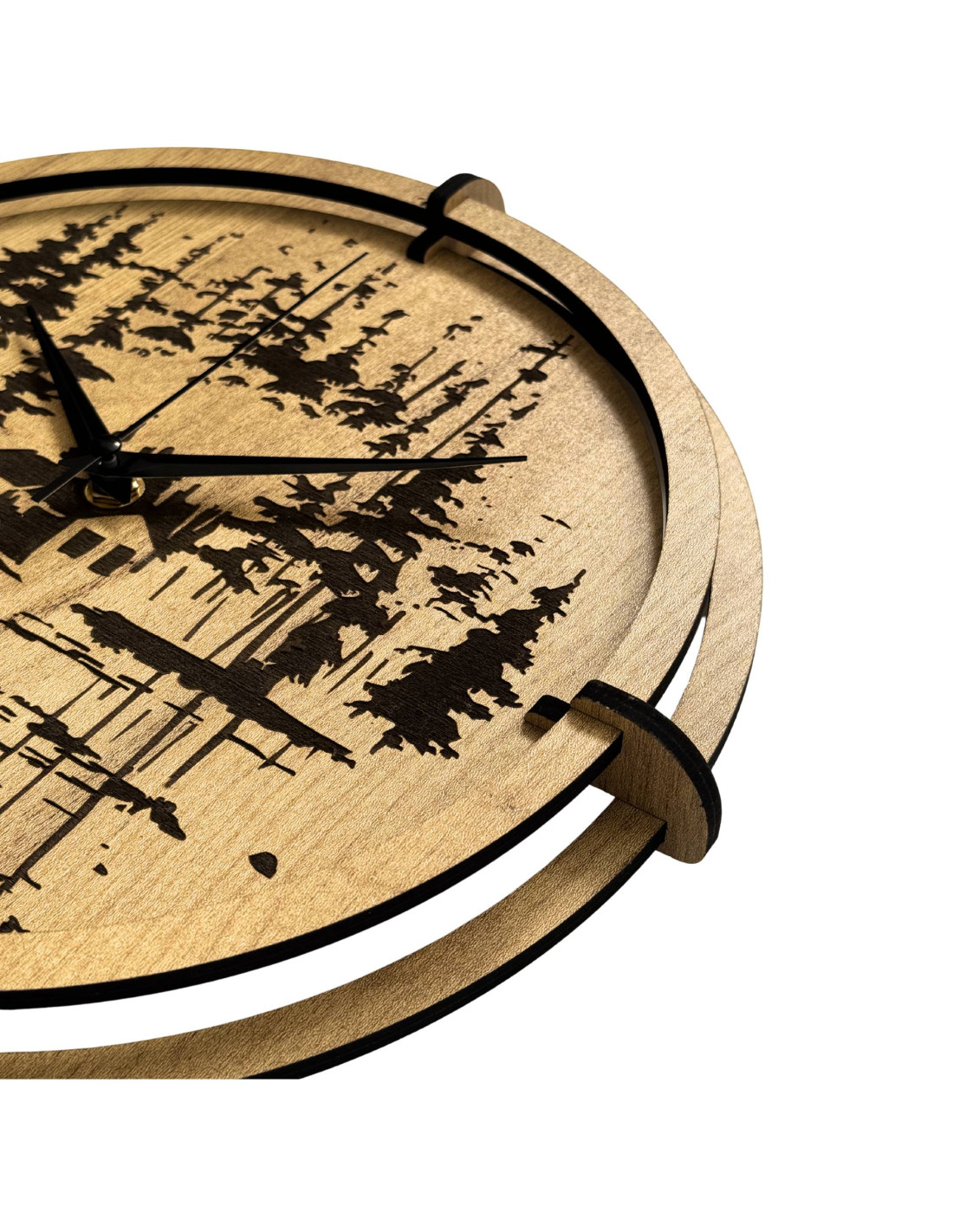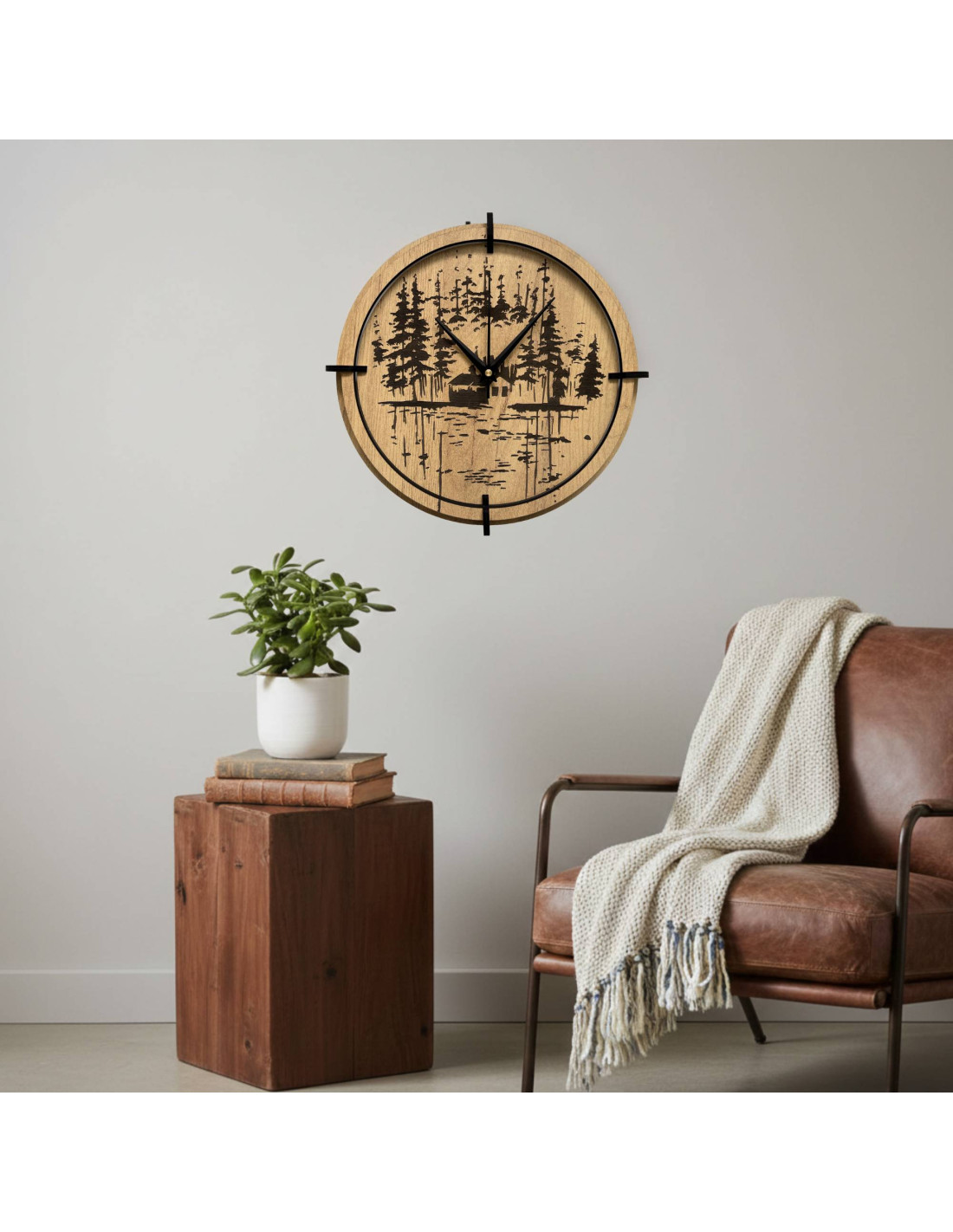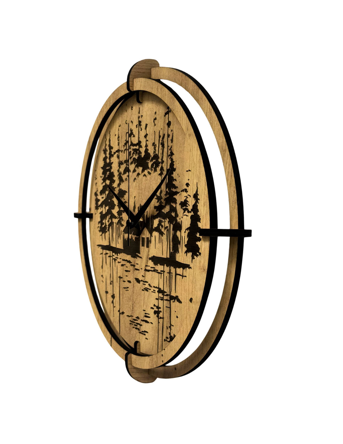 Modern wooden wall clocks with a precisely engraved motif of a forest cabin by the lake bring the peace of nature and the unique atmosphere of the forest into the interior.