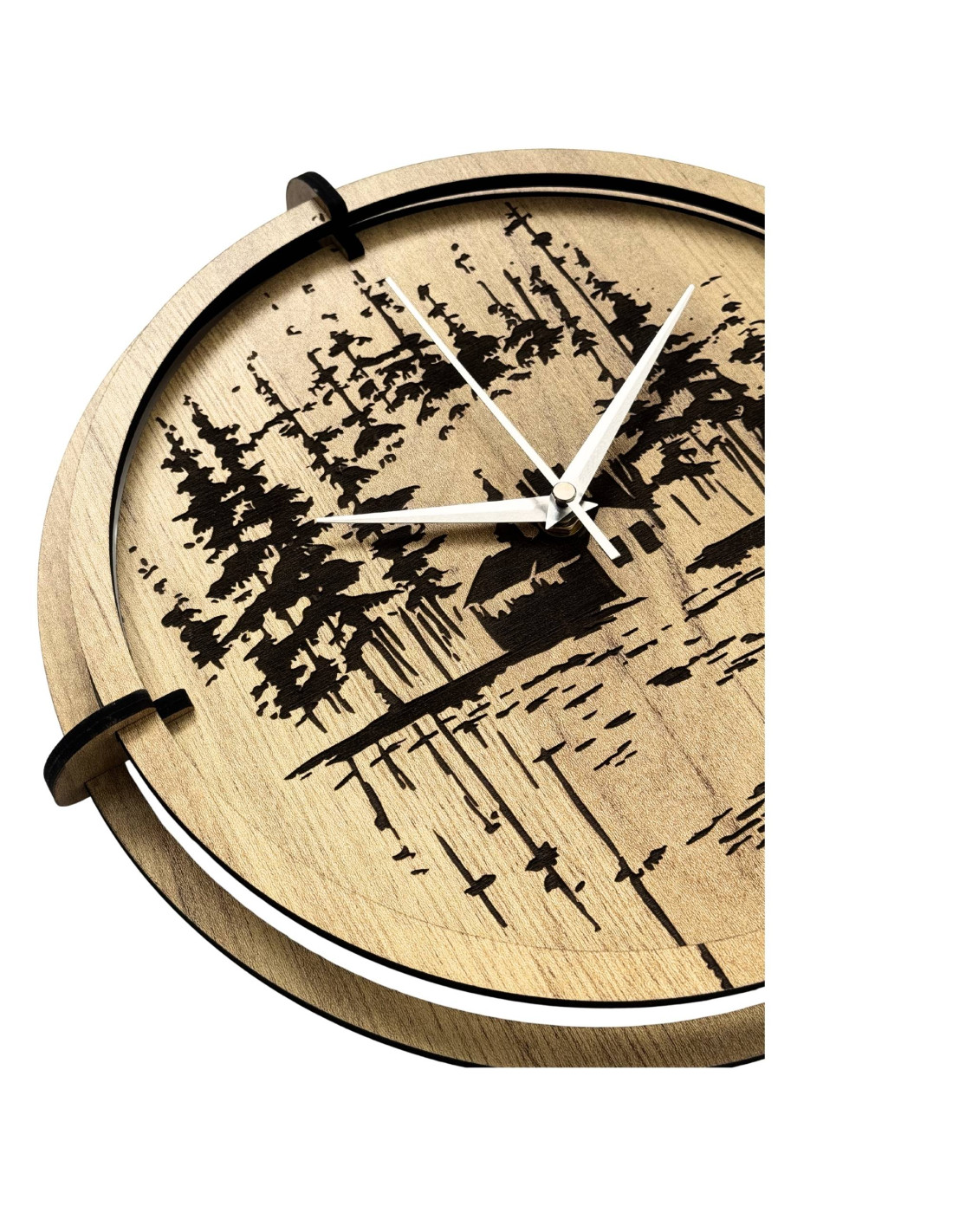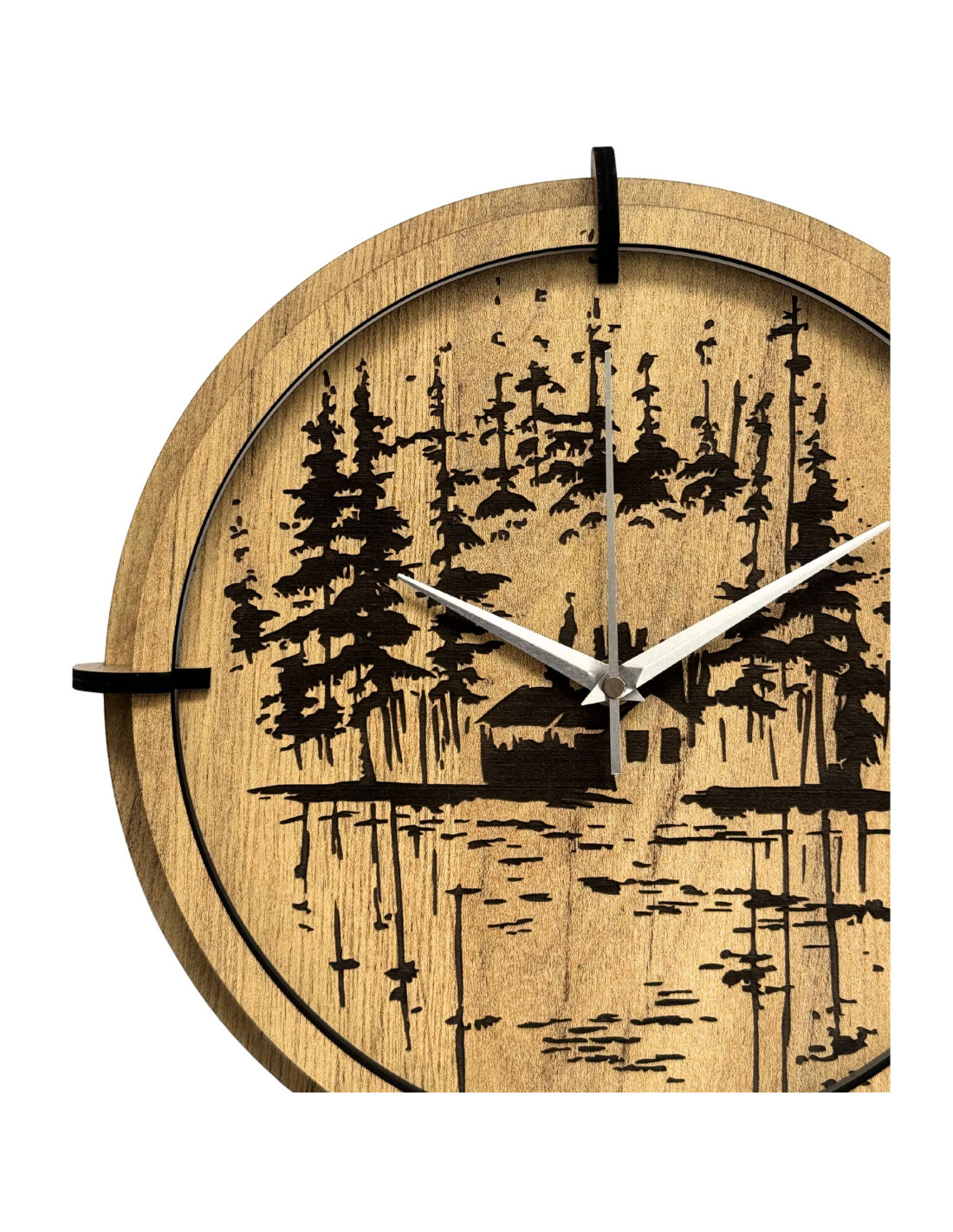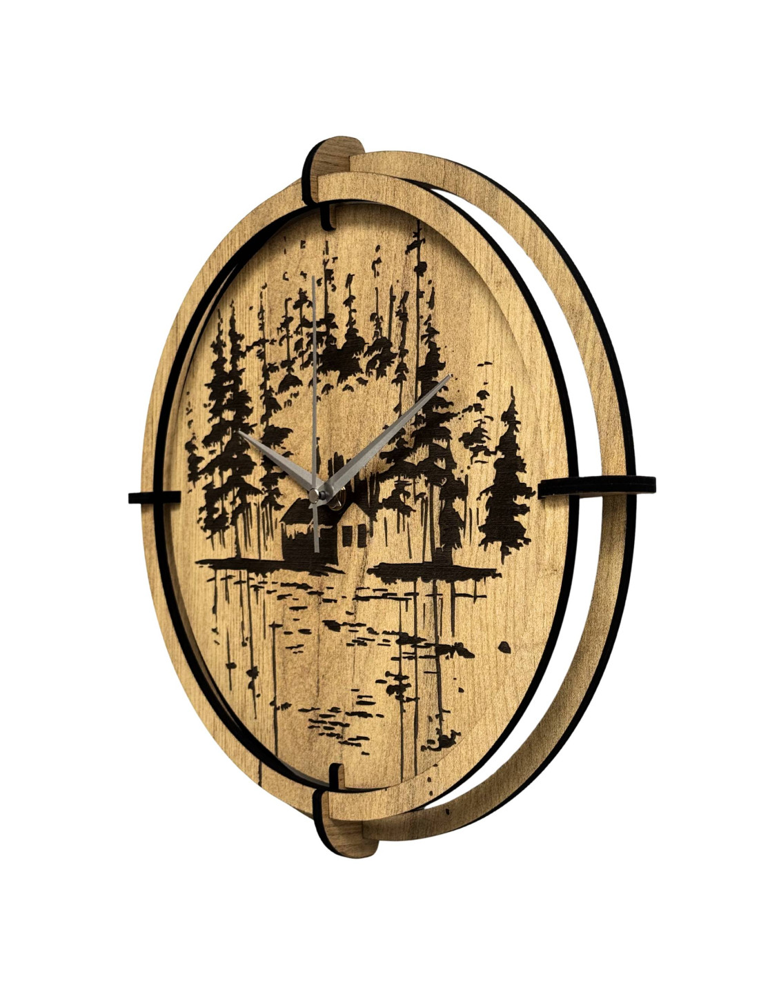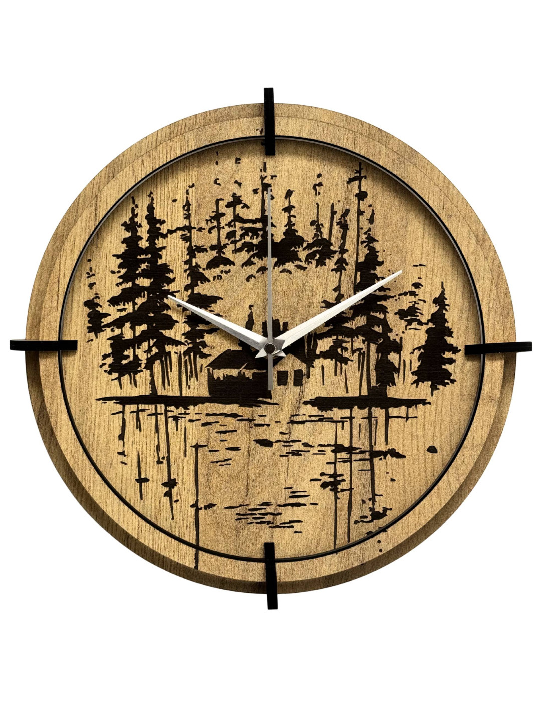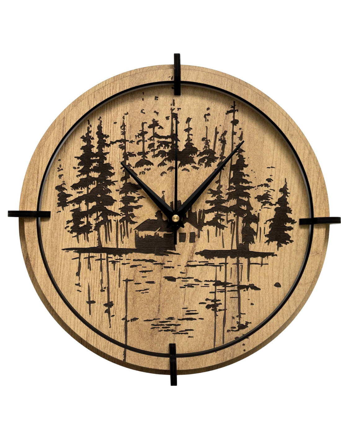 Modern wooden wall clocks with a precisely engraved motif of a forest cabin by the lake bring the peace of nature and the unique atmosphere of the forest into the interior.
