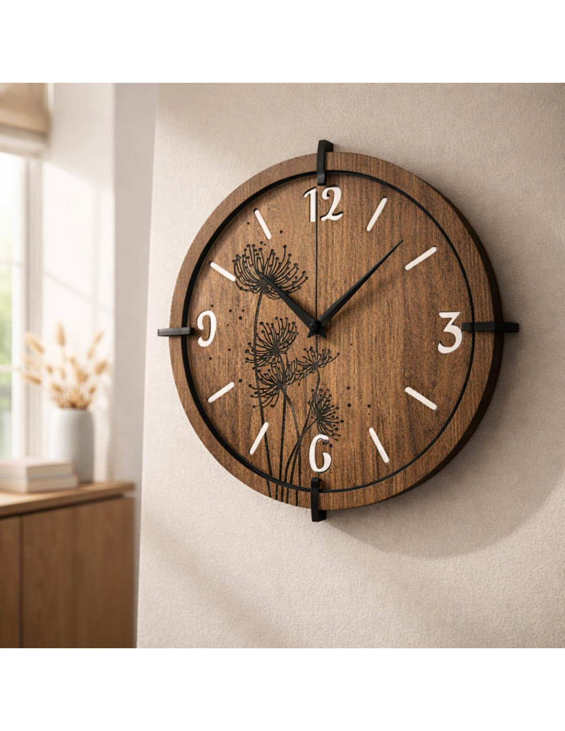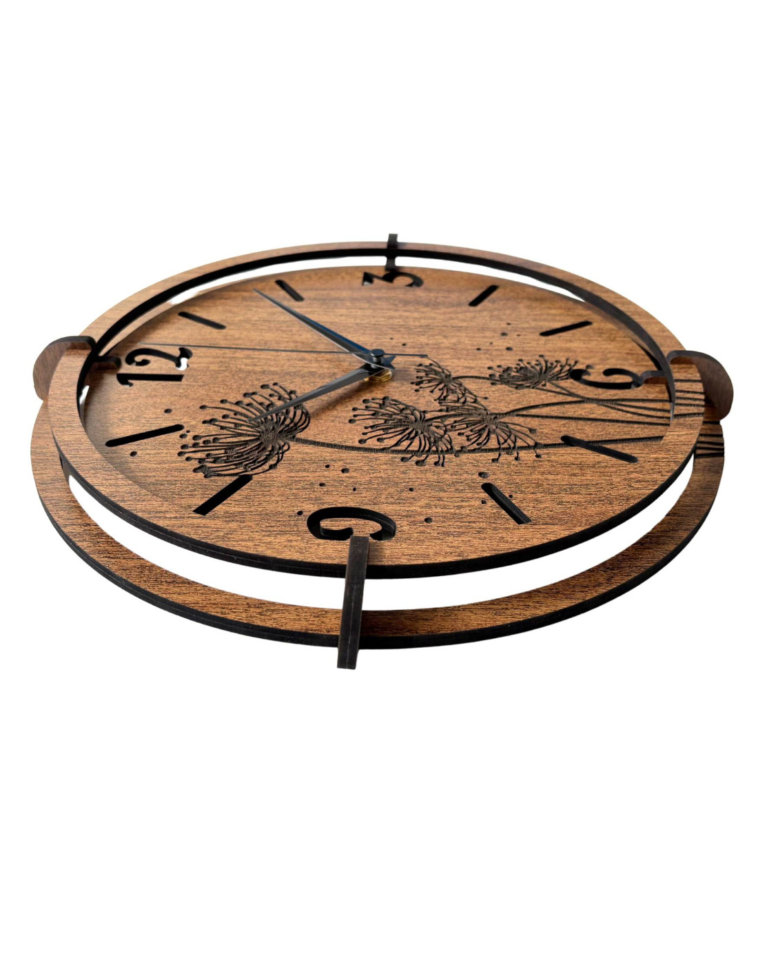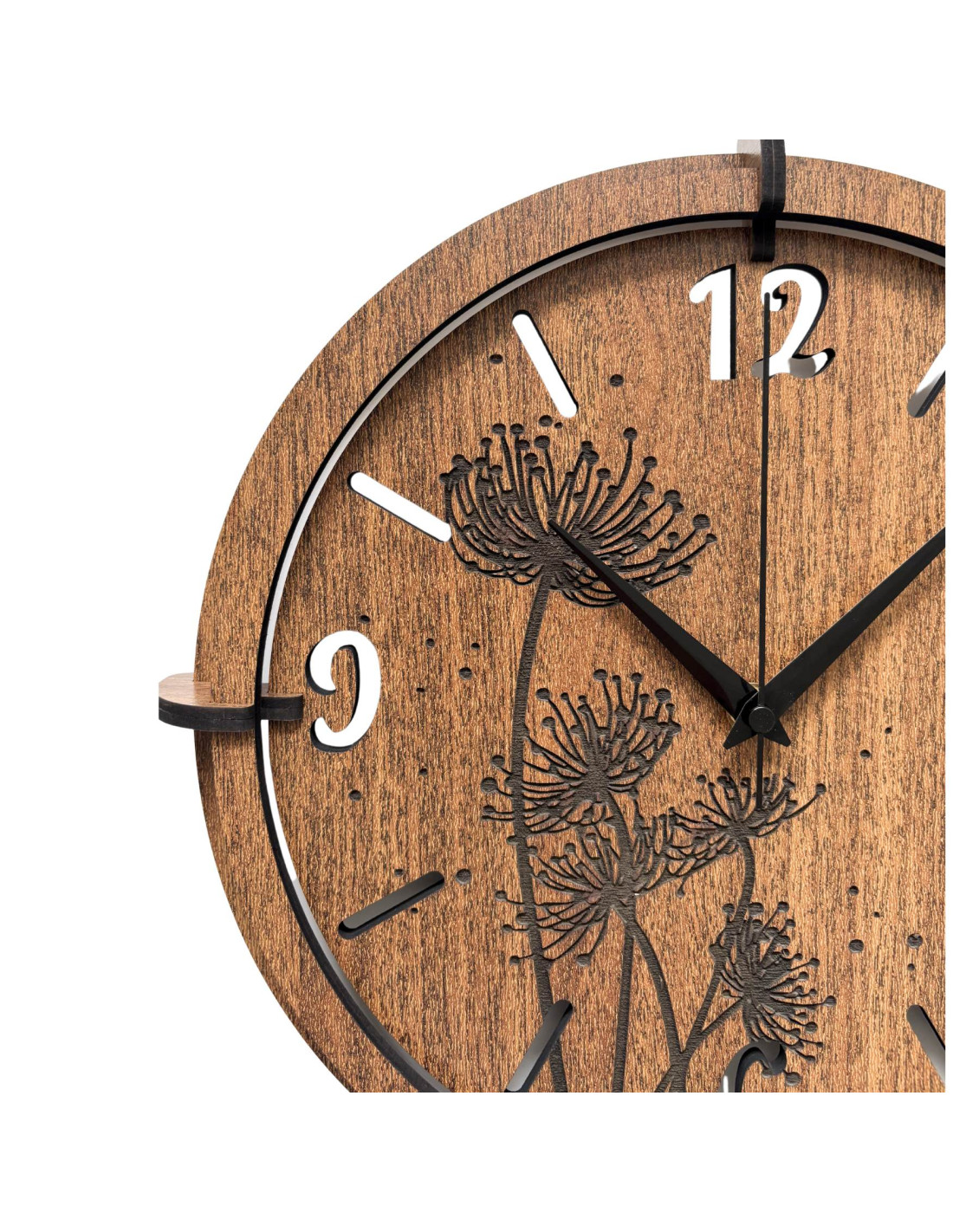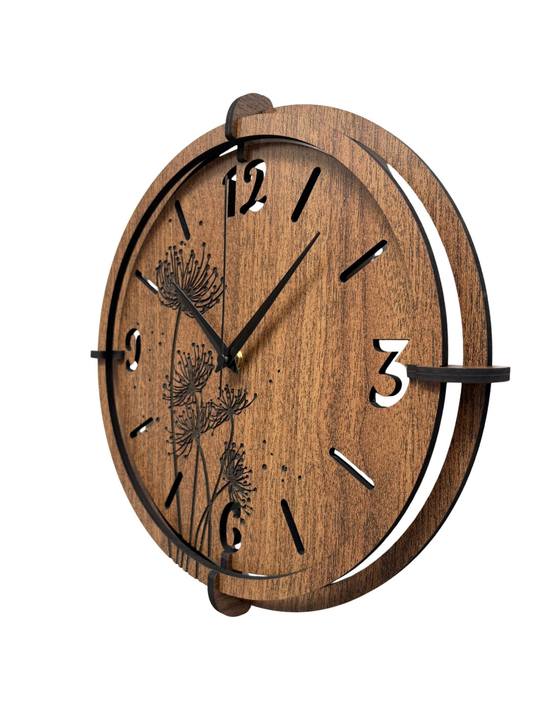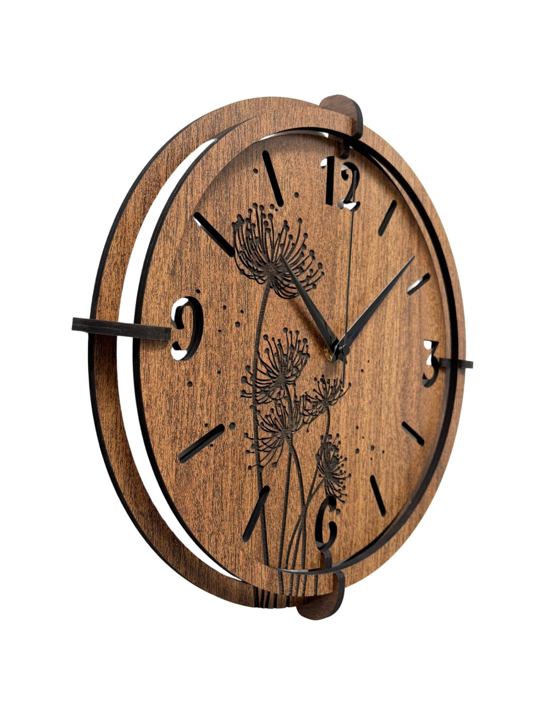 Made of high-quality HDF board (wenge/walnut) with a precisely carved dial and stylish hands.