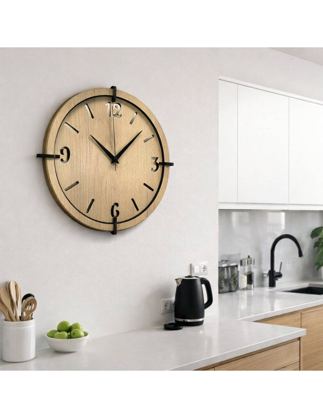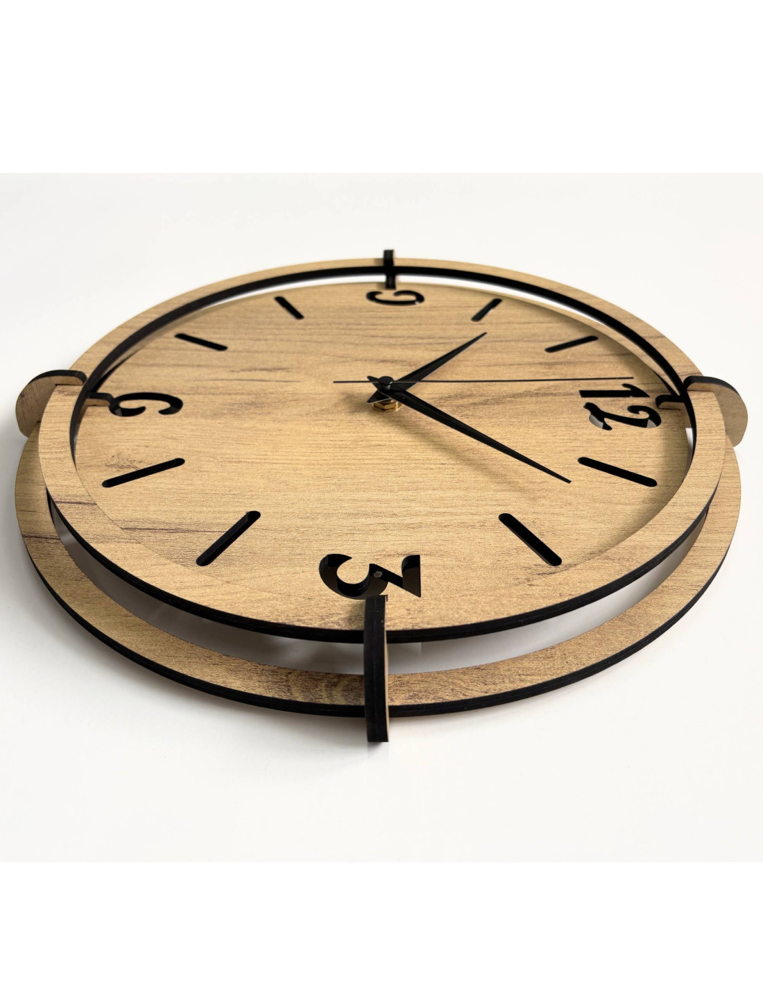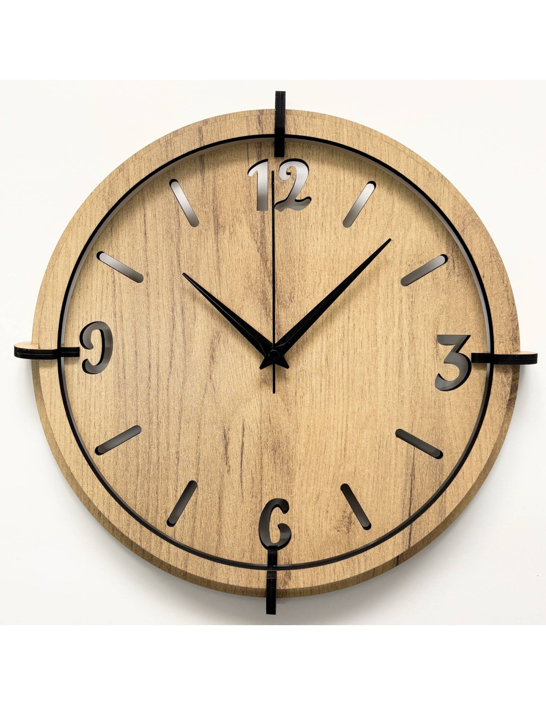 Modern wooden wall clocks in stylish oak decor with distinctive black elements will give the interior an elegant and timeless character.