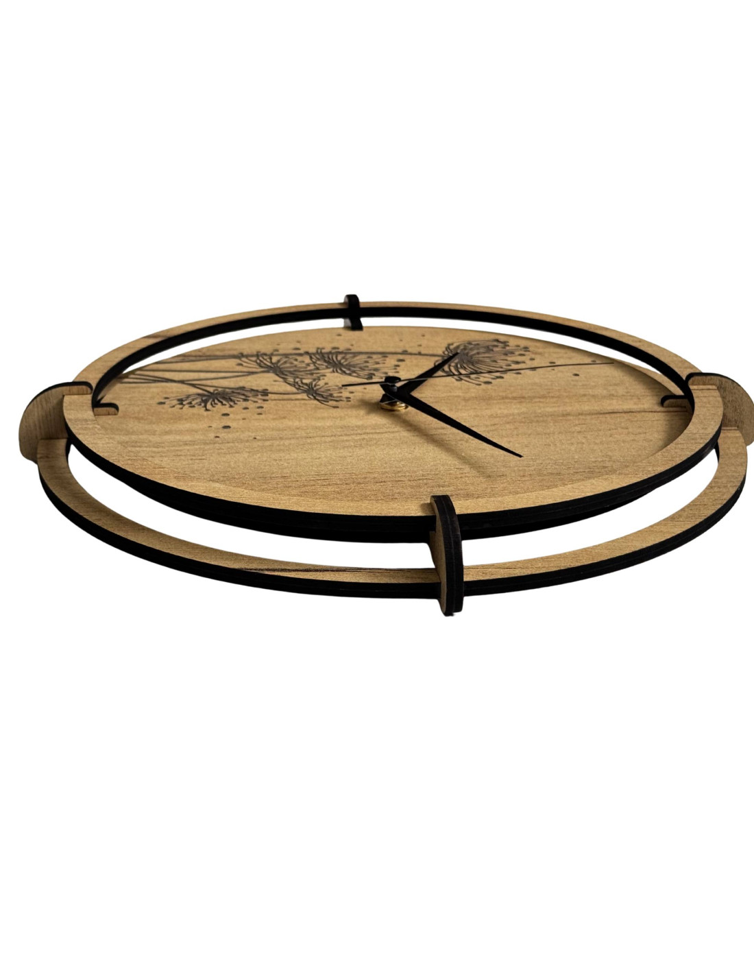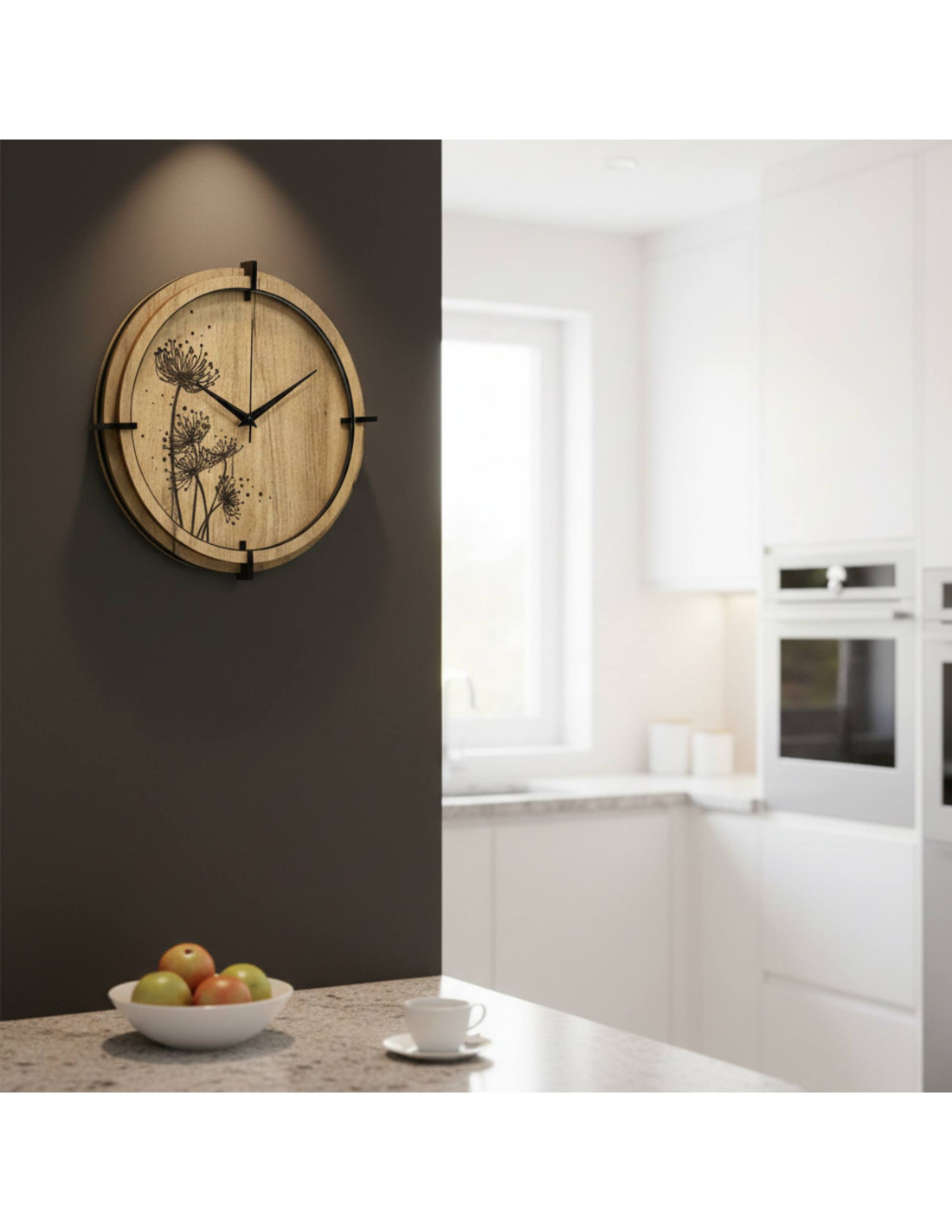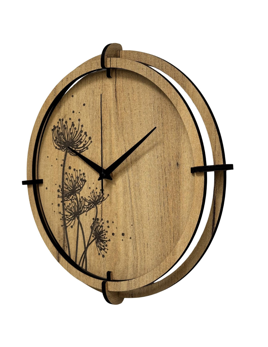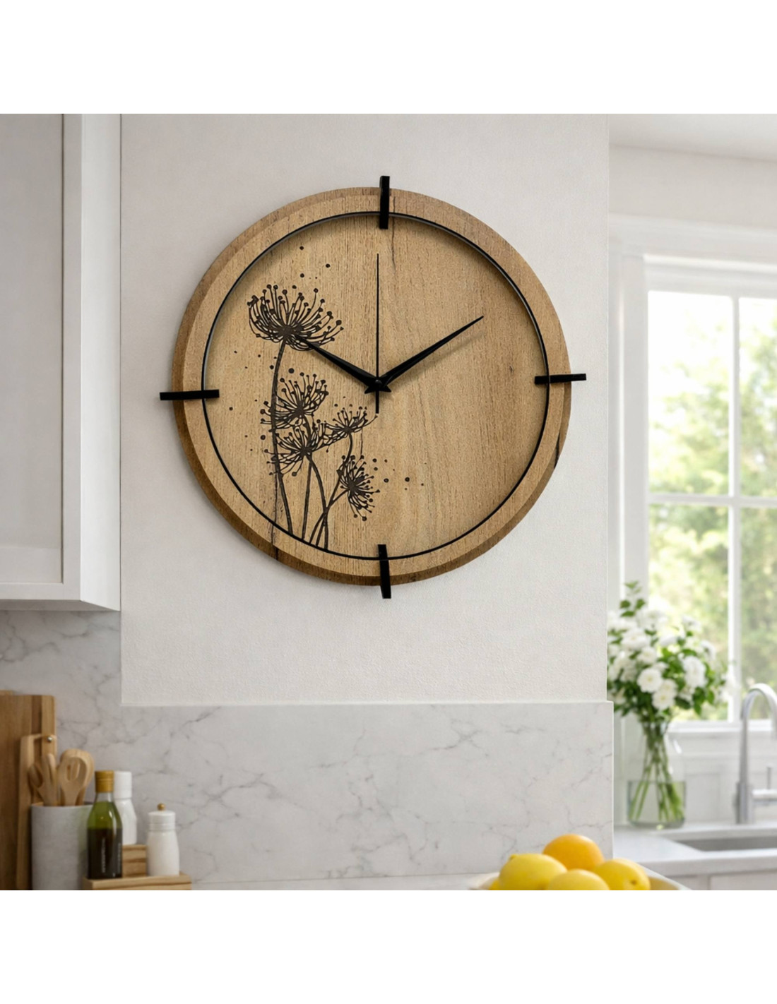Wooden clocks with engraved plant motifs combine the aesthetics of nature with precise timekeeping and the quiet operation of the mechanism.