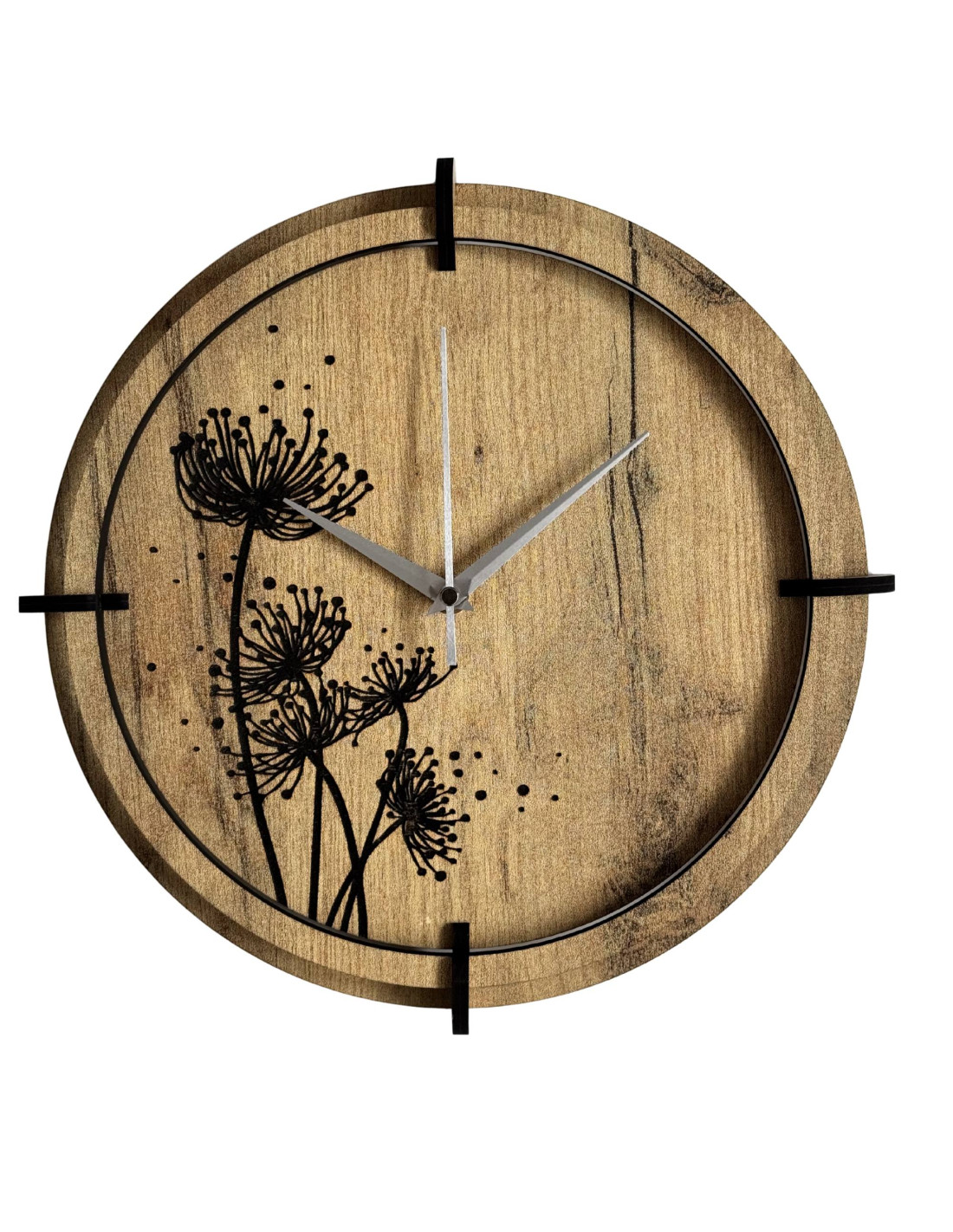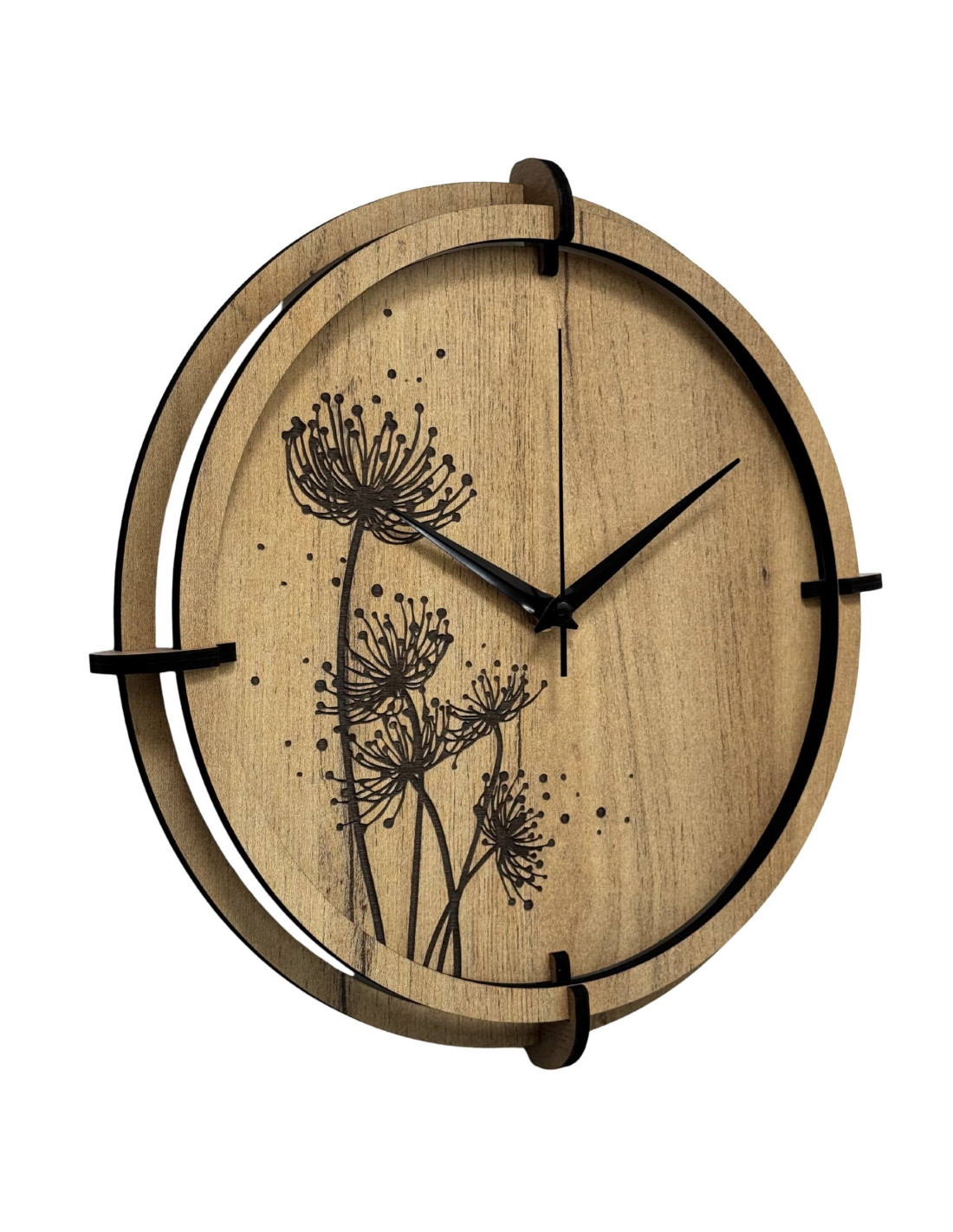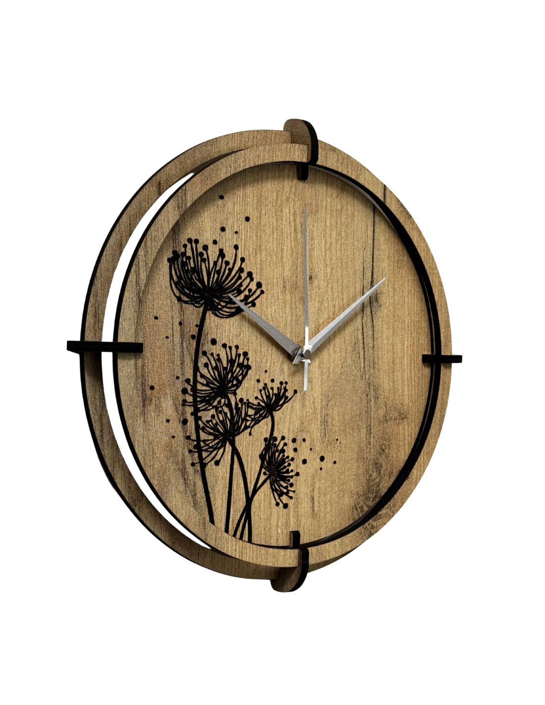 Wooden clocks with engraved plant motifs combine the aesthetics of nature with precise timekeeping and the quiet operation of the mechanism.