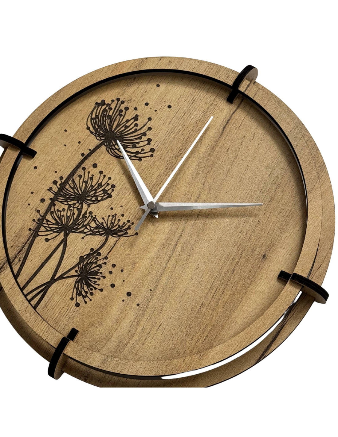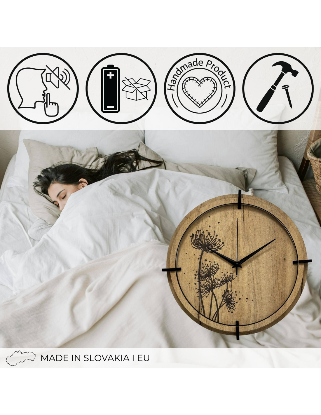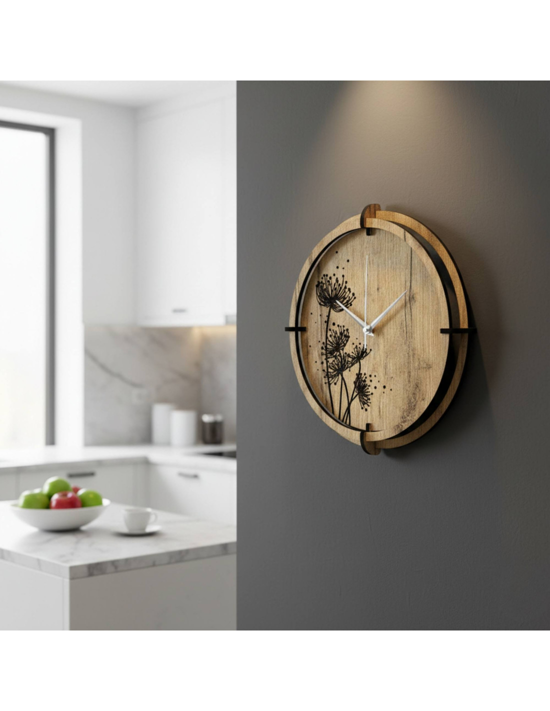 Wooden clocks with engraved plant motifs combine the aesthetics of nature with precise timekeeping and the quiet operation of the mechanism.