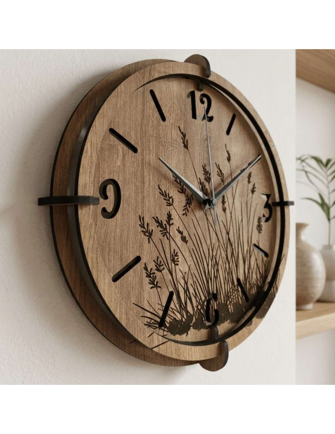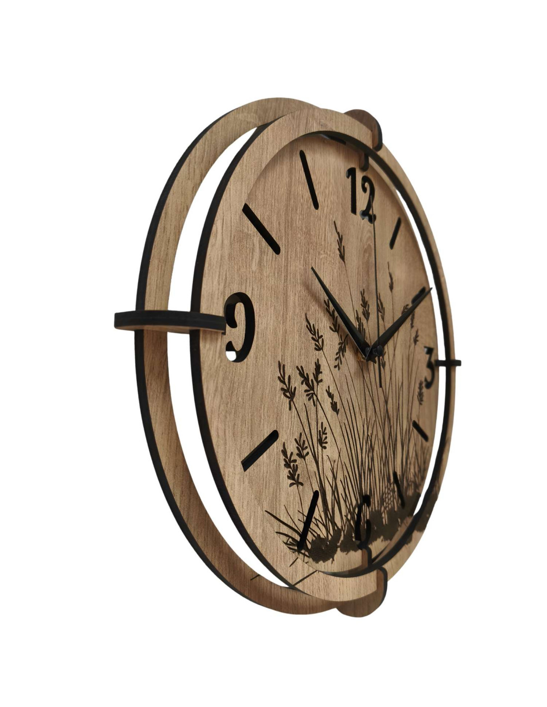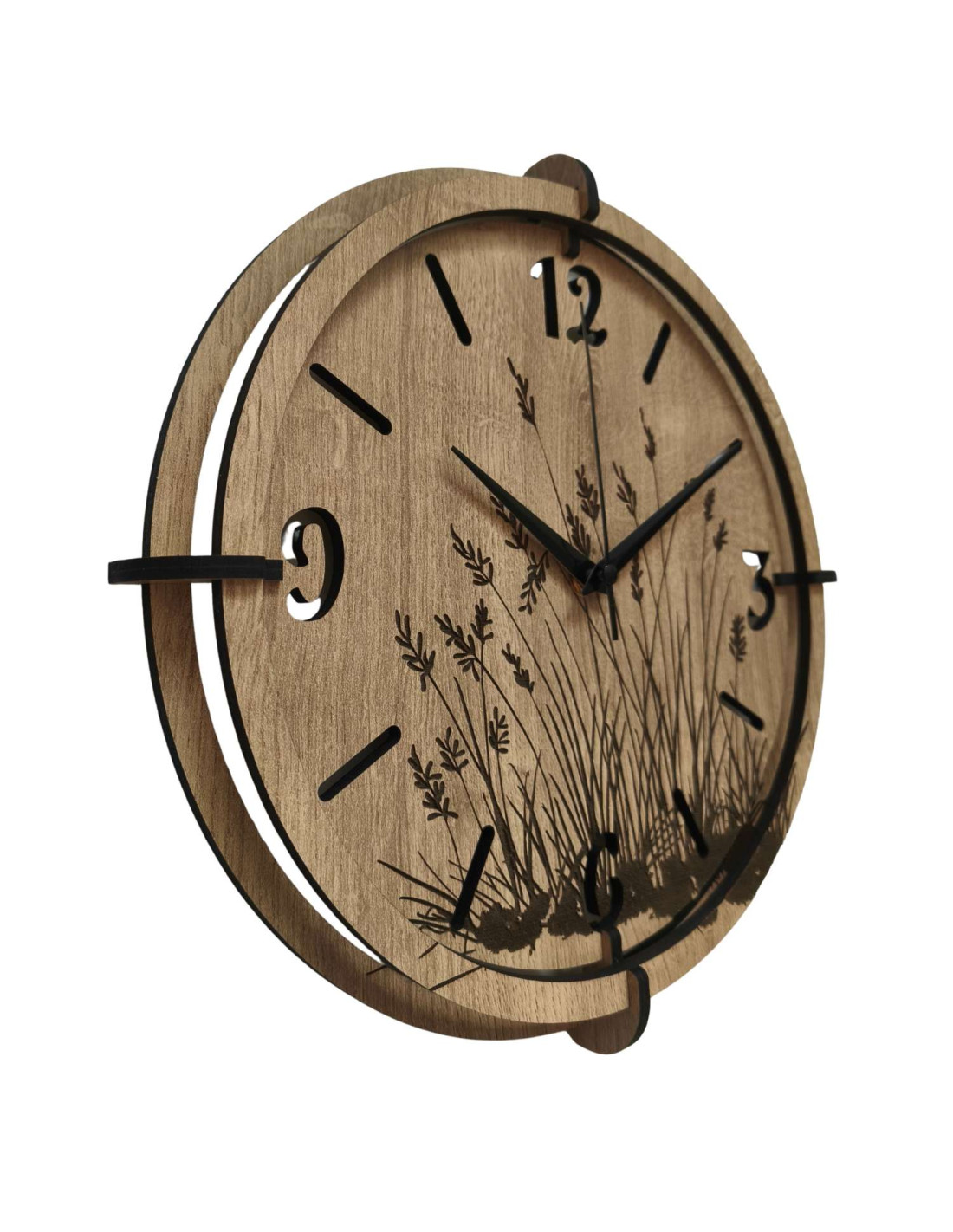 Modern wooden wall clocks with a delicate engraved motif of meadow grasses bring peace and harmony to the interior.