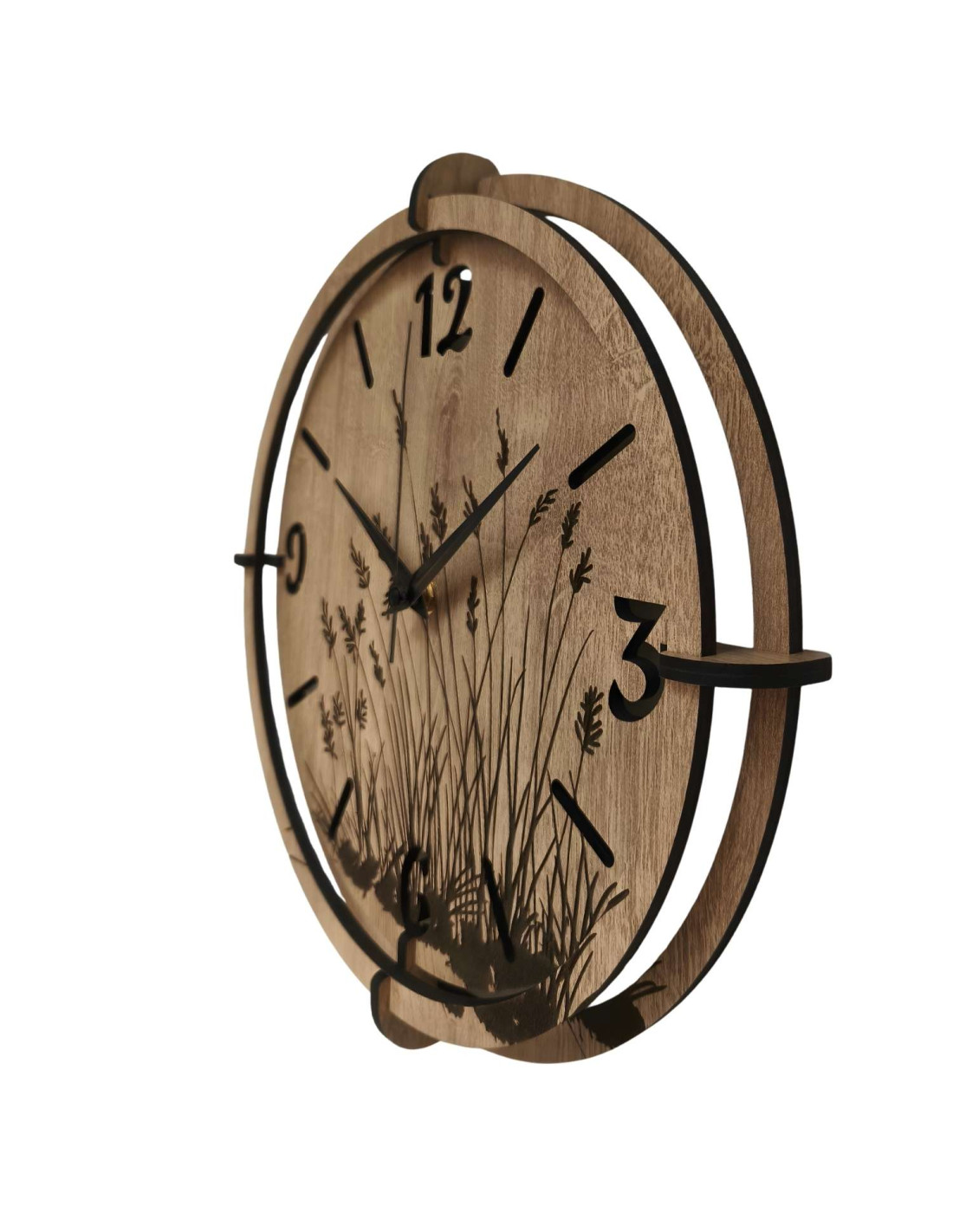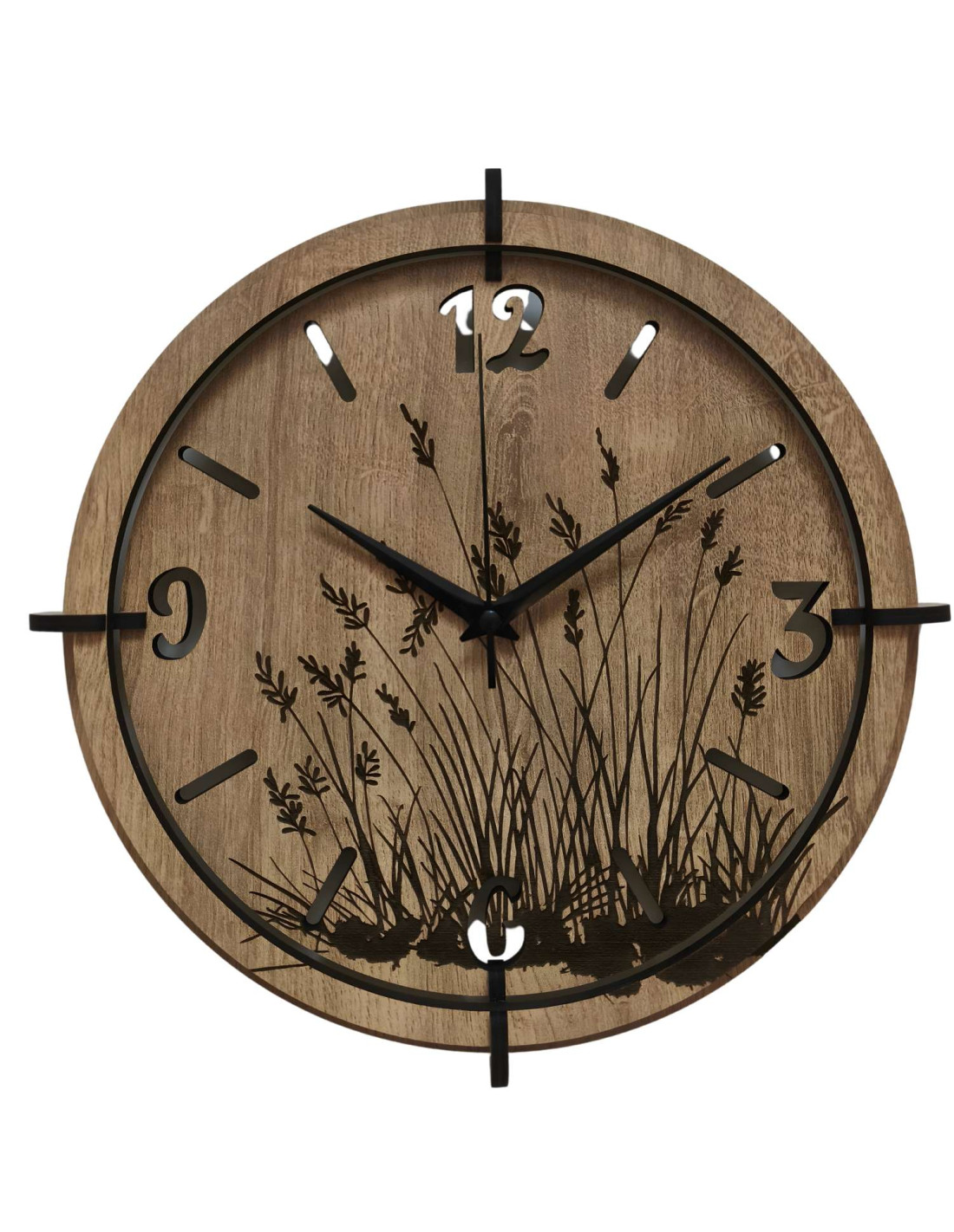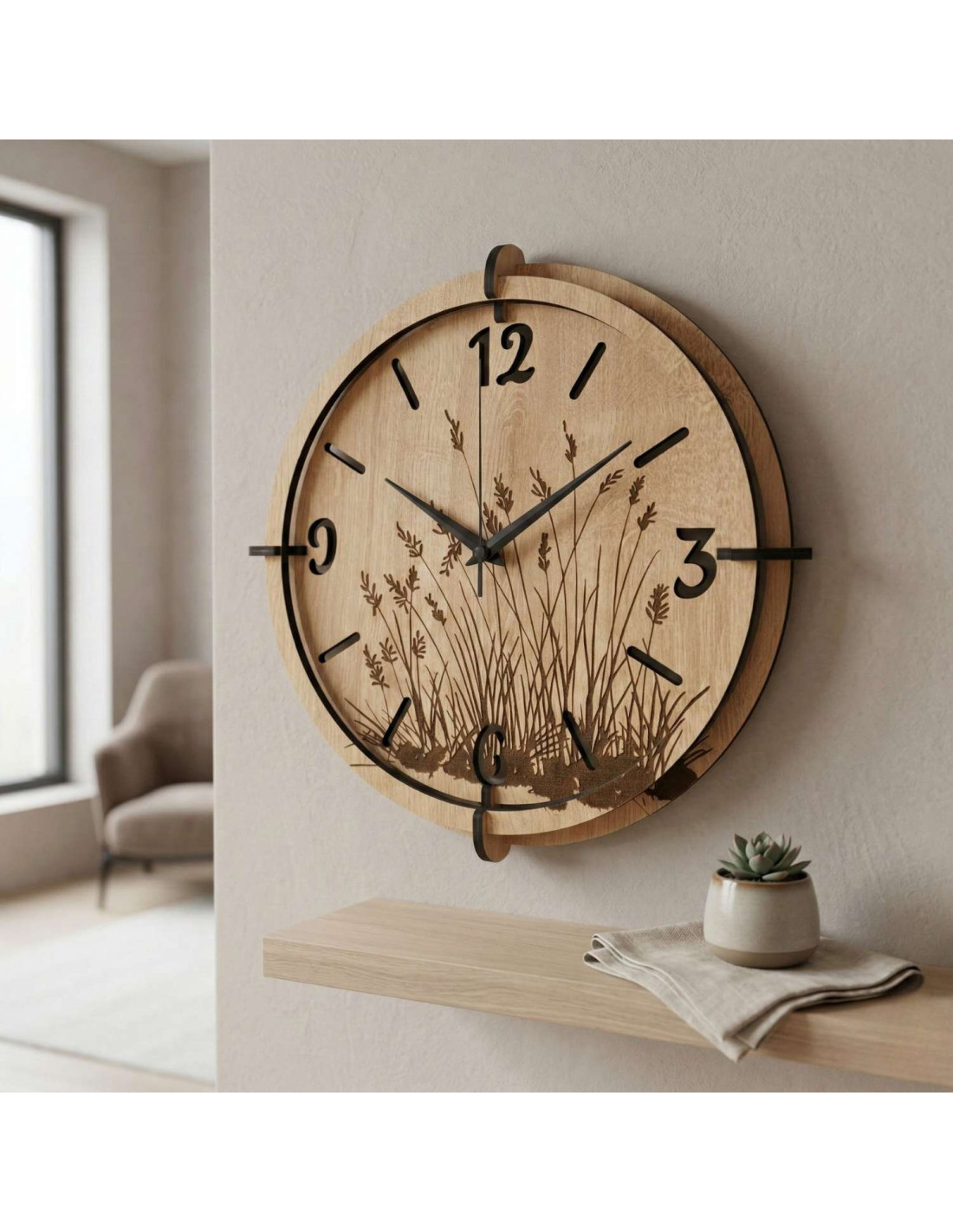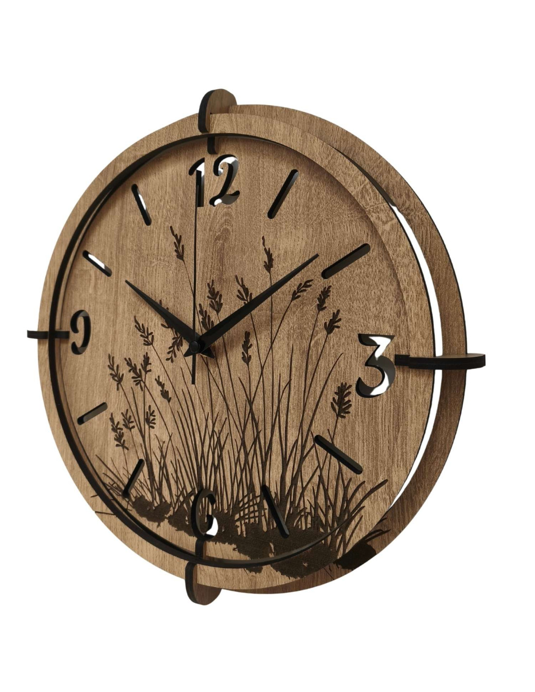 Modern wooden wall clocks with a delicate engraved motif of meadow grasses bring peace and harmony to the interior.