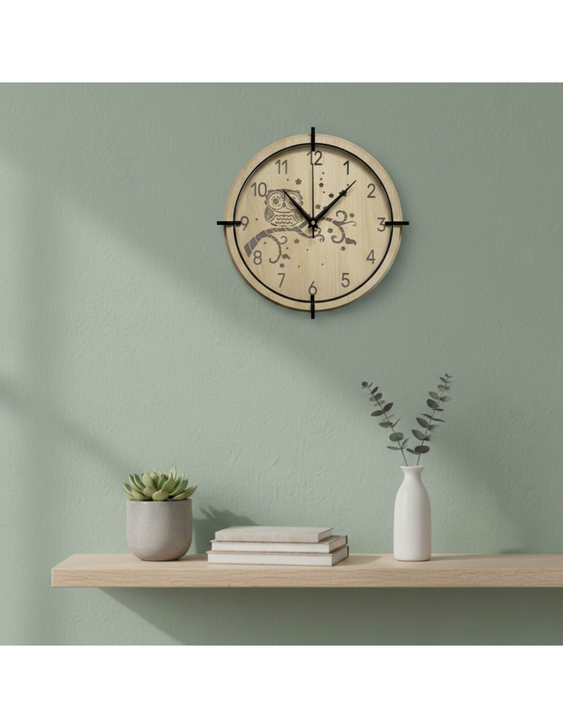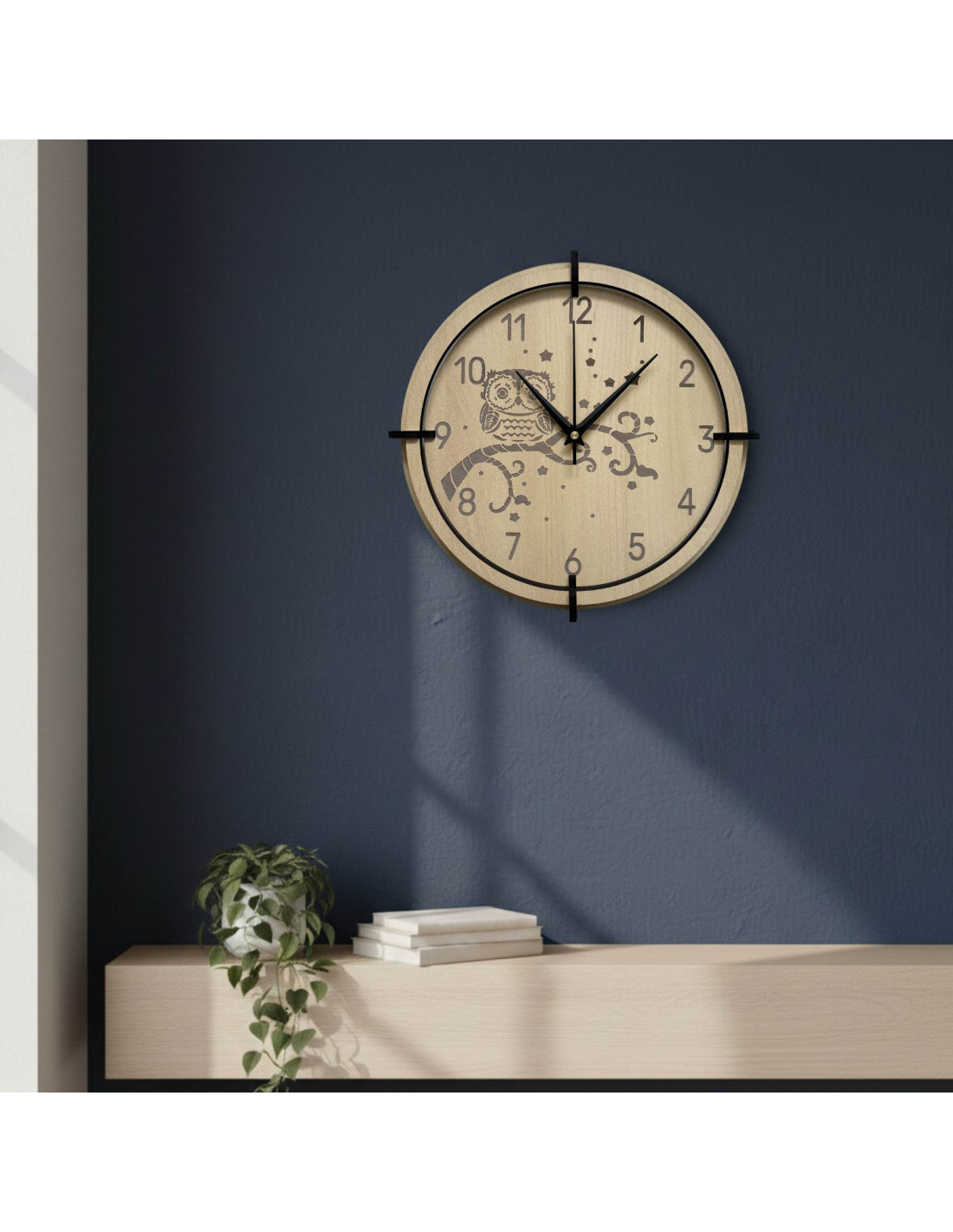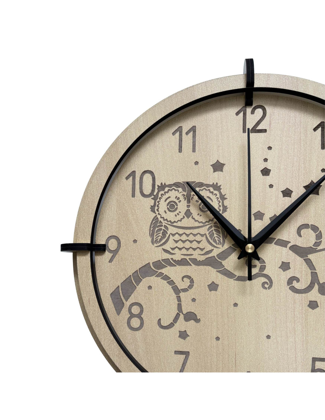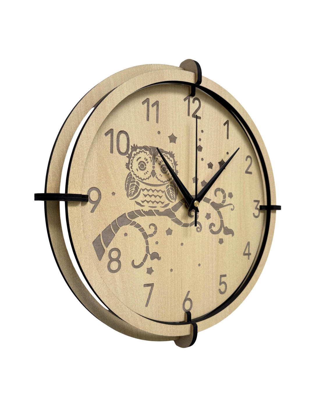 Modern wooden maple wall clock with a delicate engraved owl motif for children brings peace and harmony to the interior.
