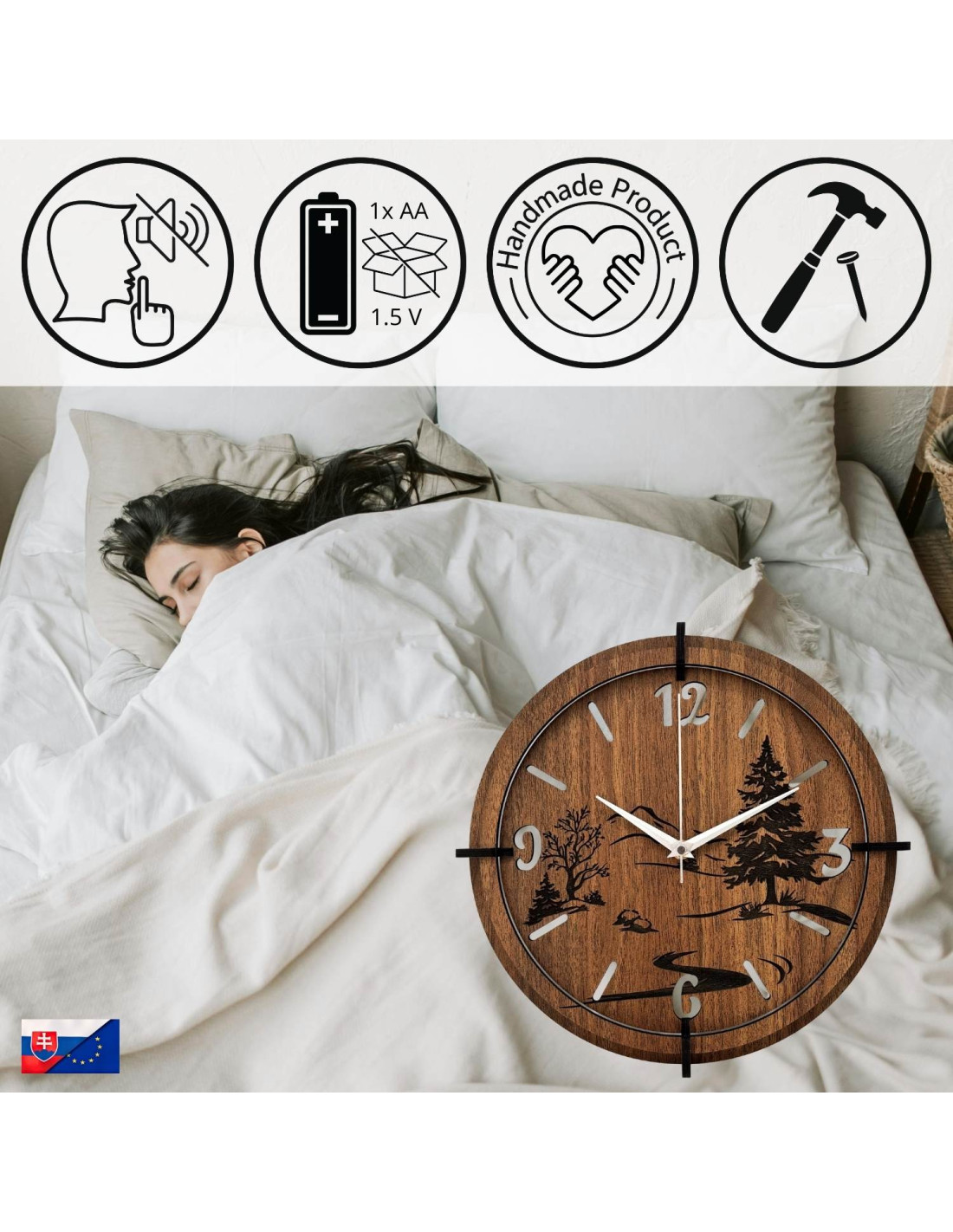 Modern wooden wall clock with a panoramic 3D motif of a forest and mountains brings the power of nature and a sense of freedom into the interior.