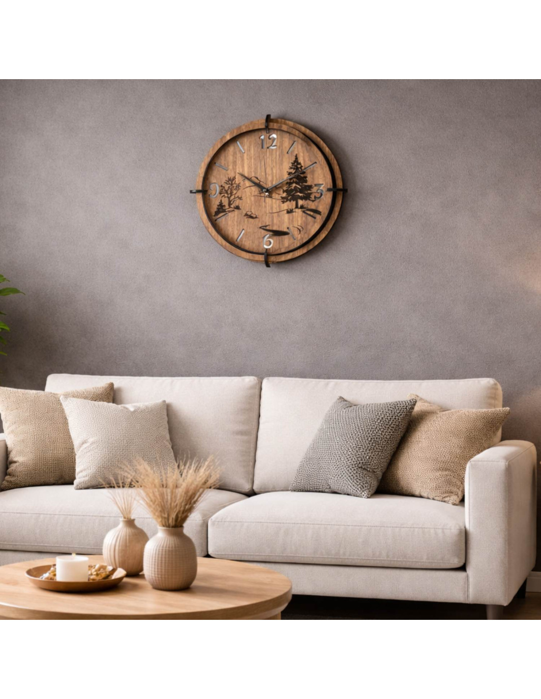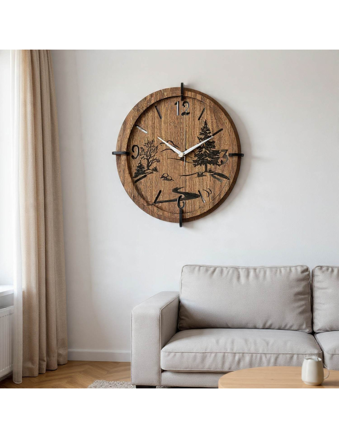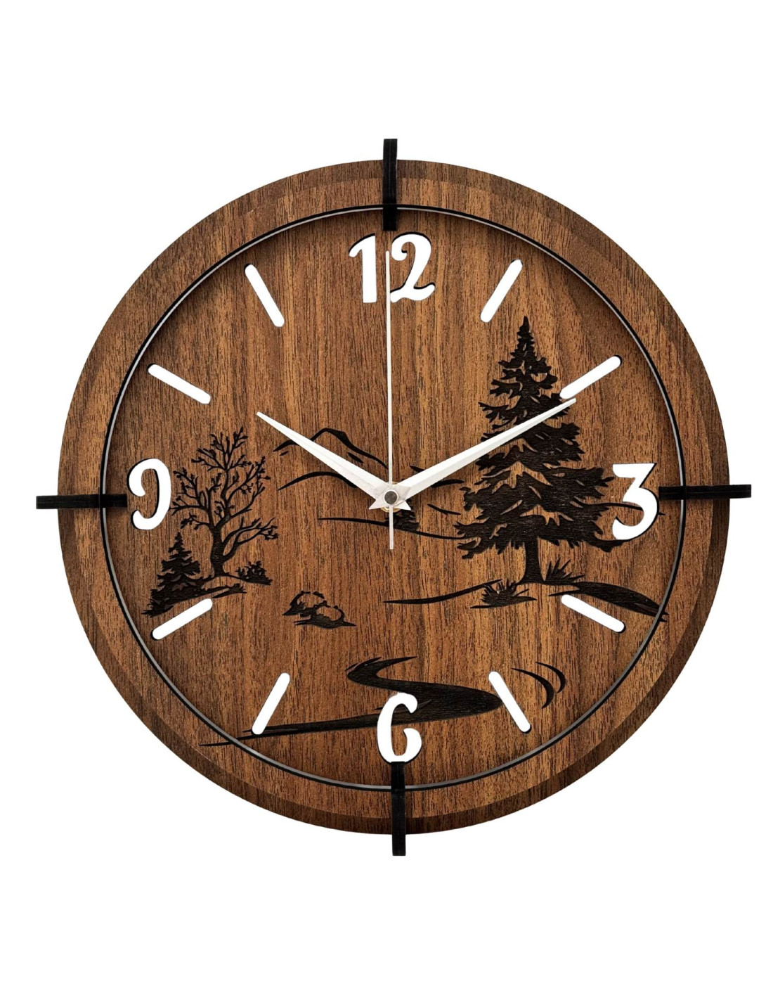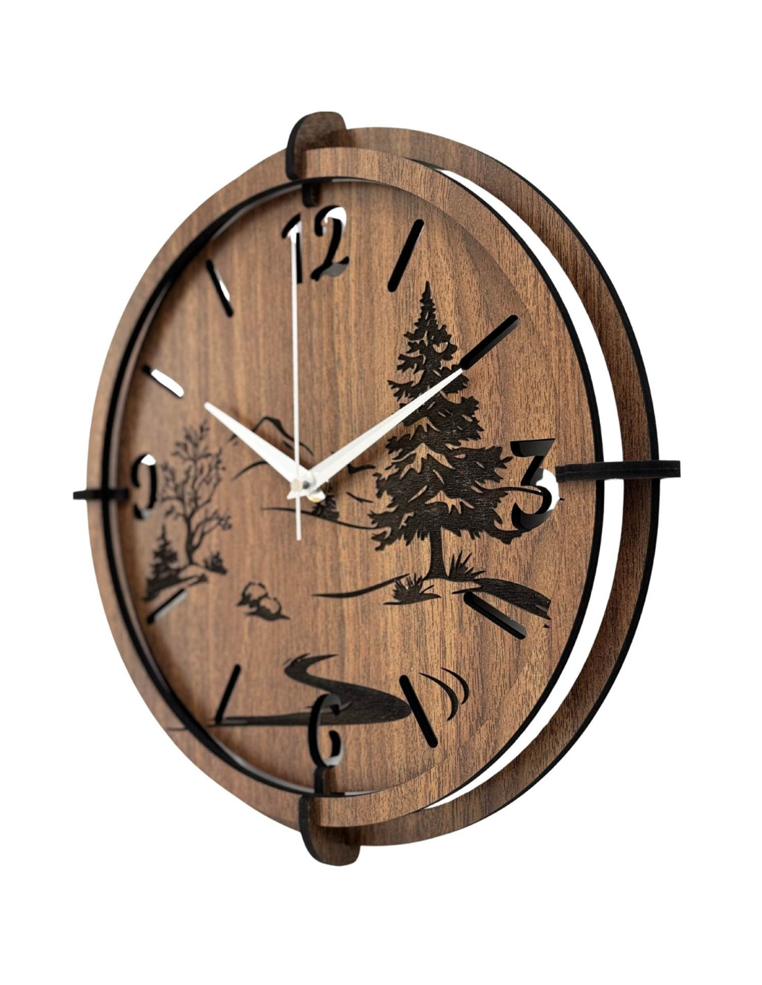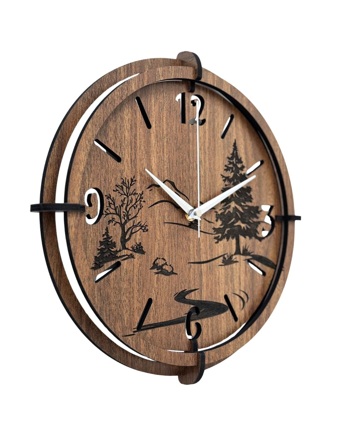 Designer wooden wall clock with a panoramic 3D motif of mountain nature and forest.