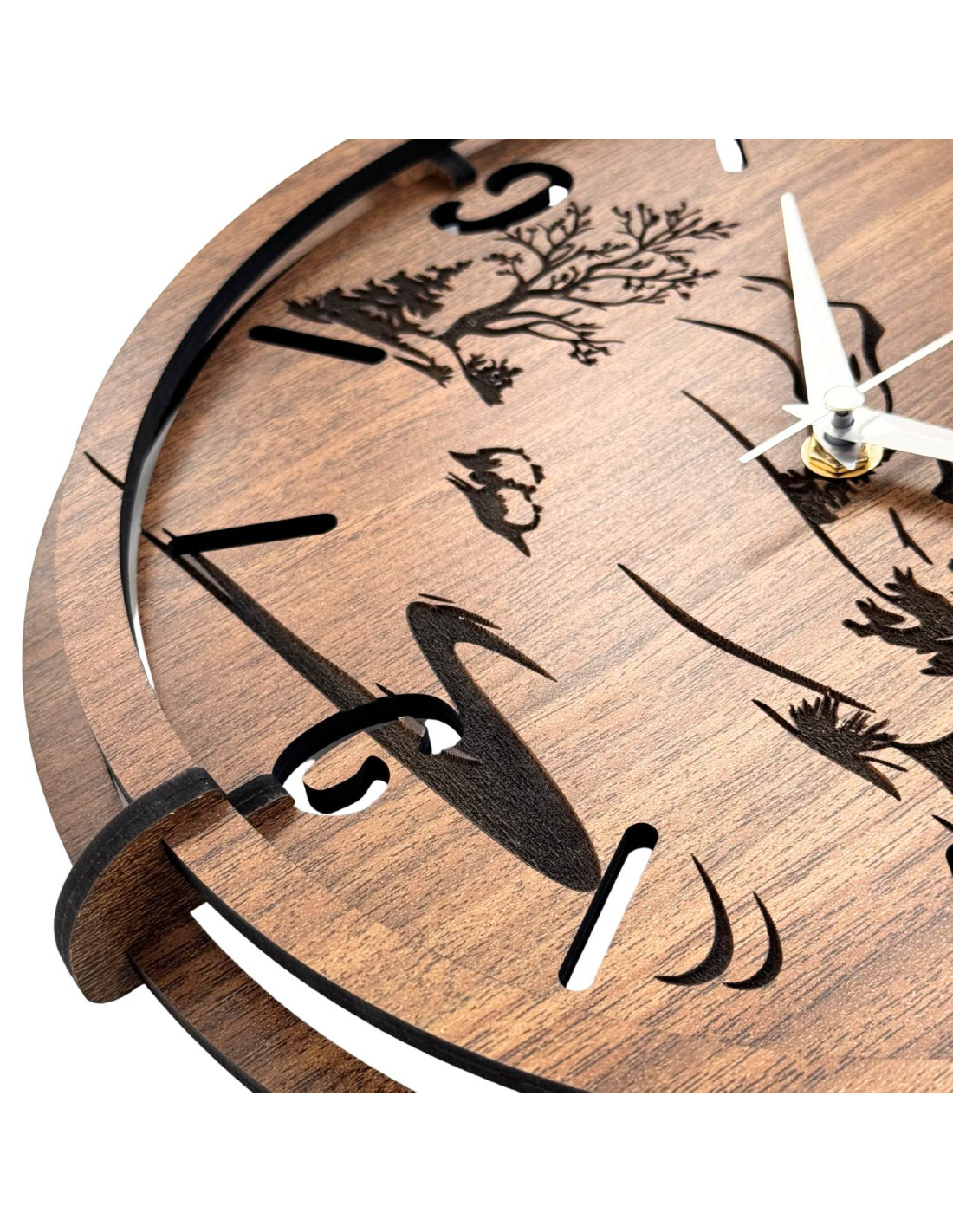 Wooden clocks with detailed panorama engravings combine the rugged aesthetics of wild nature with precise timekeeping and a silent mechanism.