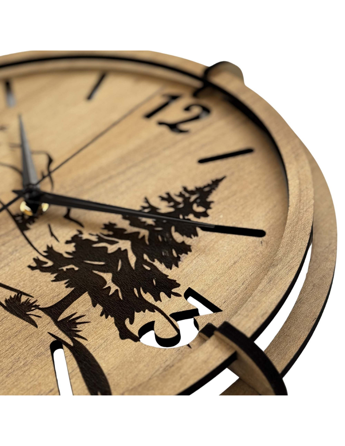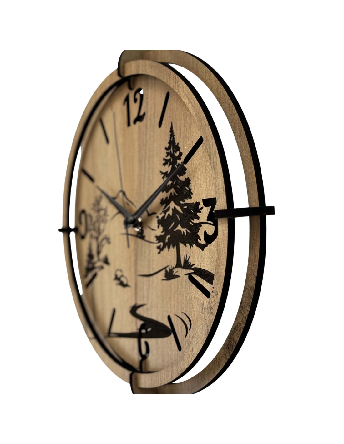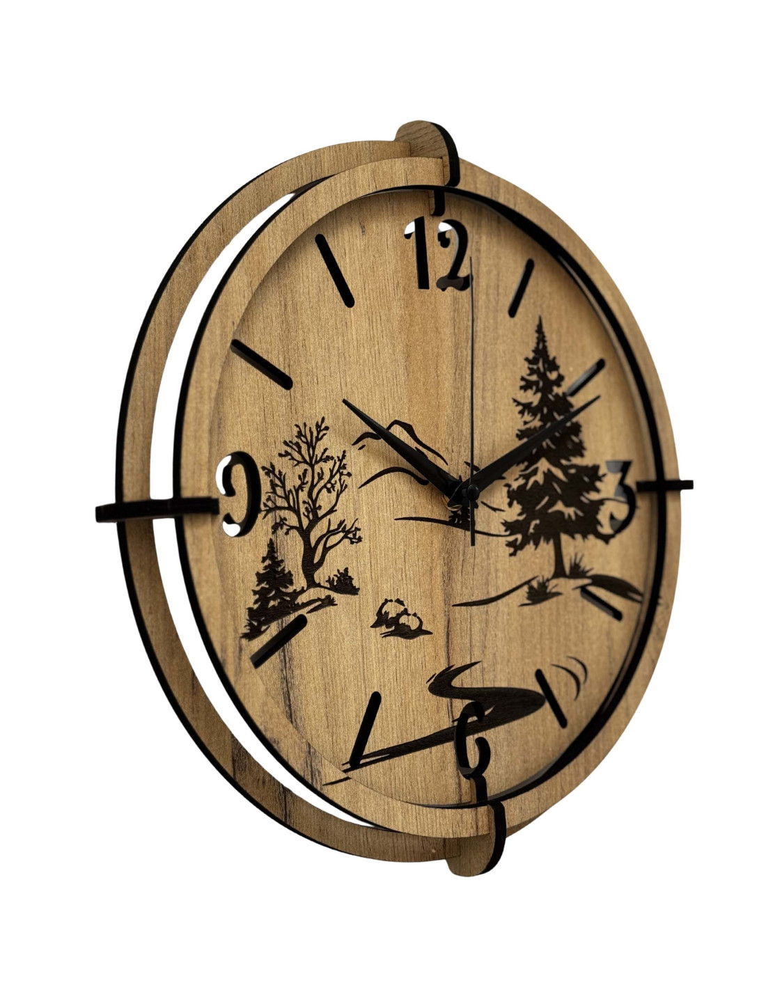 The detailed design depicts a dominant evergreen tree, delicate tree silhouettes, a mountain horizon and a winding river , carved into high-quality HDF board with HDF GOLD OAK decor, which gives the clock a warm and natural look.