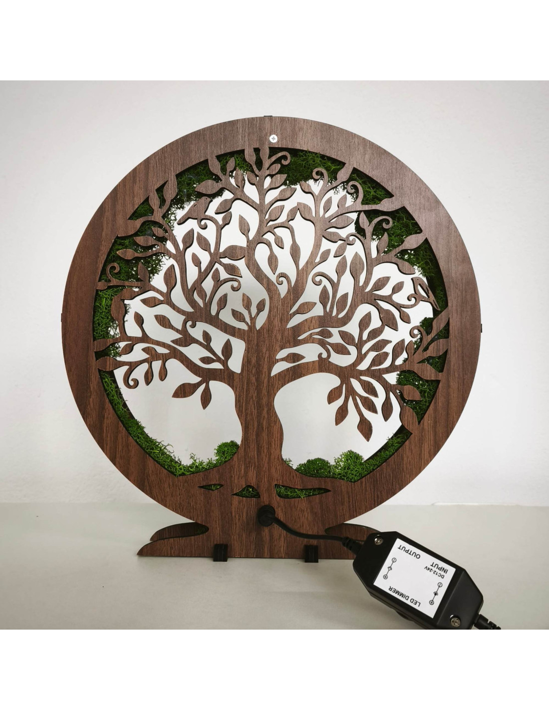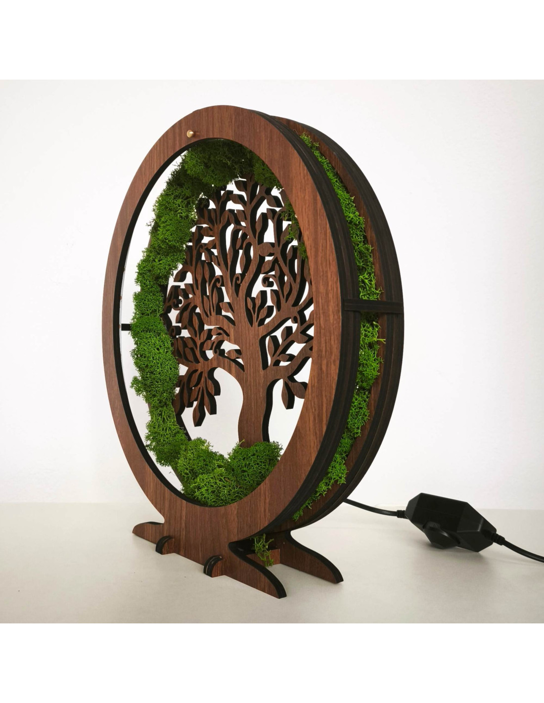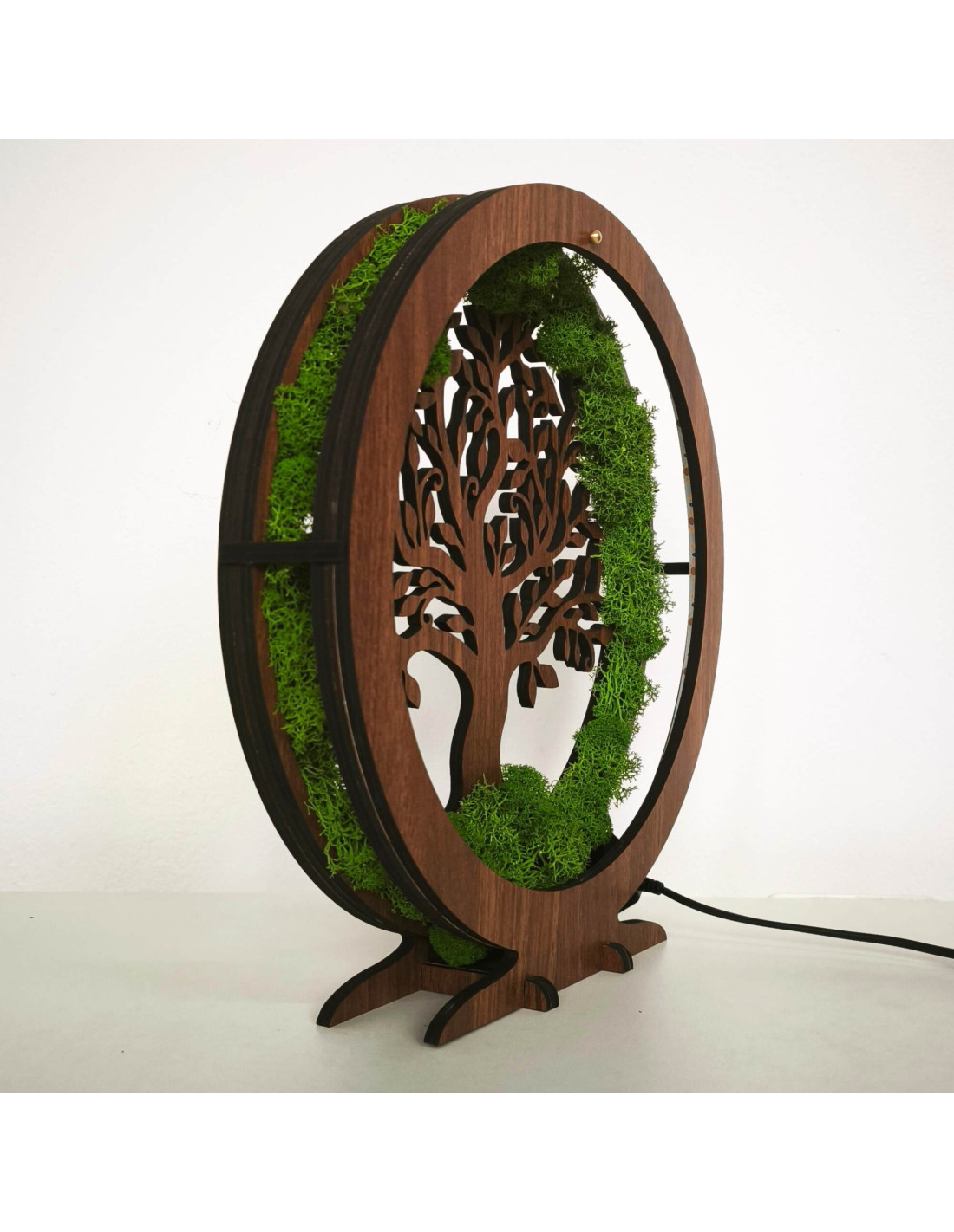It is made of 15 mm thick HDF board in walnut wenge color and complemented by stabilized moss , which is placed around the perimeter and creates a unique natural effect.