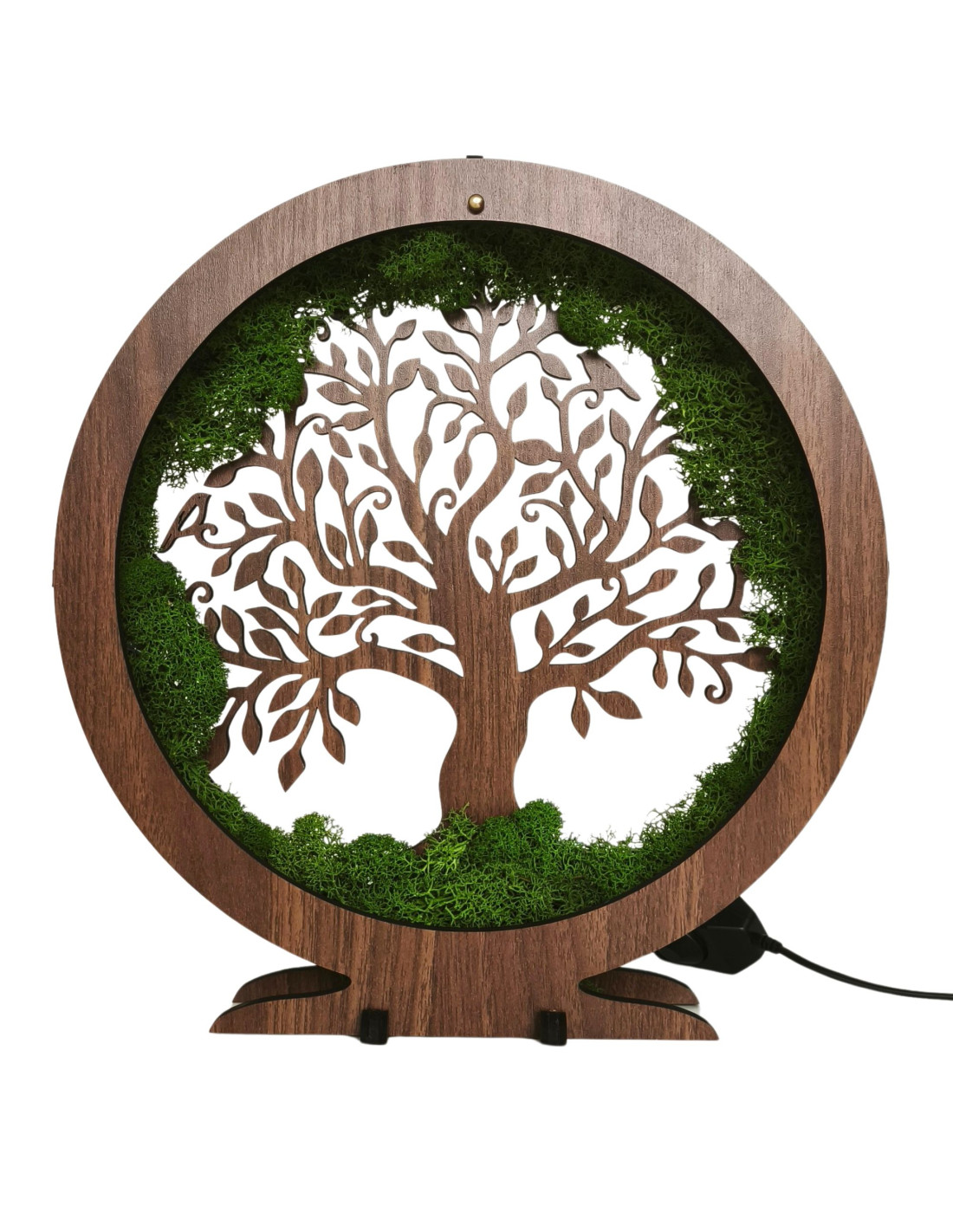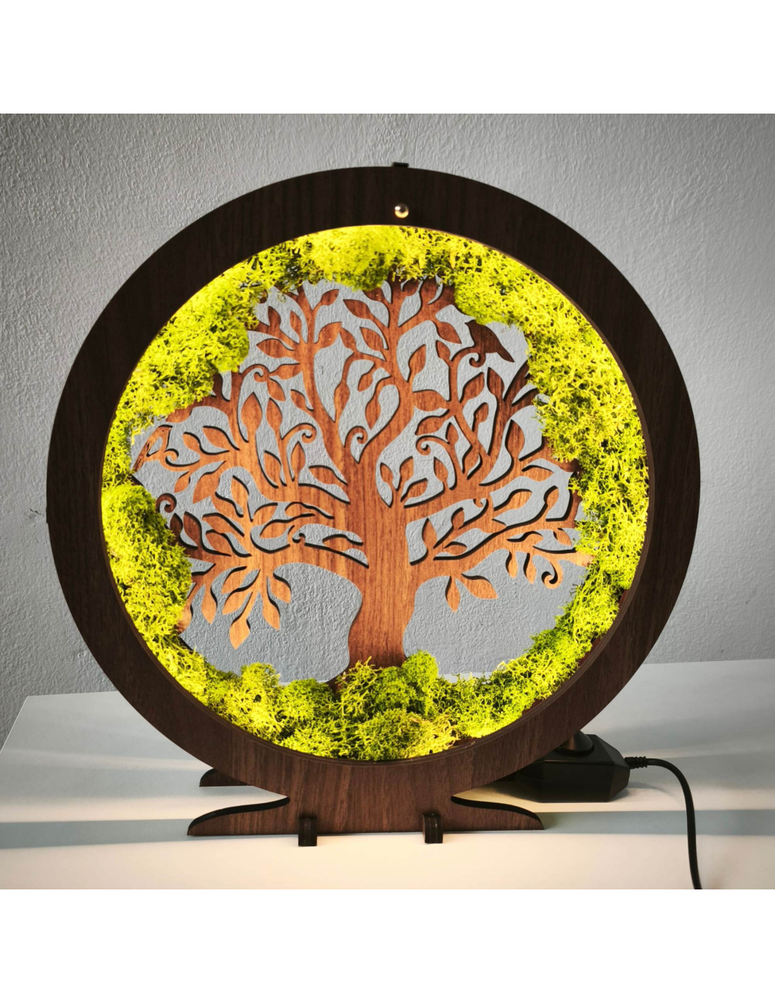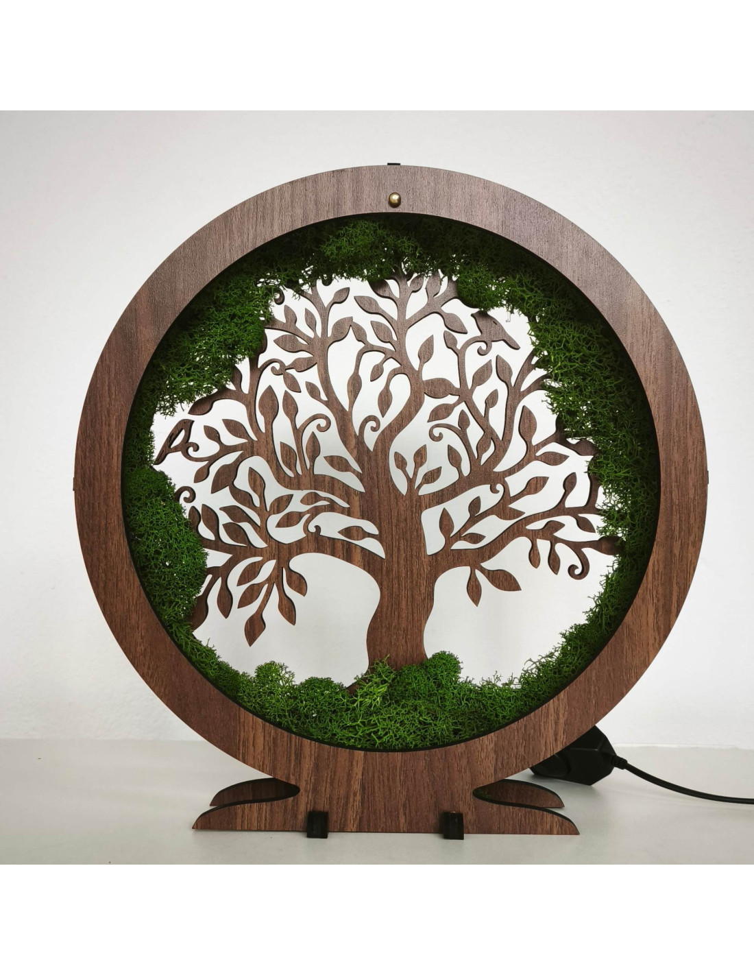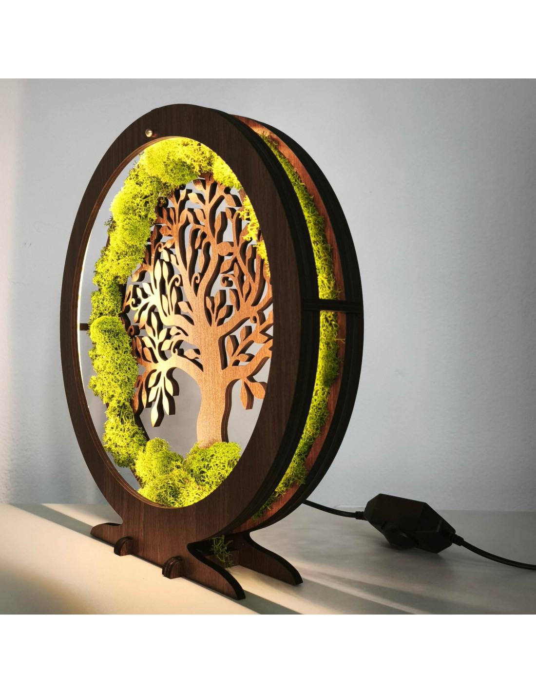 It is made of 15 mm thick HDF board in walnut wenge color and complemented by stabilized moss , which is placed around the perimeter and creates a unique natural effect.