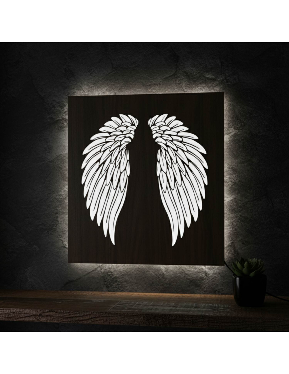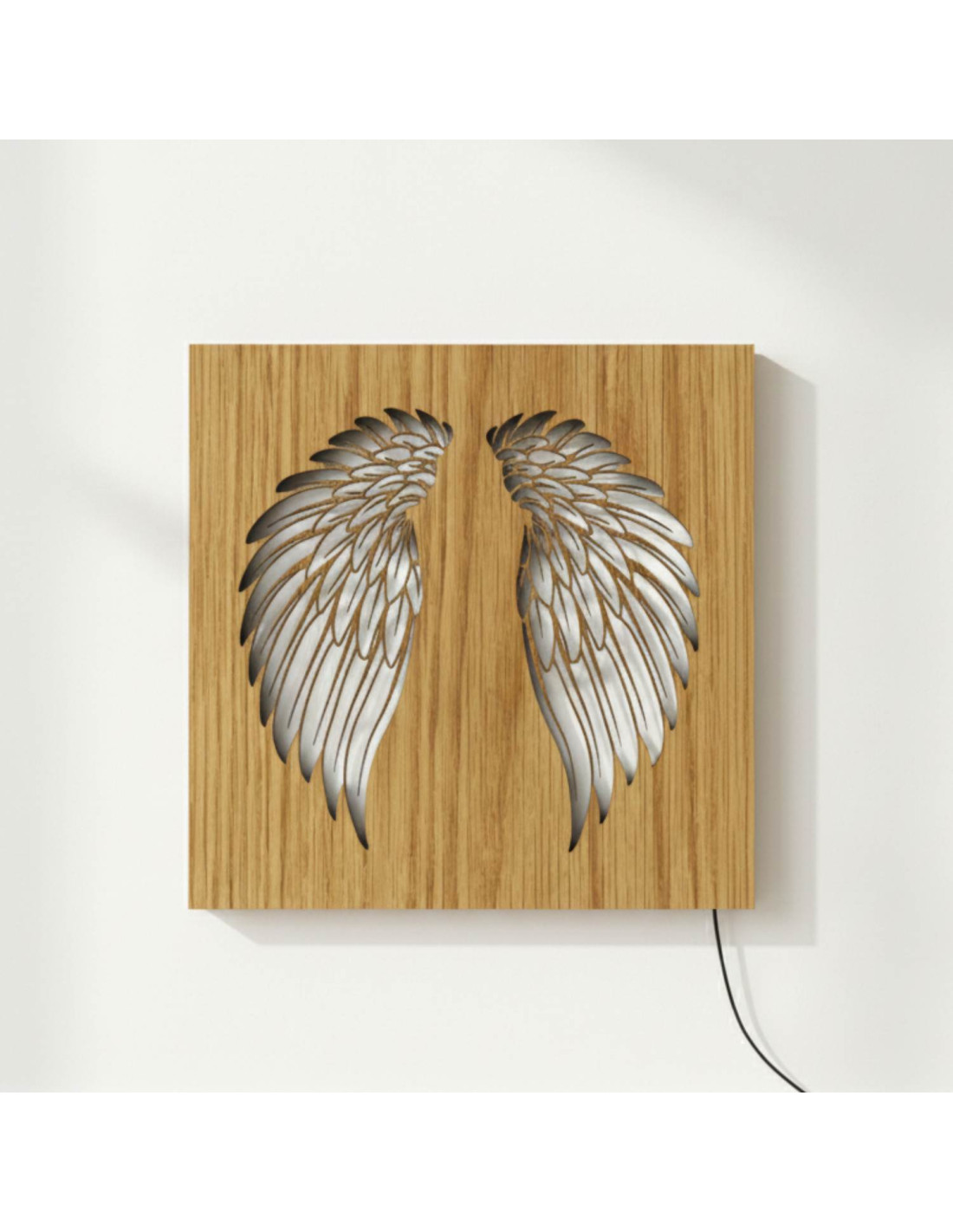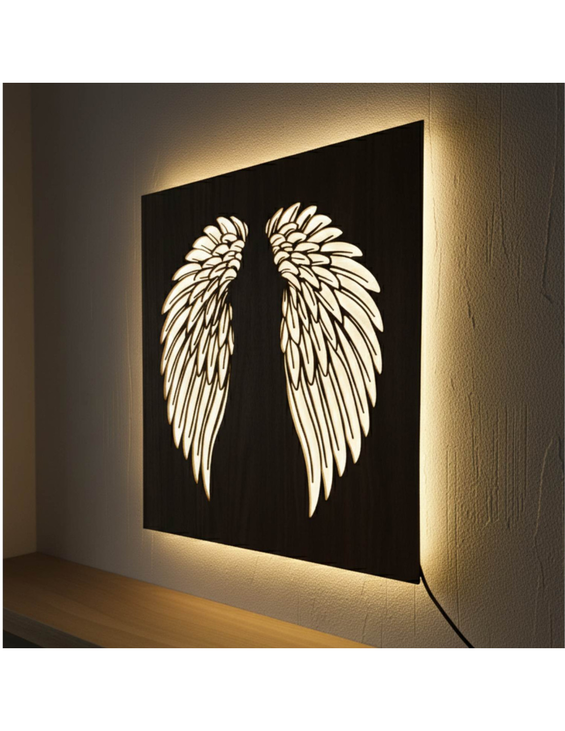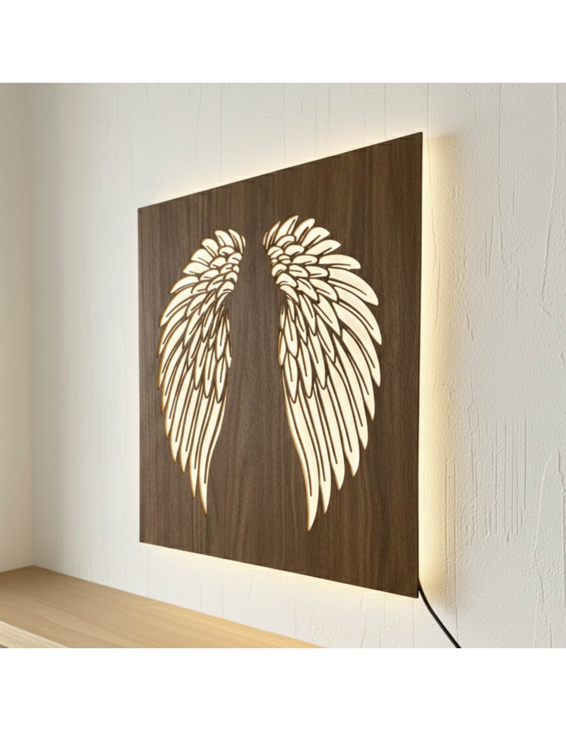 The original backlit wooden painting - angel wings combines the natural beauty of wood, modern design and subtle LED lighting into a unique work of art. This elegant piece brings a sense of peace, light and harmony to the space, making every interior cozy - from living rooms and bedrooms to representative office spaces .
