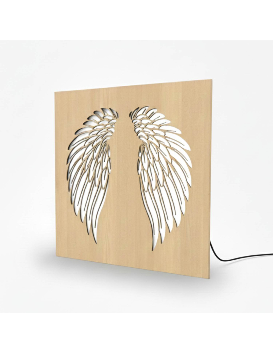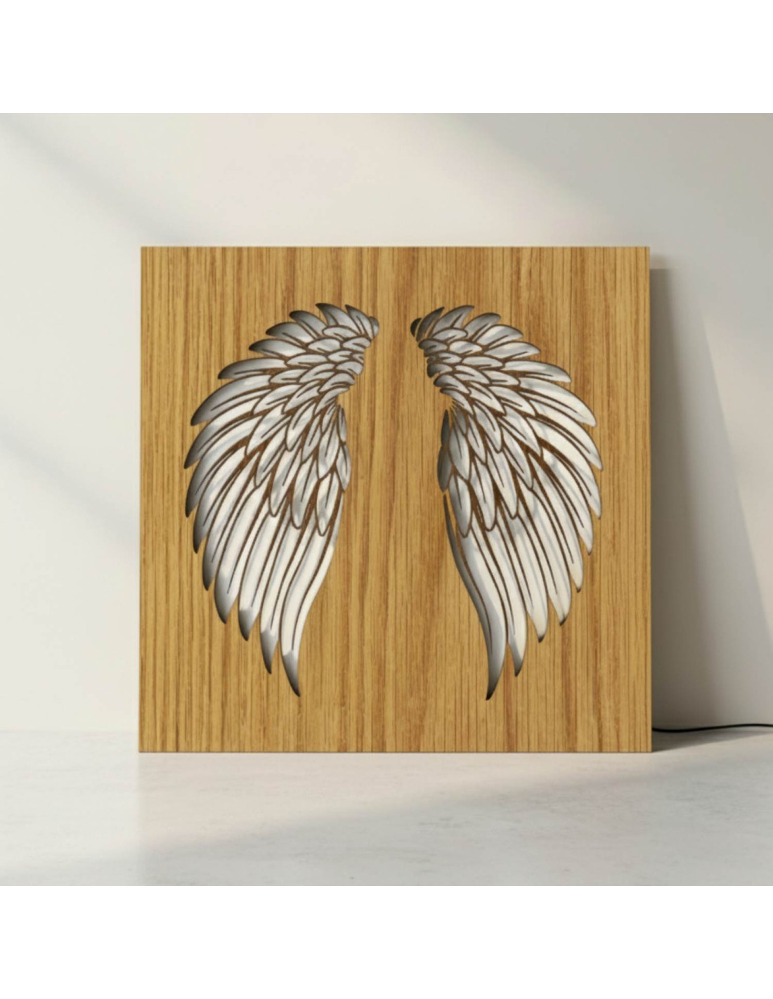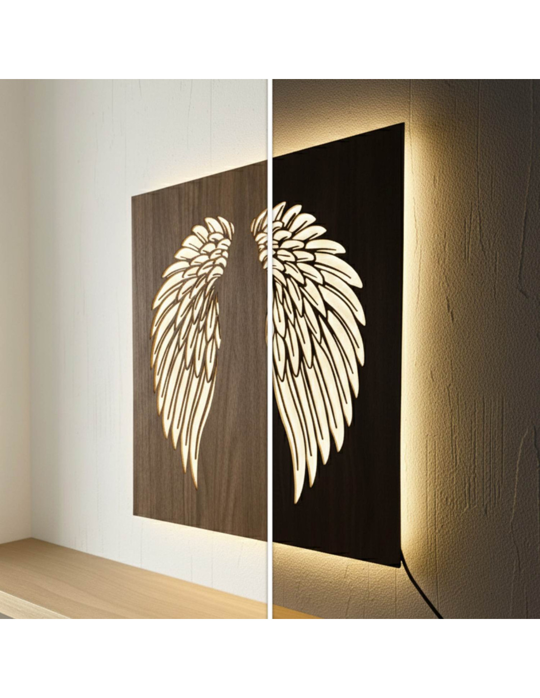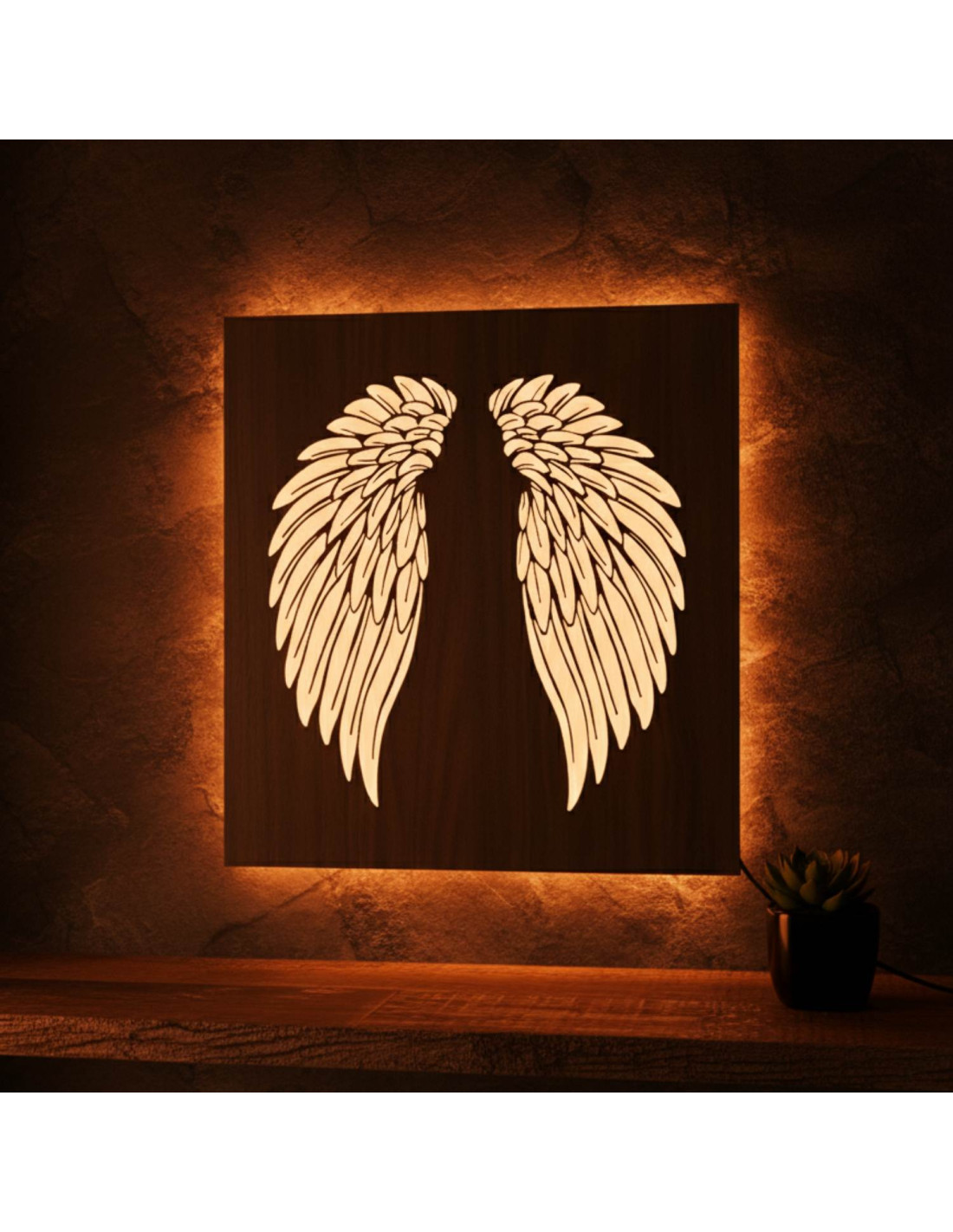 The original backlit wooden painting - angel wings combines the natural beauty of wood, modern design and subtle LED lighting into a unique work of art. This elegant piece brings a sense of peace, light and harmony to the space, making every interior cozy - from living rooms and bedrooms to representative office spaces .
