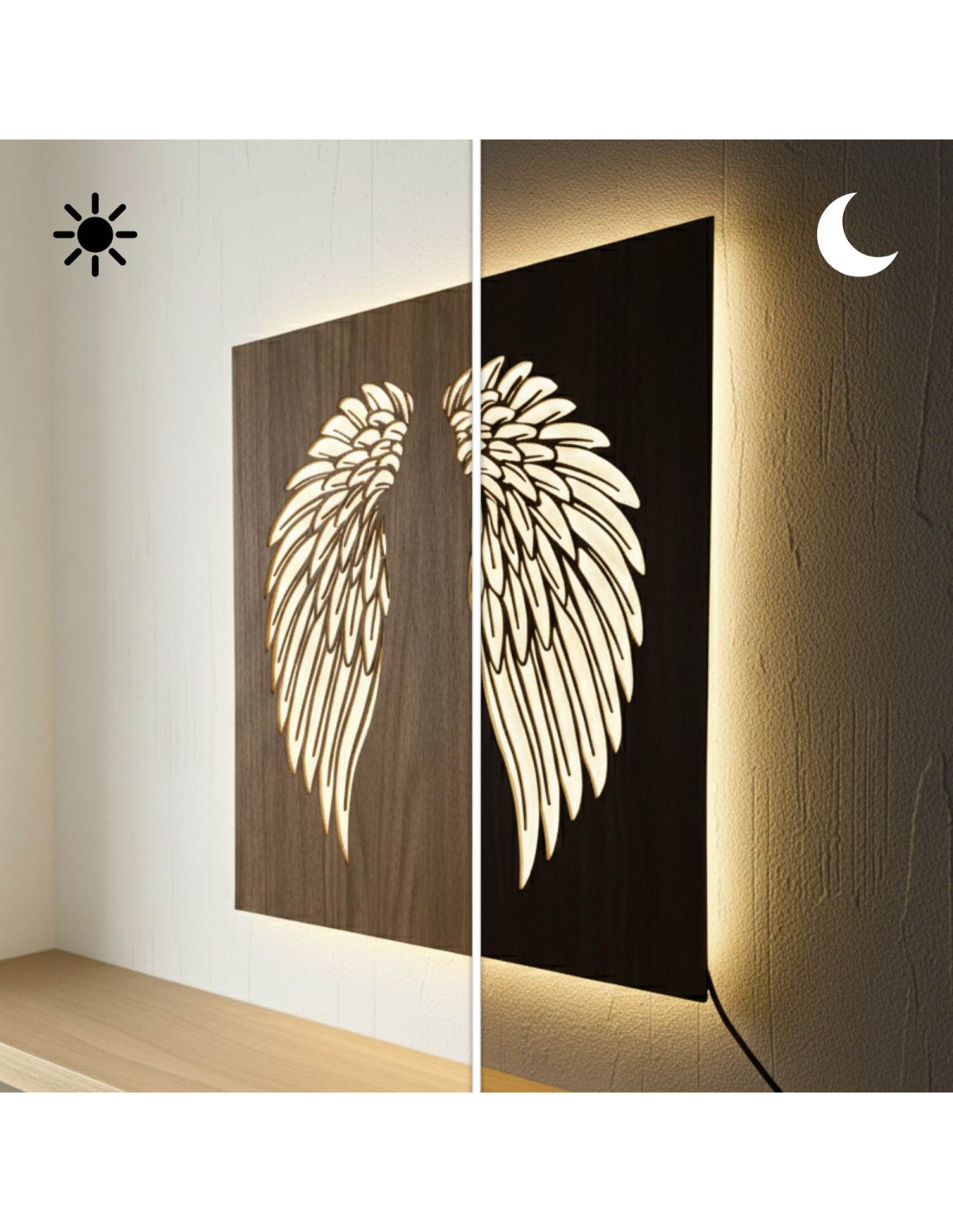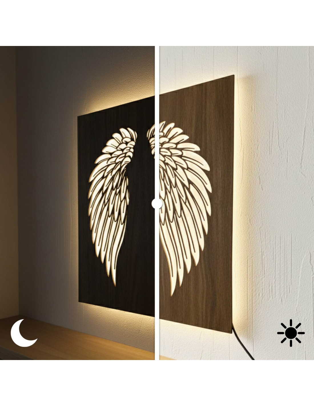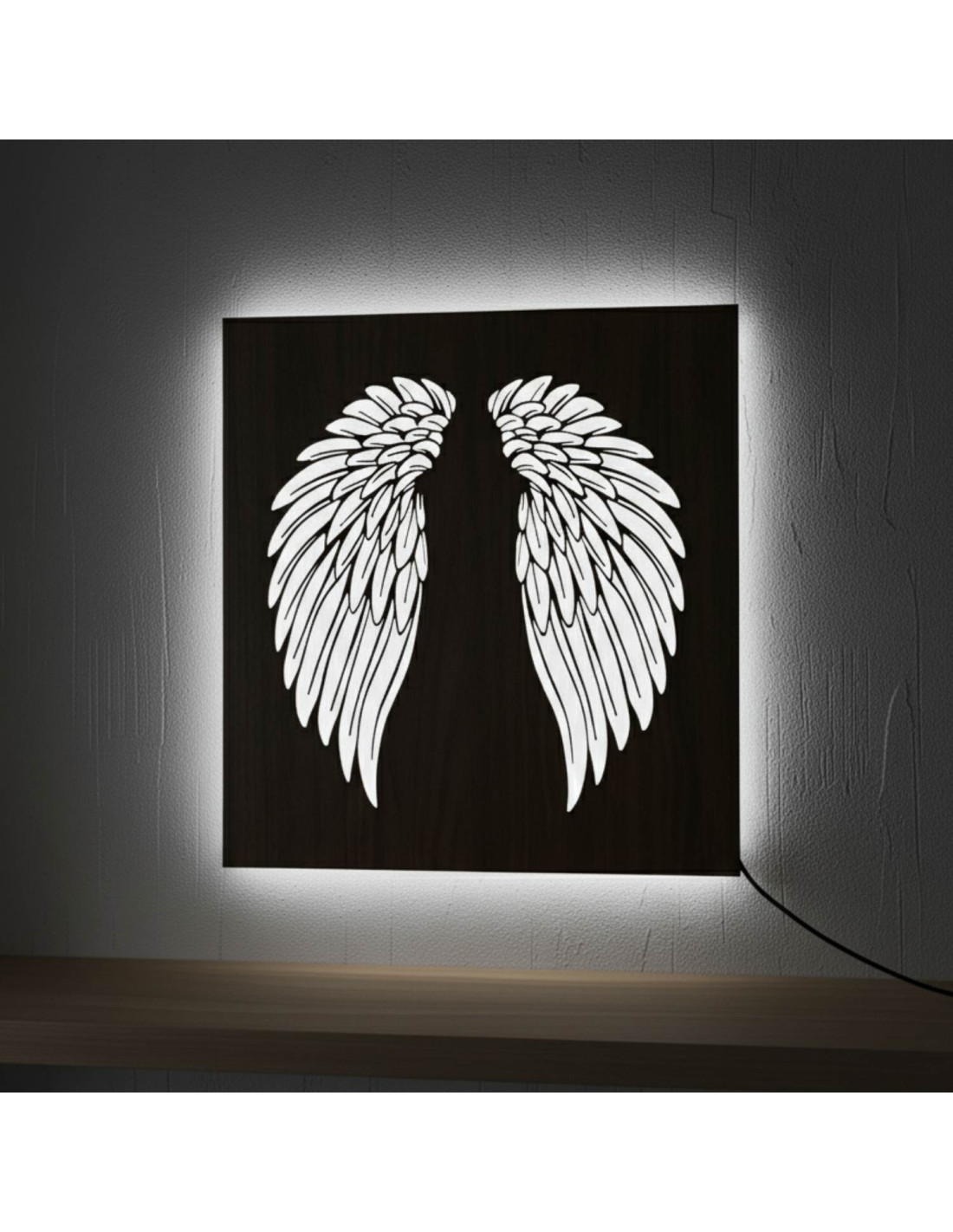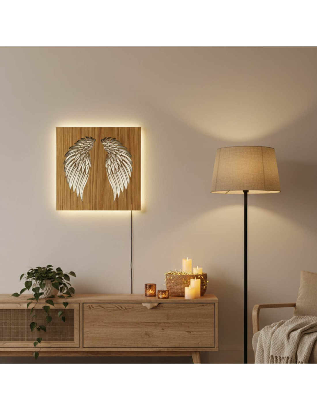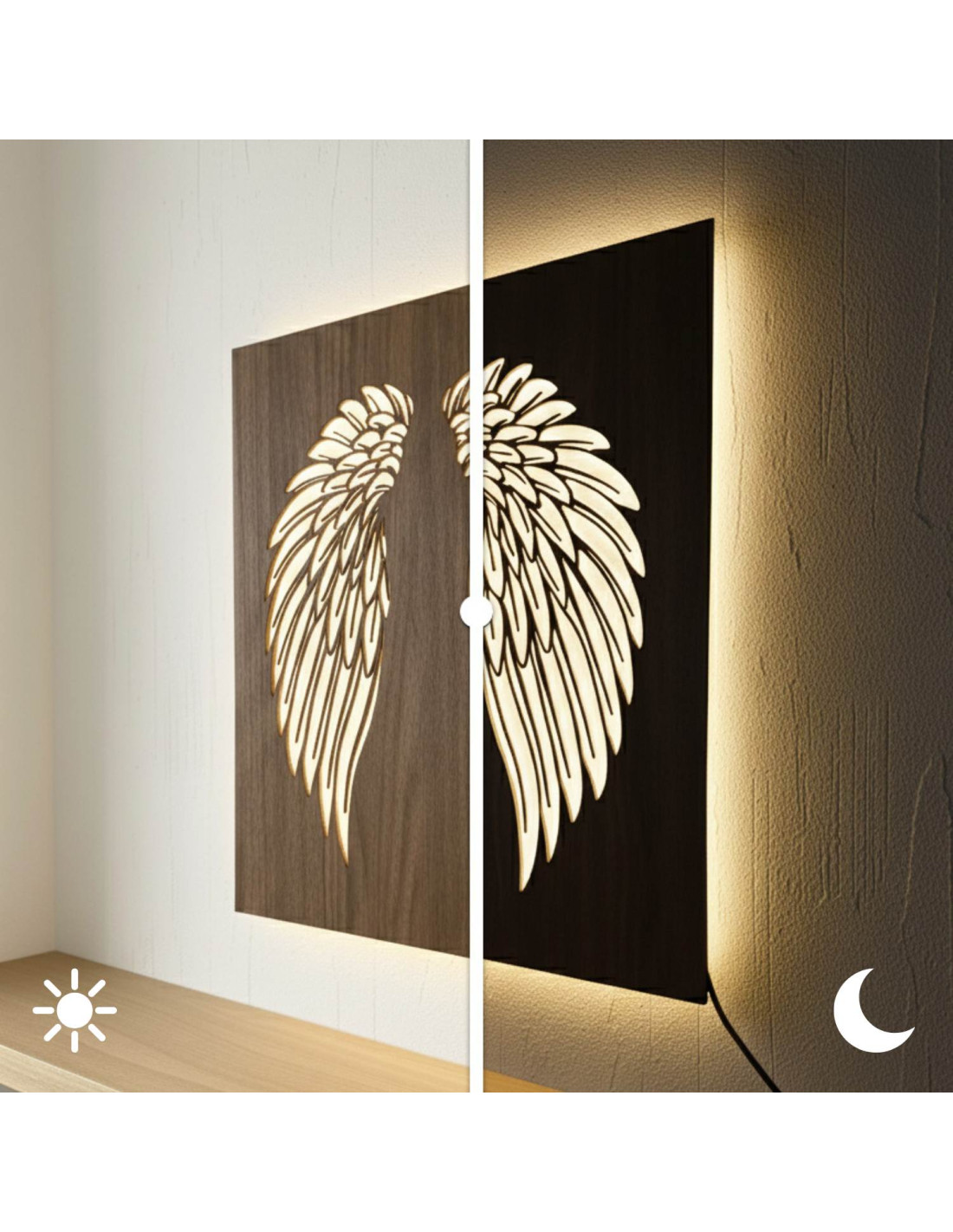 The original backlit wooden painting - angel wings combines the natural beauty of wood, modern design and subtle LED lighting into a unique work of art. This elegant piece brings a sense of peace, light and harmony to the space, making every interior cozy - from living rooms and bedrooms to representative office spaces .