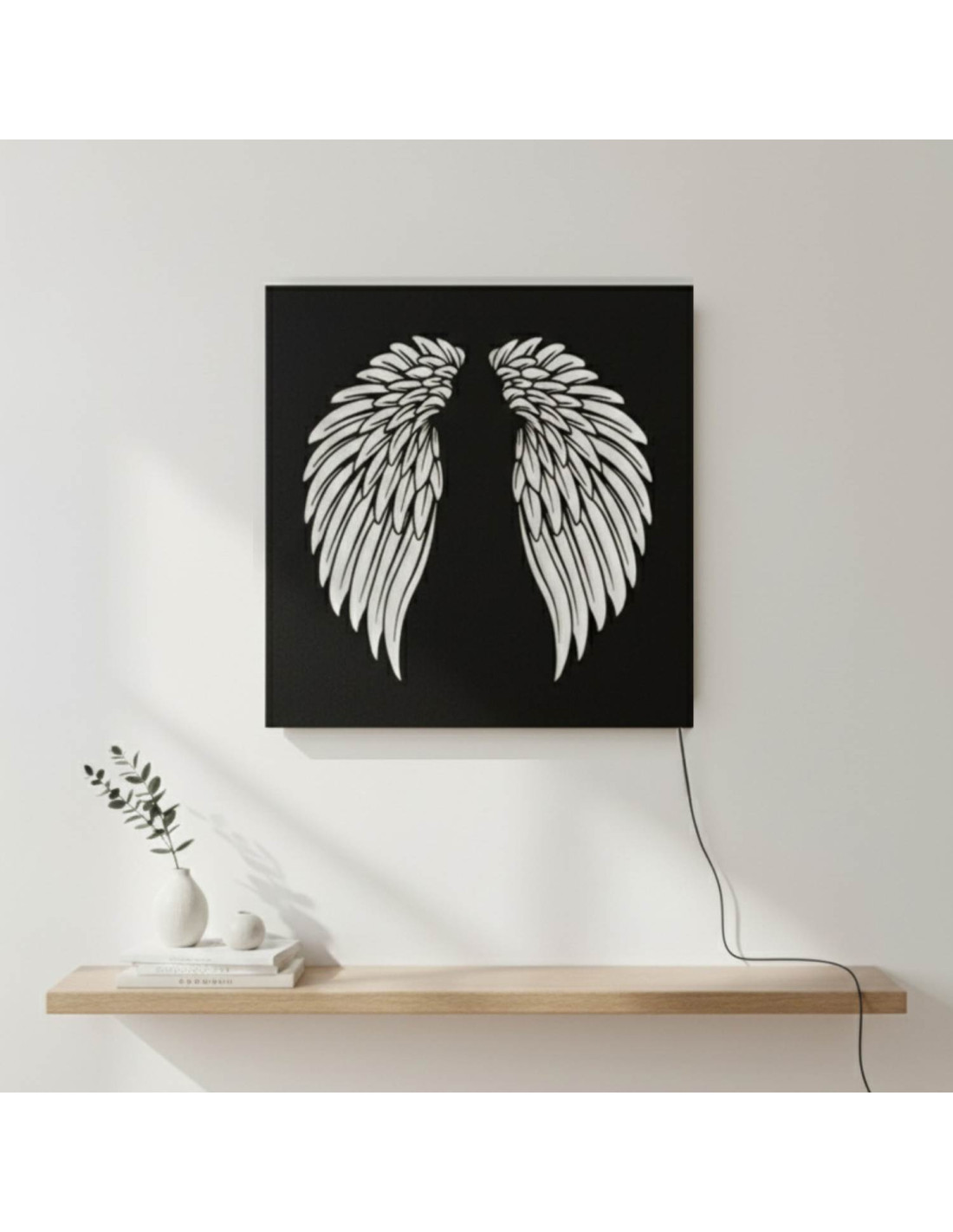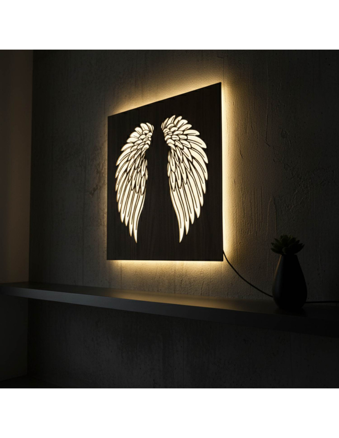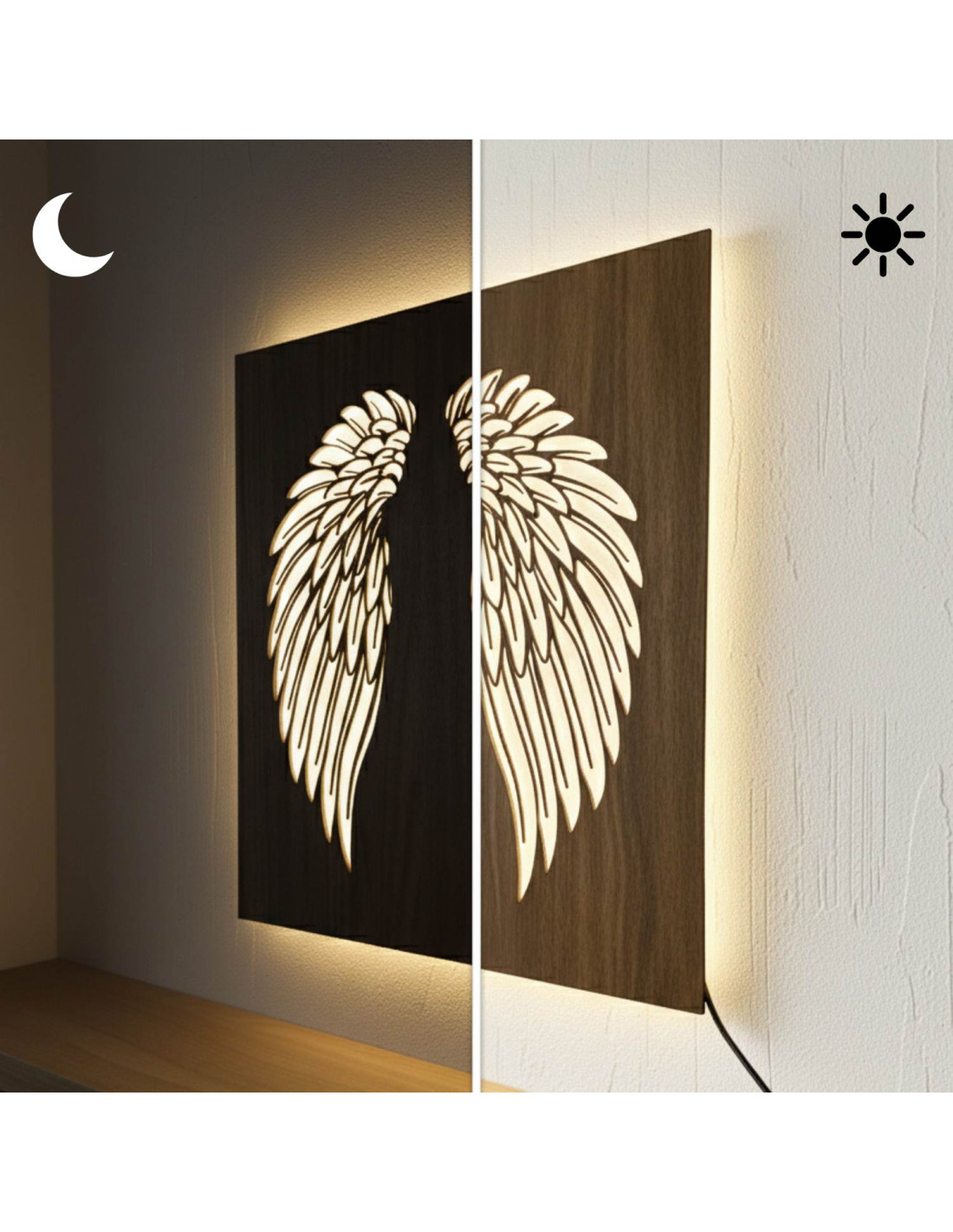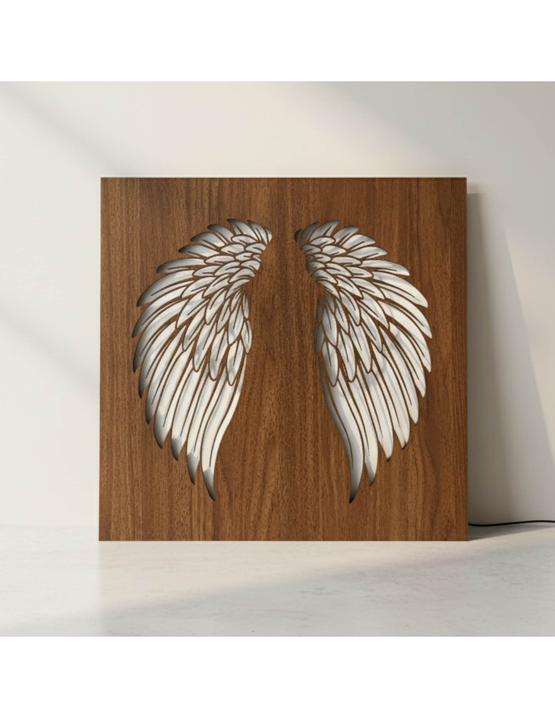 The original backlit wooden painting - angel wings combines the natural beauty of wood, modern design and subtle LED lighting into a unique work of art. This elegant piece brings a sense of peace, light and harmony to the space, making every interior cozy - from living rooms and bedrooms to representative office spaces .