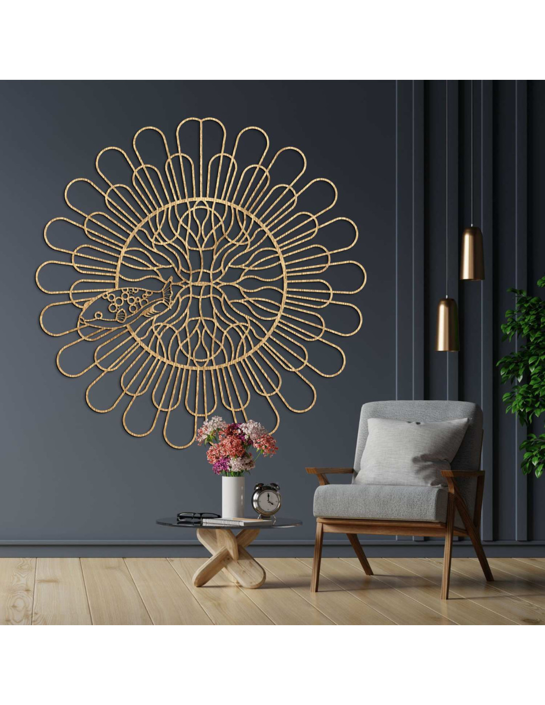 Detailed laser cut mandala with fish as a modern 3D decoration