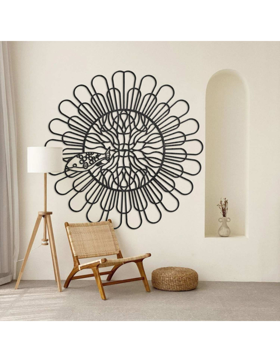 Circular wall mandala fish in a minimalist black design