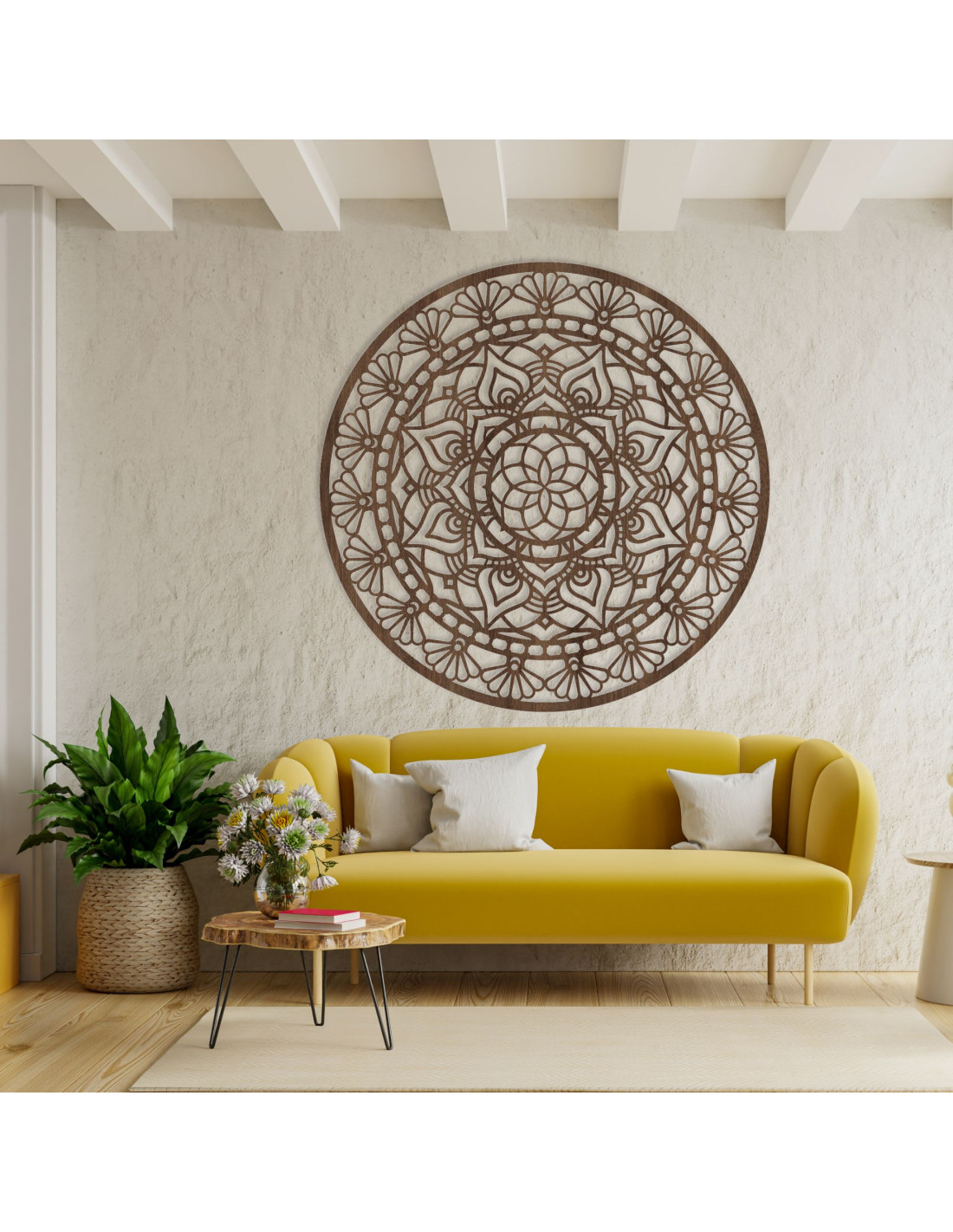 The design of this mandala is inspired by the ancient symbol of the flower of life , which is found in various cultures and represents the fundamental principles of the universe and life, and is believed to have the ability to improve the energy of a space and promote inner peace.