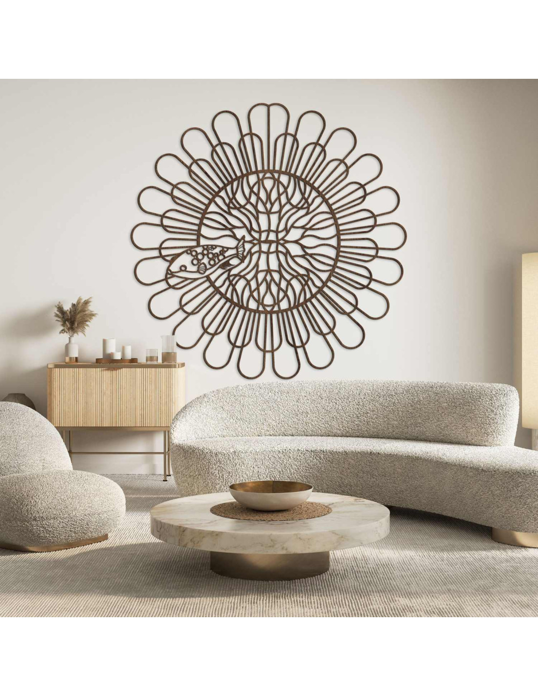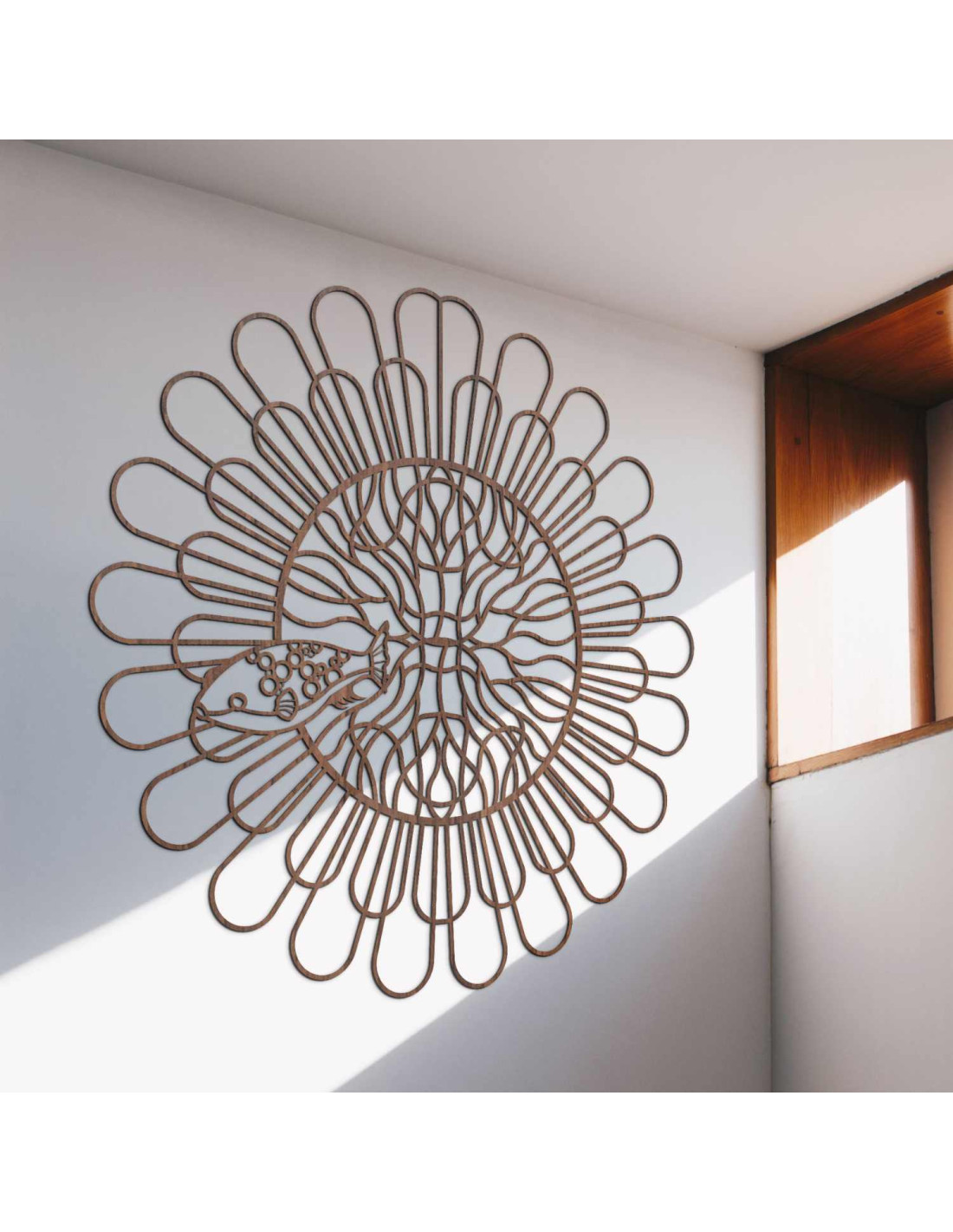 Black wooden mandala with fish on a white wall in a modern apartment