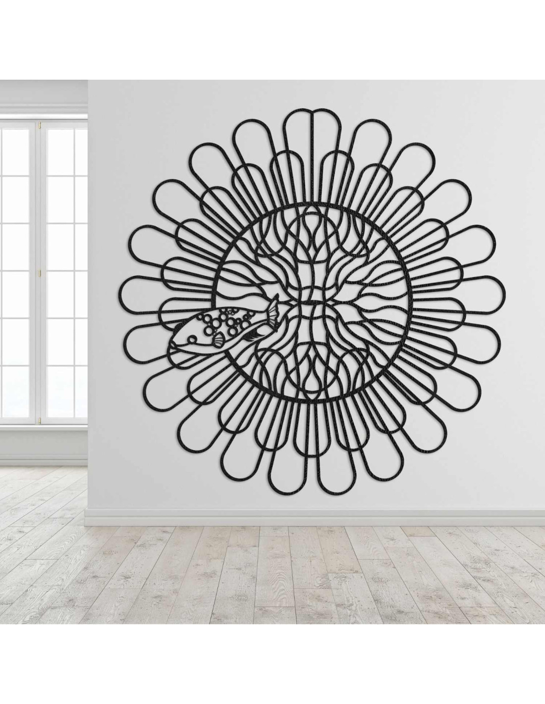 Carved 3D image of a four-toothed fish mandala made of black HDF board