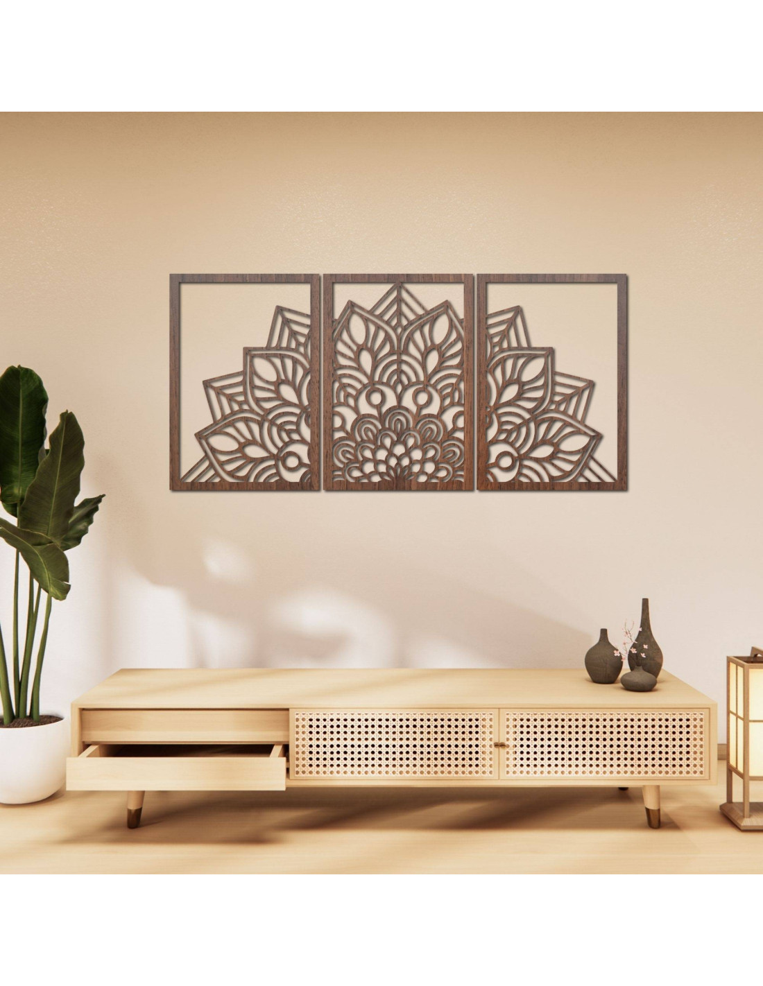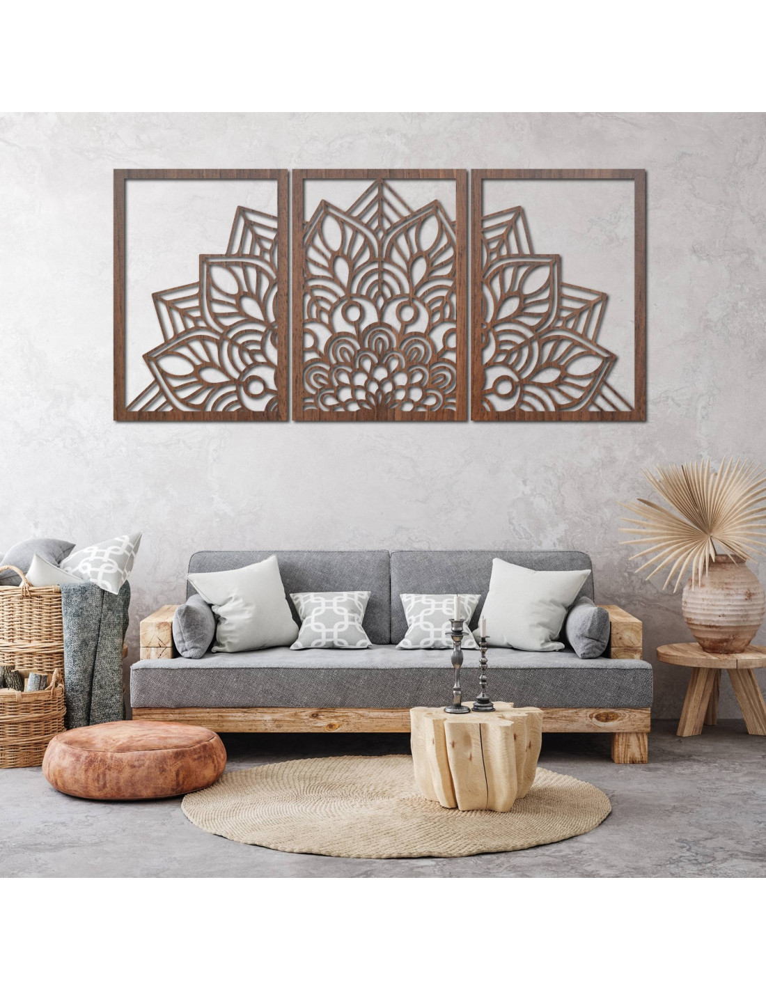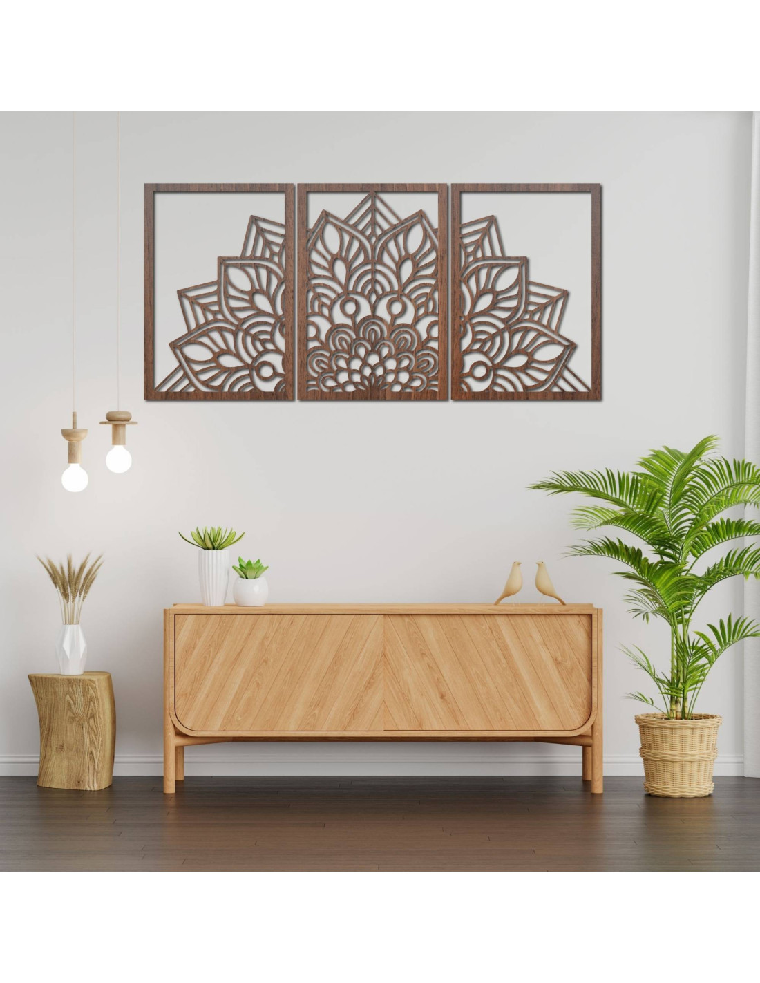 Whether it's an artistic wall clock in the shape of a flower of life mandala with playful bird silhouettes, or a majestic three-part mandala , these elements visually open and enlarge the space thanks to their precise carving.