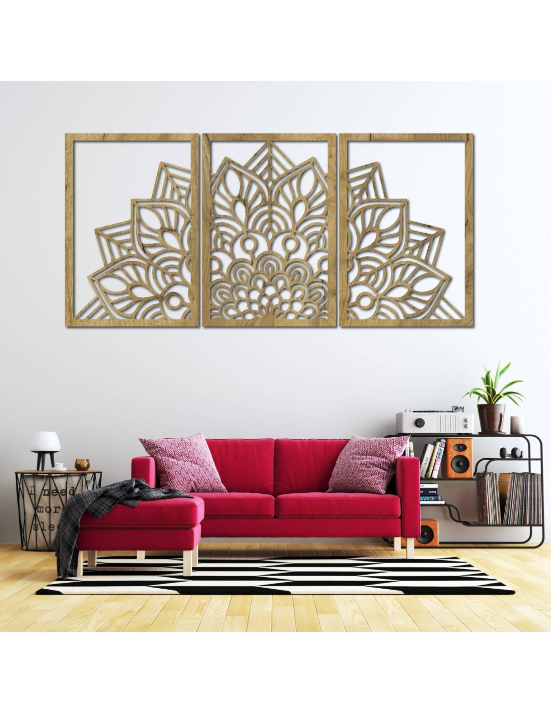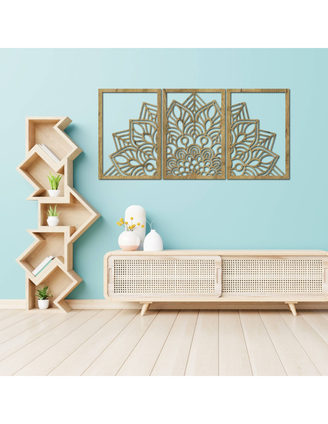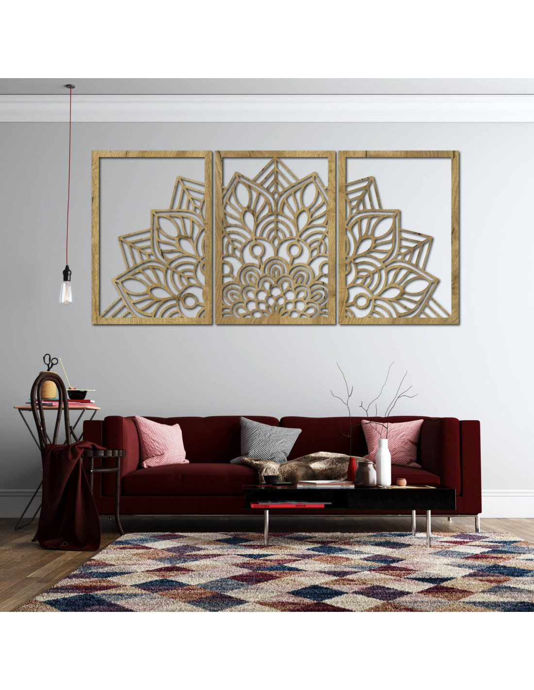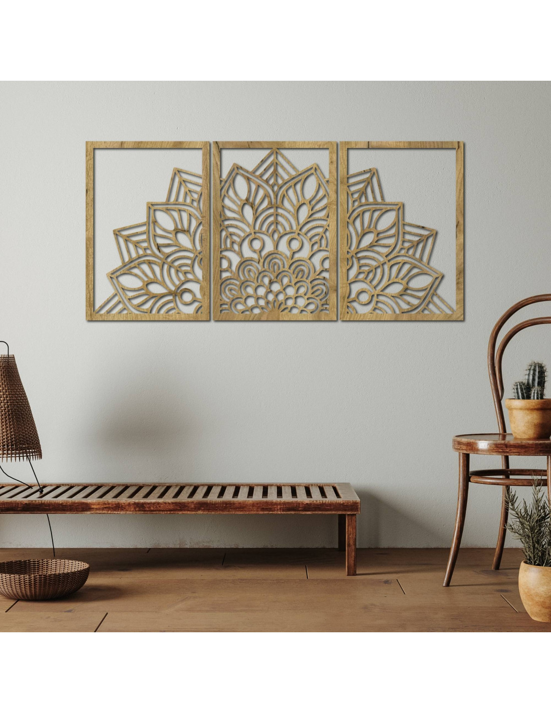 Whether it's an artistic wall clock in the shape of a flower of life mandala with playful bird silhouettes, or a majestic three-part mandala , these elements visually open and enlarge the space thanks to their precise carving.