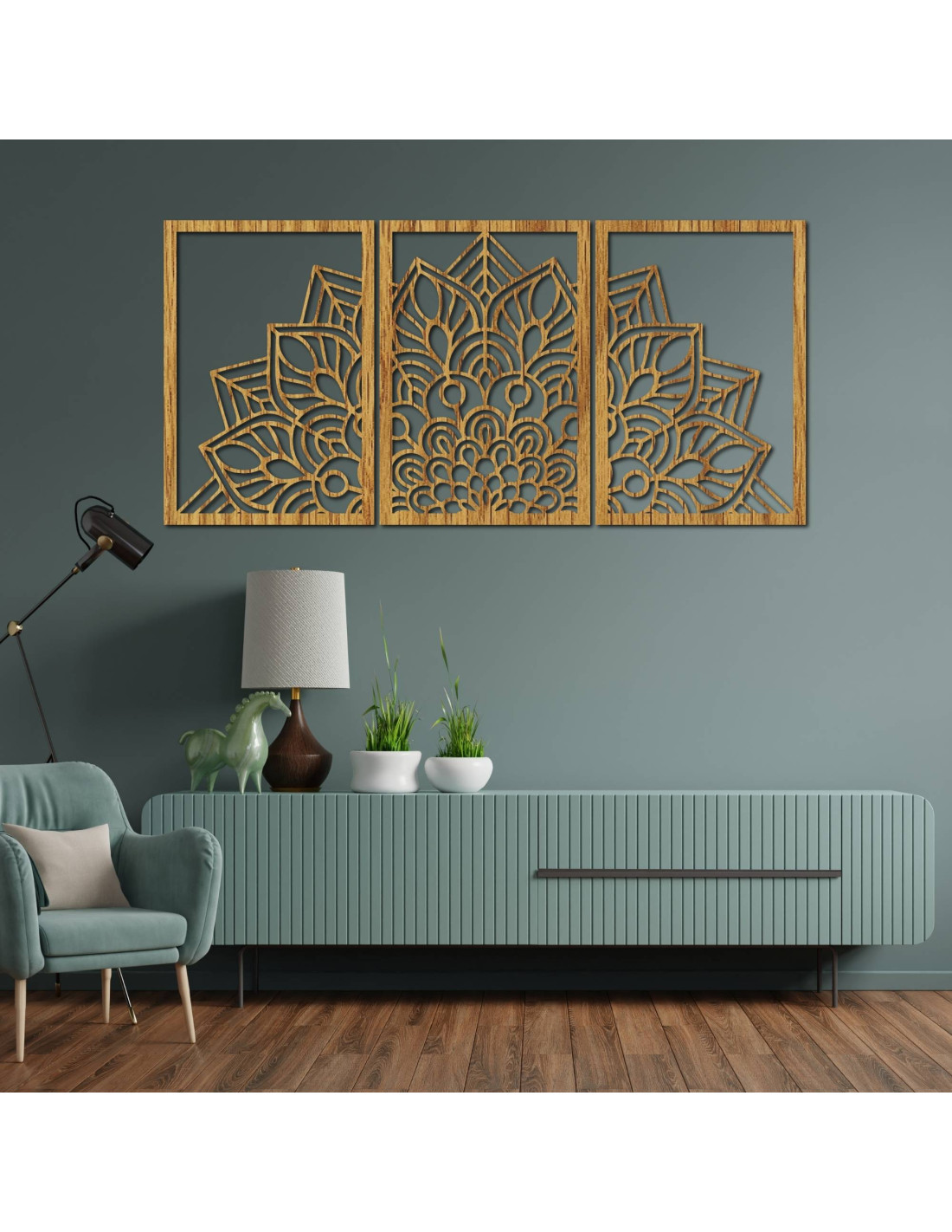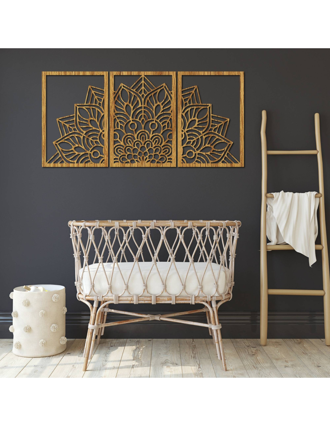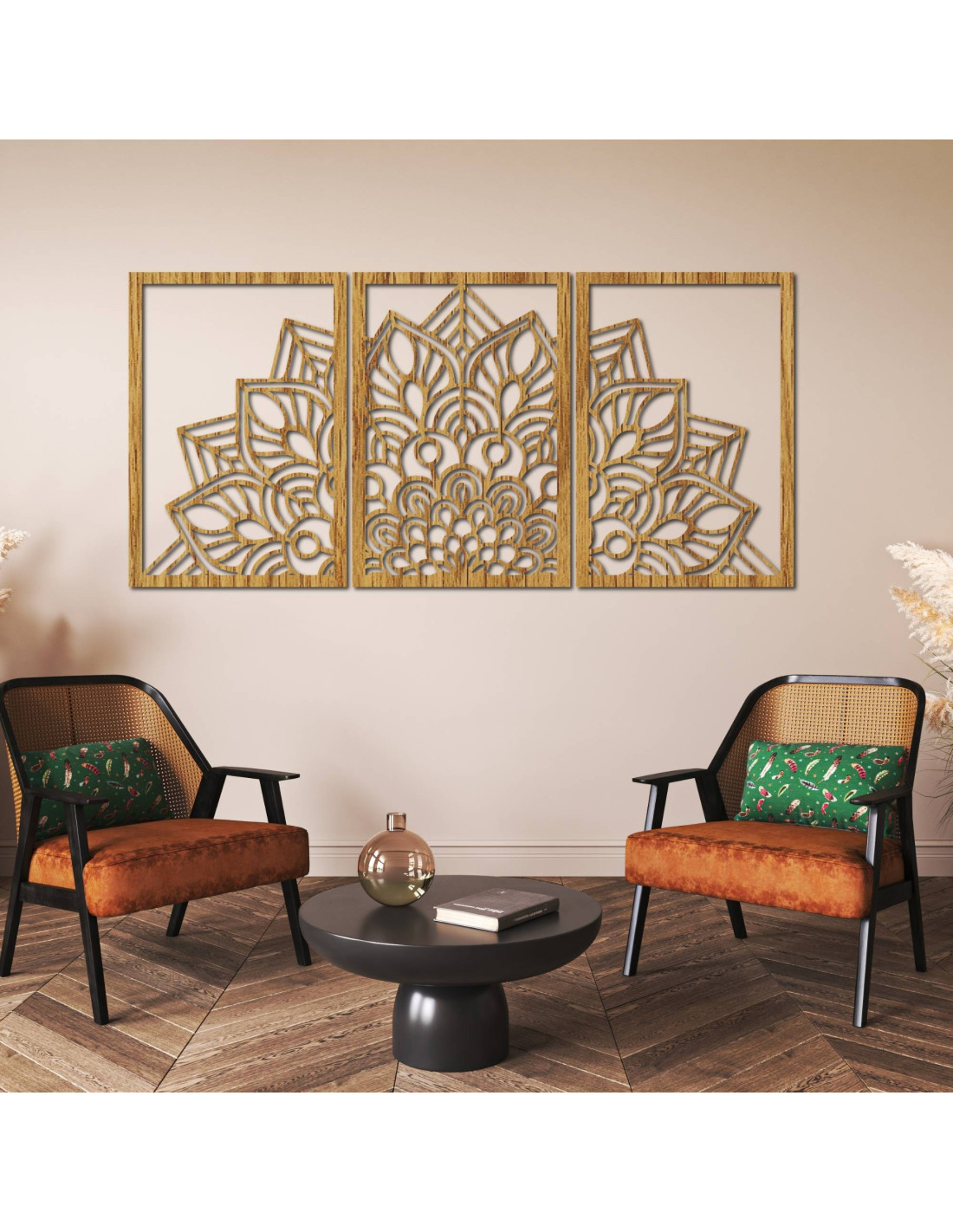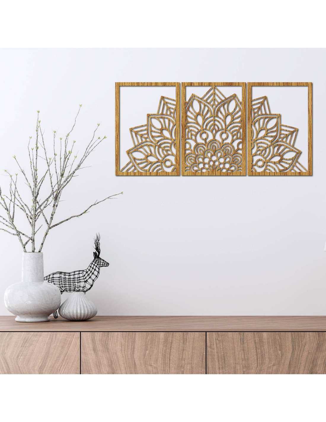 Whether it's an artistic wall clock in the shape of a flower of life mandala with playful bird silhouettes, or a majestic three-part mandala , these elements visually open and enlarge the space thanks to their precise carving.