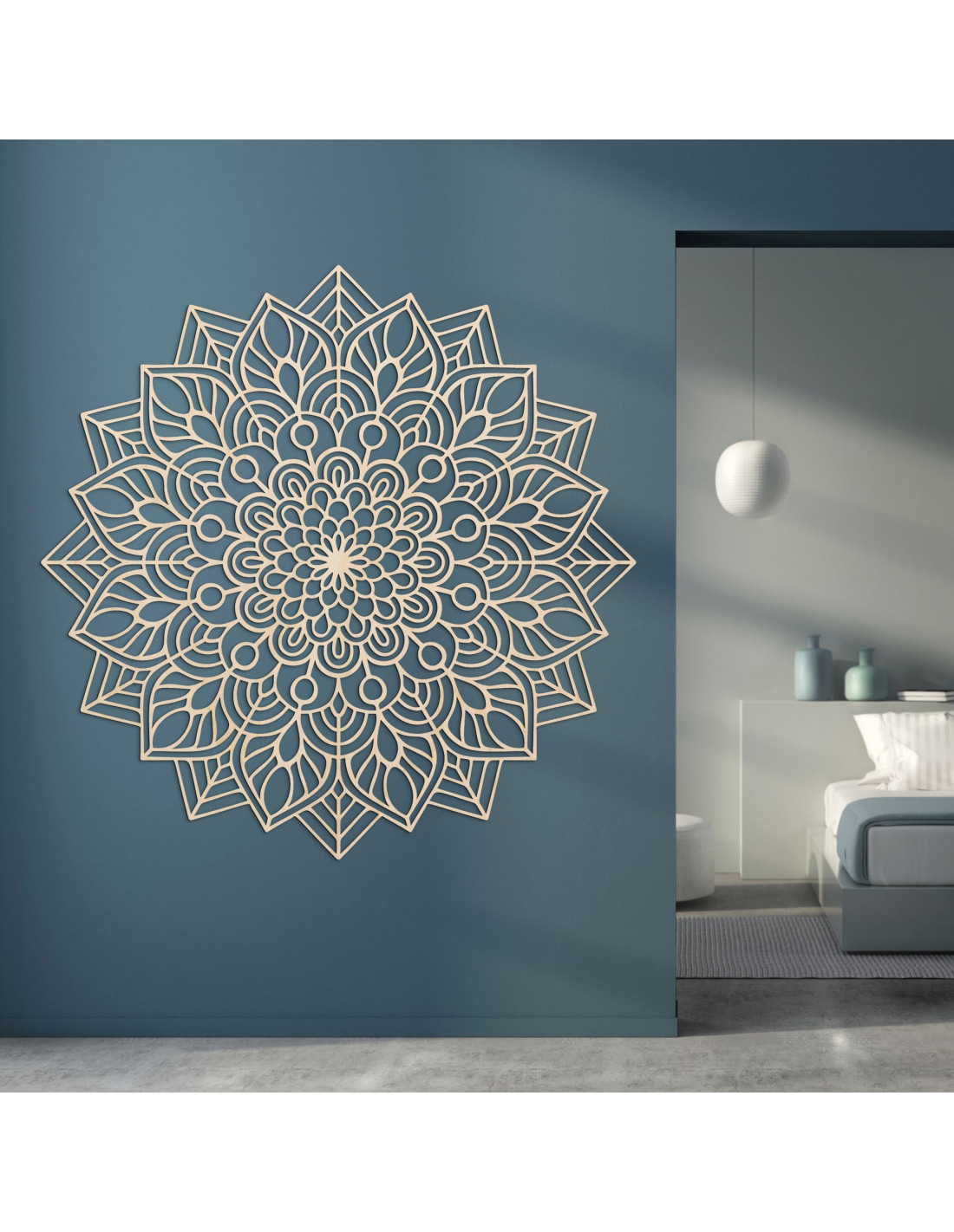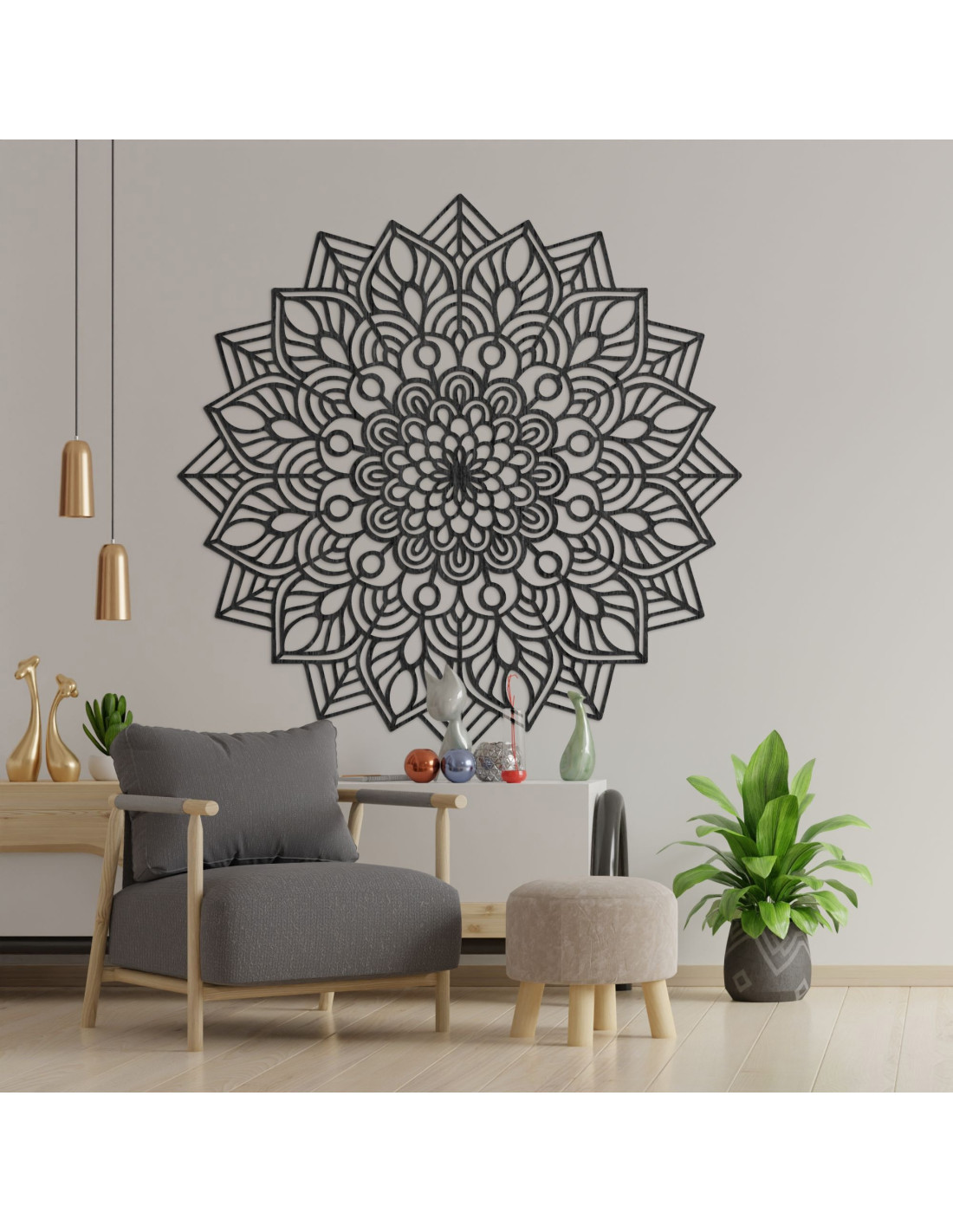 A wooden mandala on the wall brings elegance, precision and harmony to the interior.