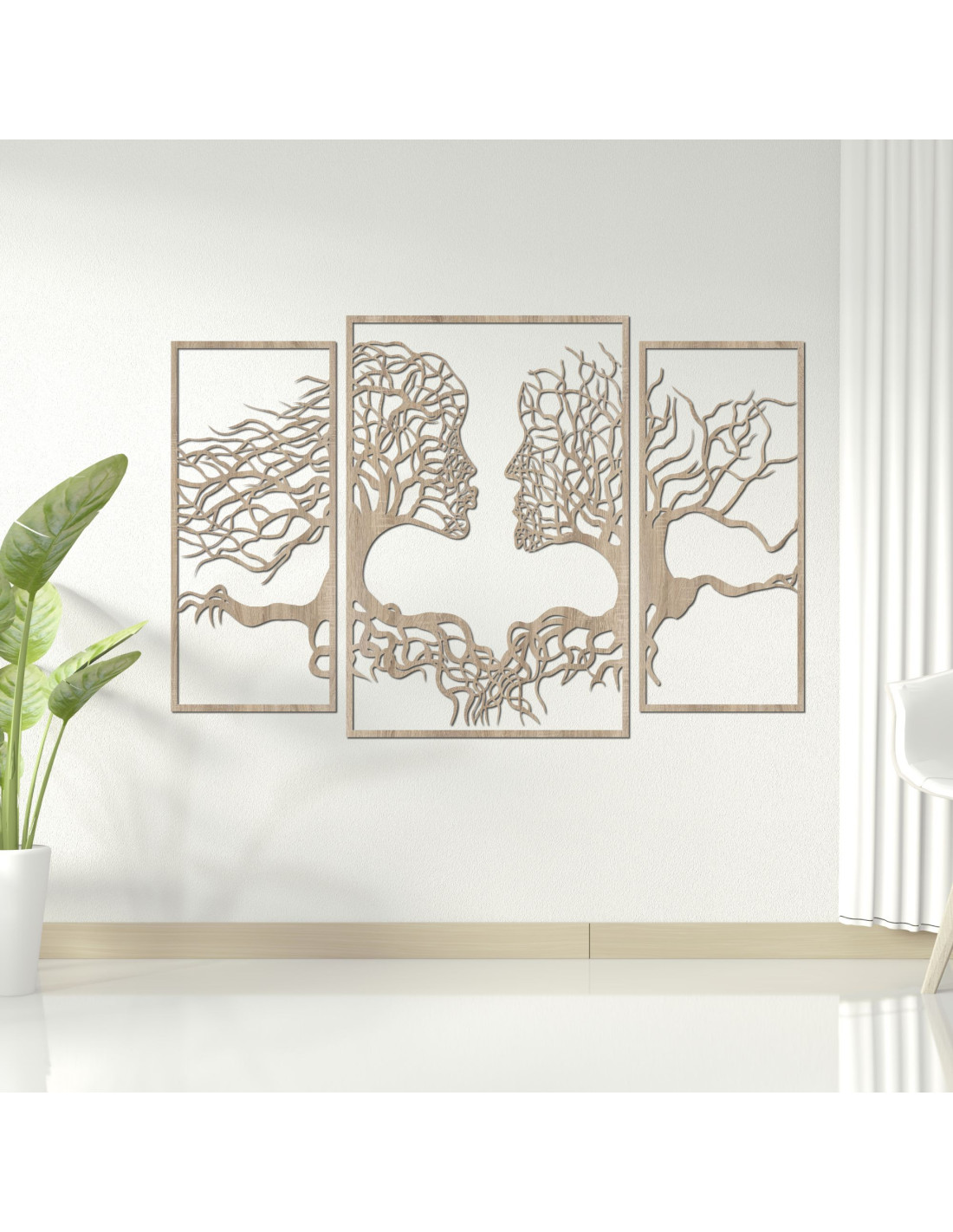 The three-part painting depicts the connection between man and nature, where trees and human faces blend harmoniously.