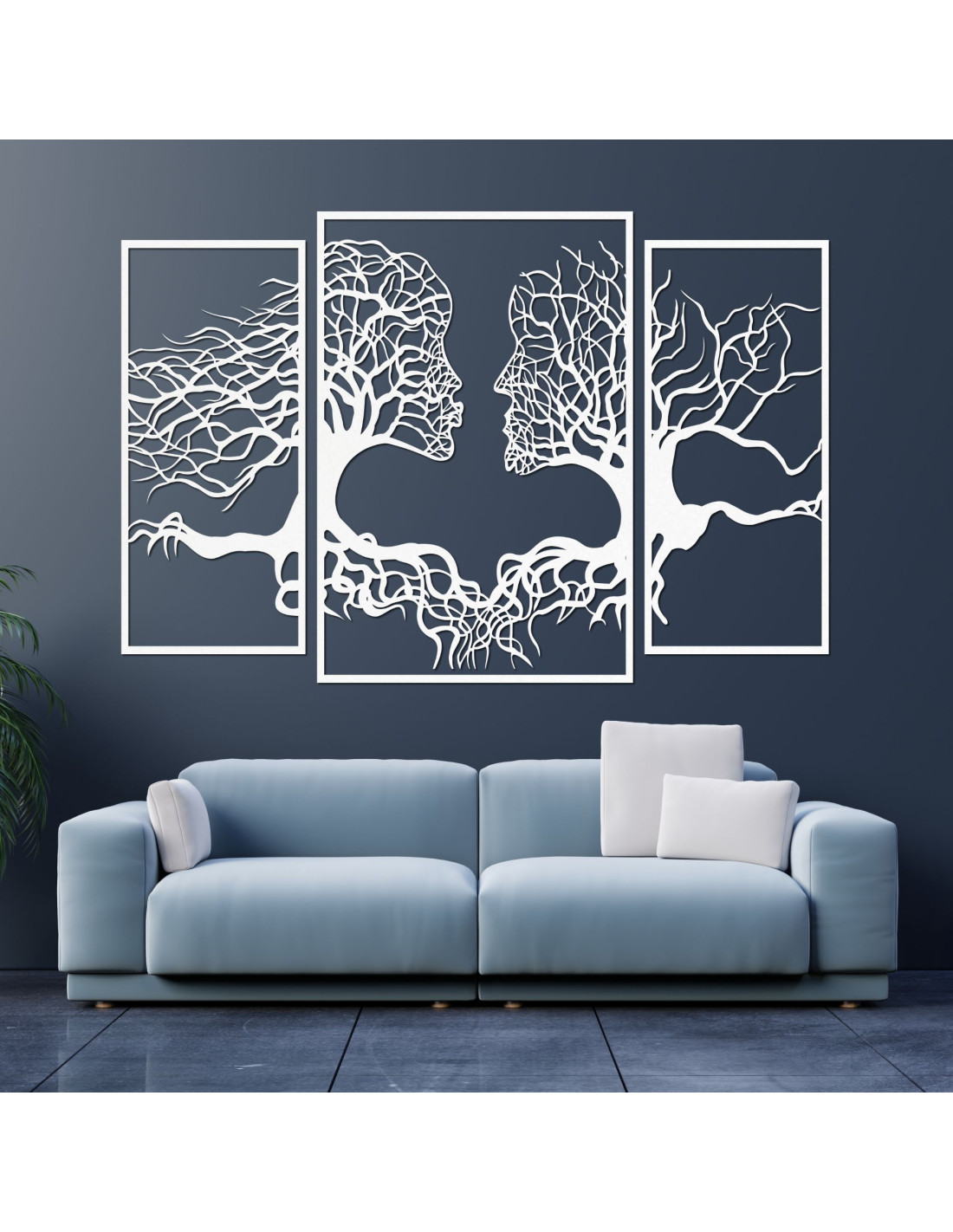 The three-part painting depicts the connection between man and nature, where trees and human faces blend harmoniously.