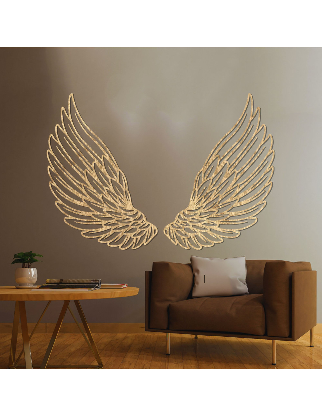 This wooden wall decoration in the shape of angel wings symbolizes freedom, protection, and lightness.