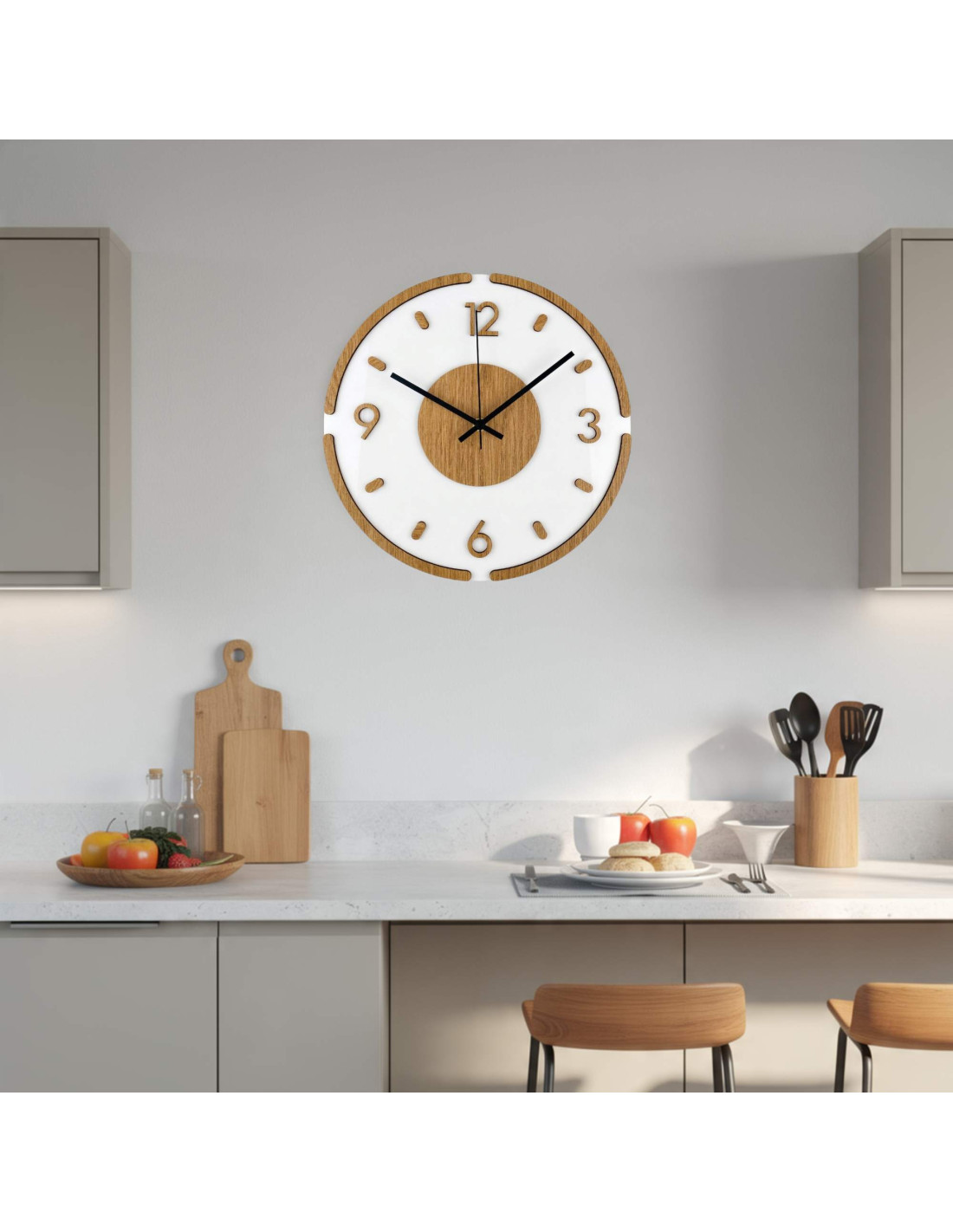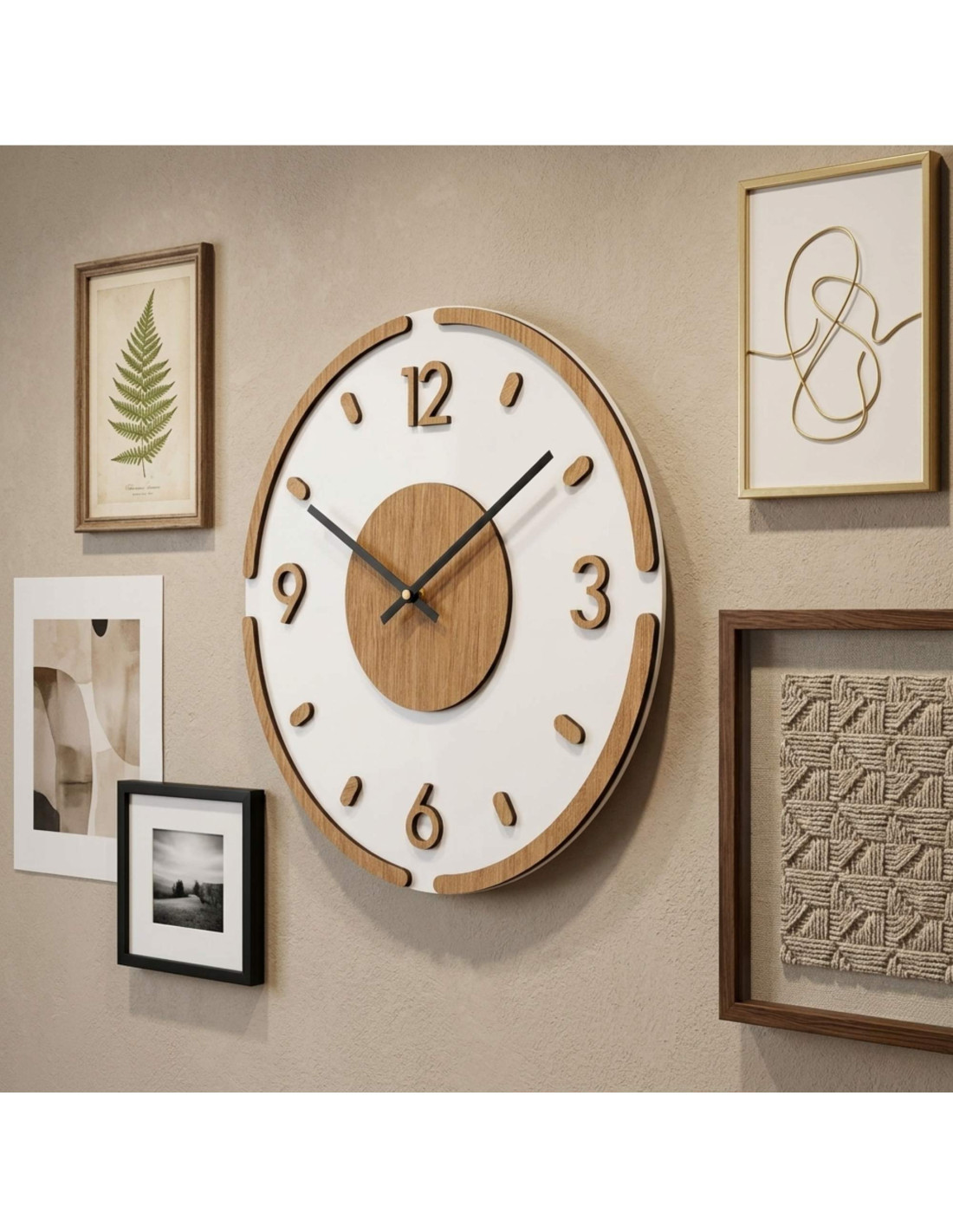 The clock is made of high-quality HDF board with an oak pattern combined with shiny and elegant white plexiglass.