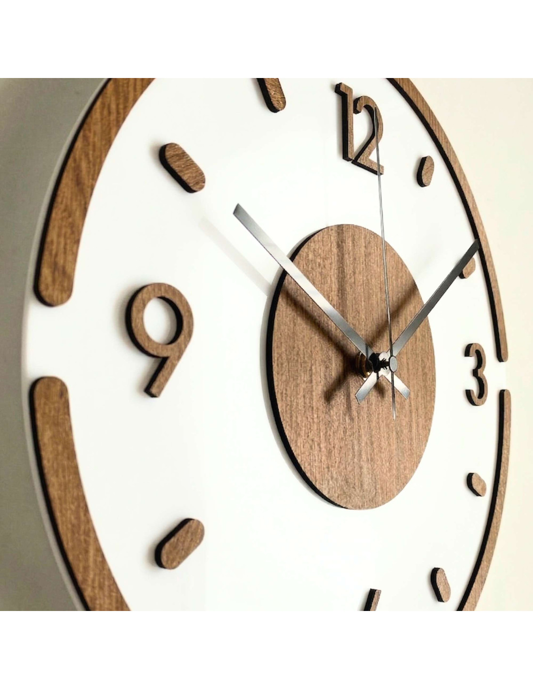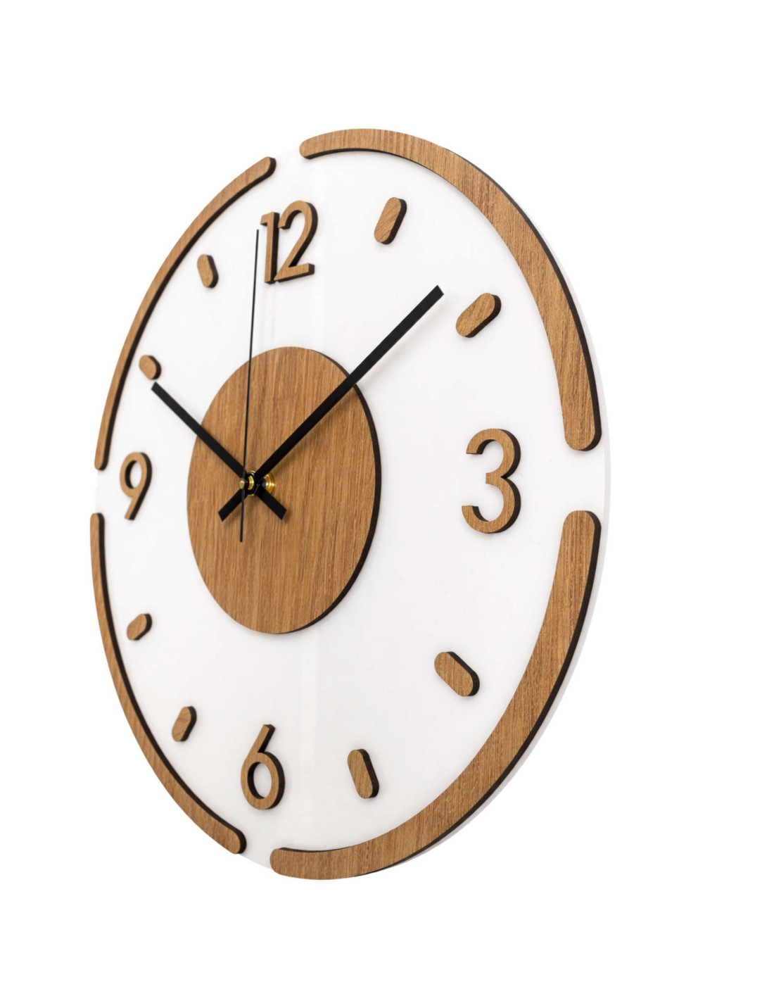 The clock is made of high-quality HDF board with an oak pattern combined with glossy and elegant white plexiglass.