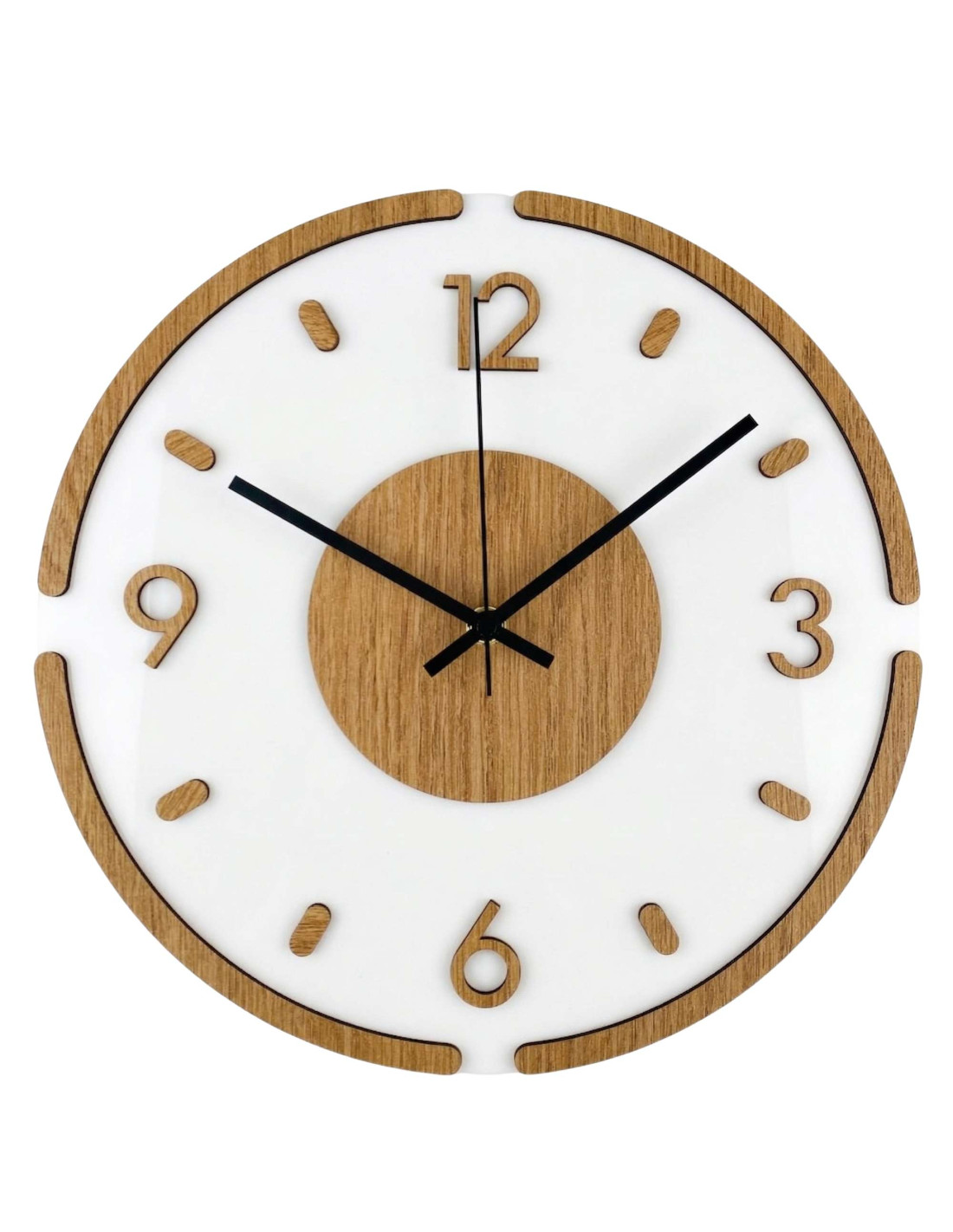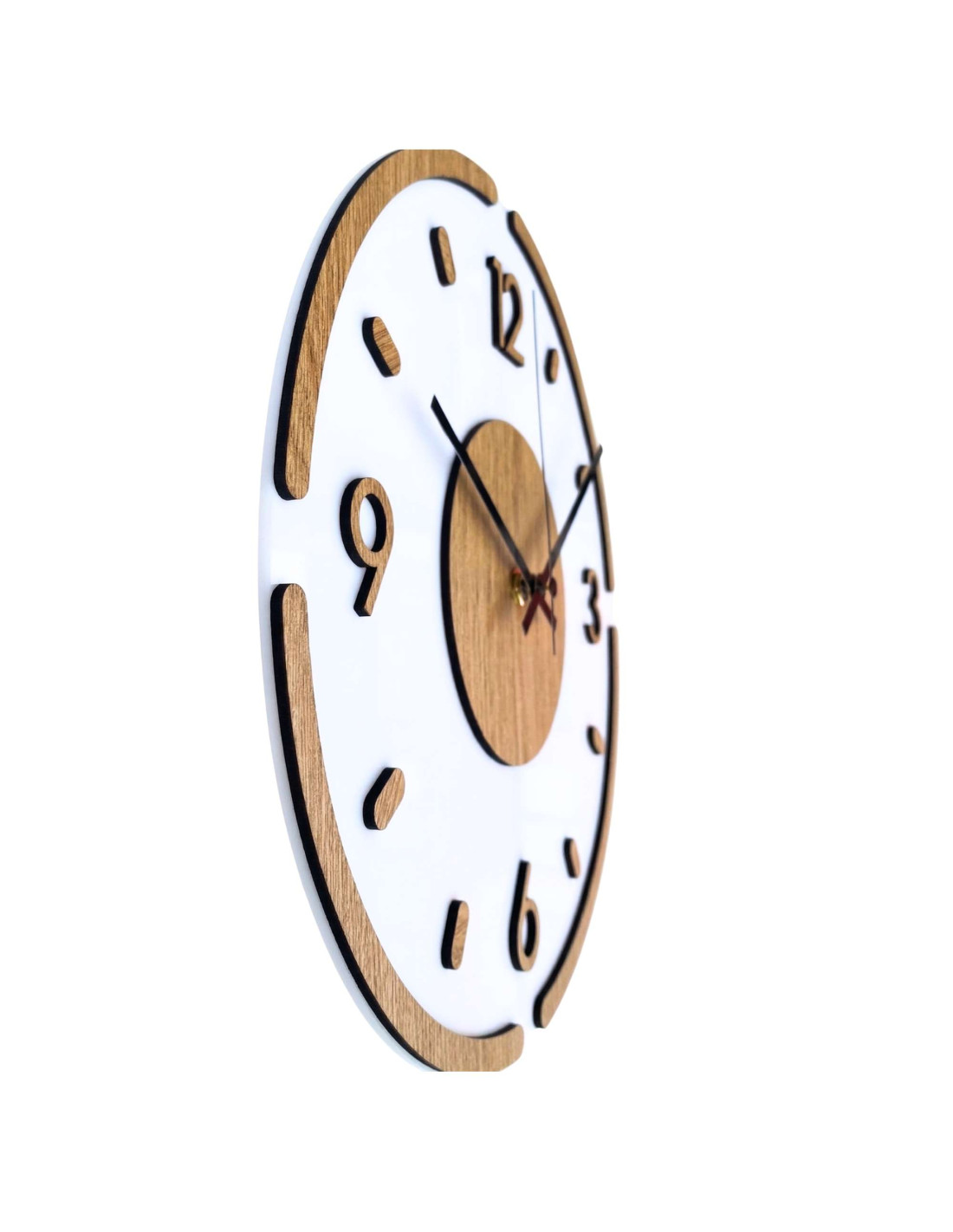 The clock is made of high-quality HDF board with an oak pattern combined with glossy and elegant white plexiglass.