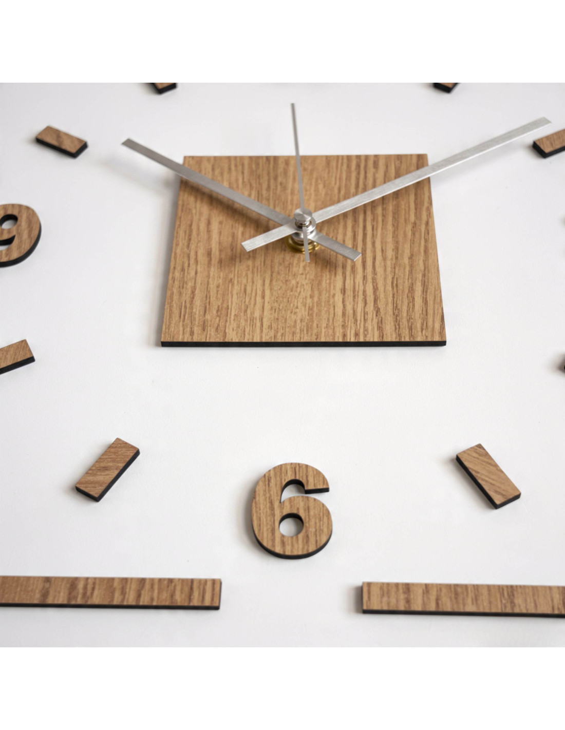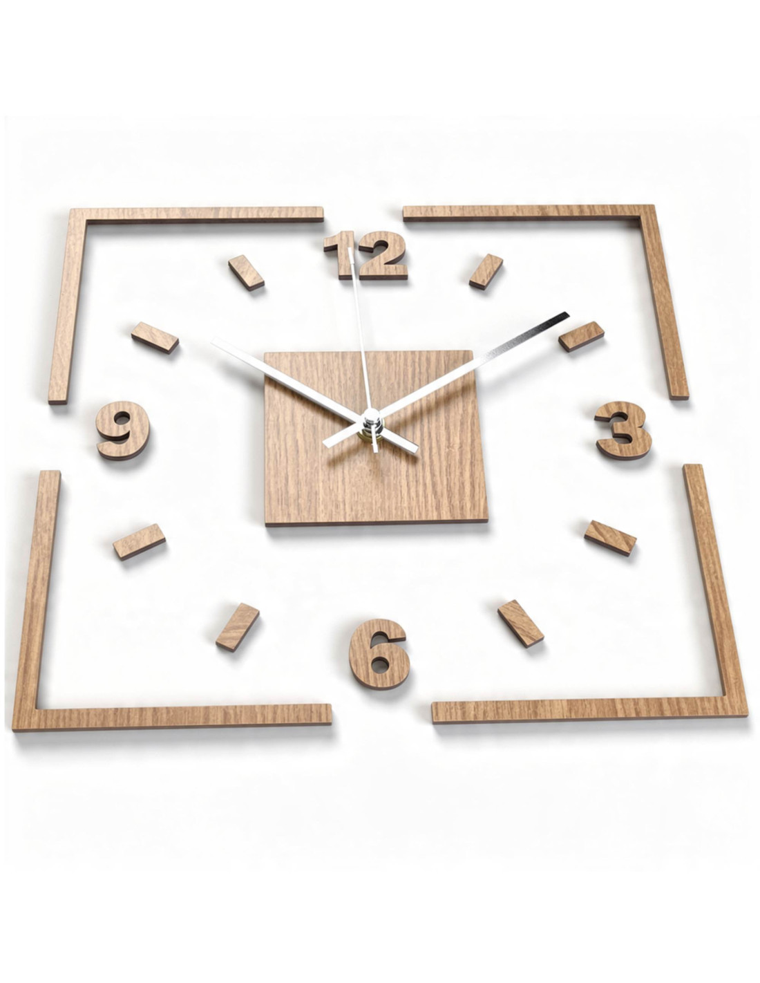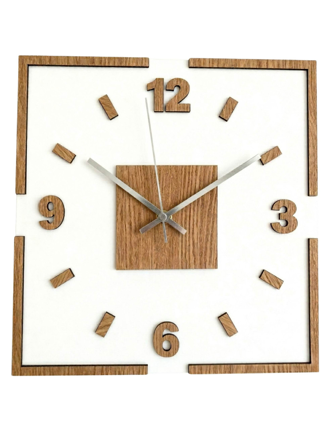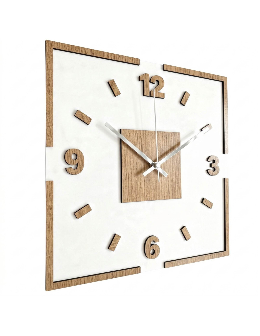 The center of the clock is highlighted by an oak square, from which black or silver hands emerge for perfect contrast and legibility.