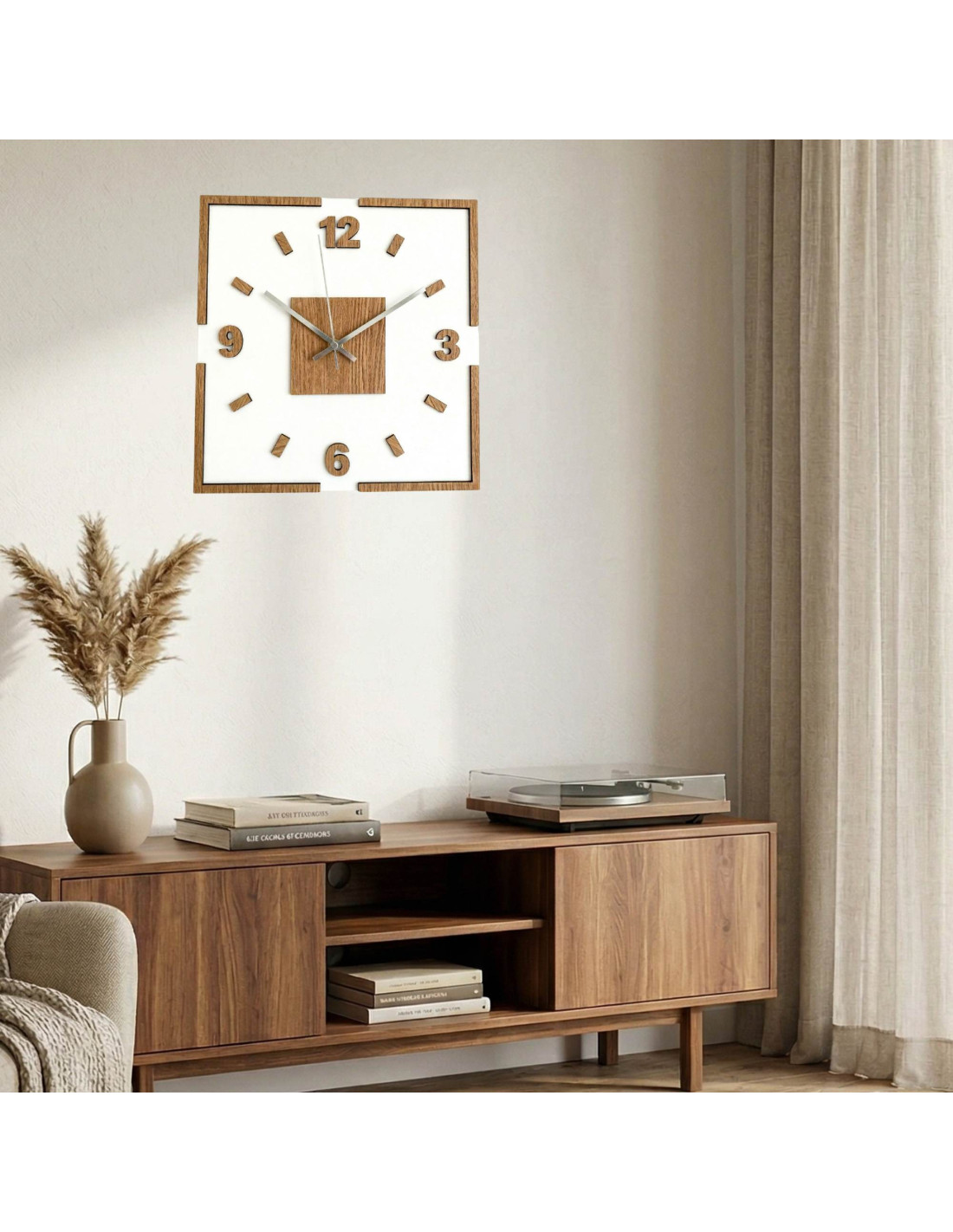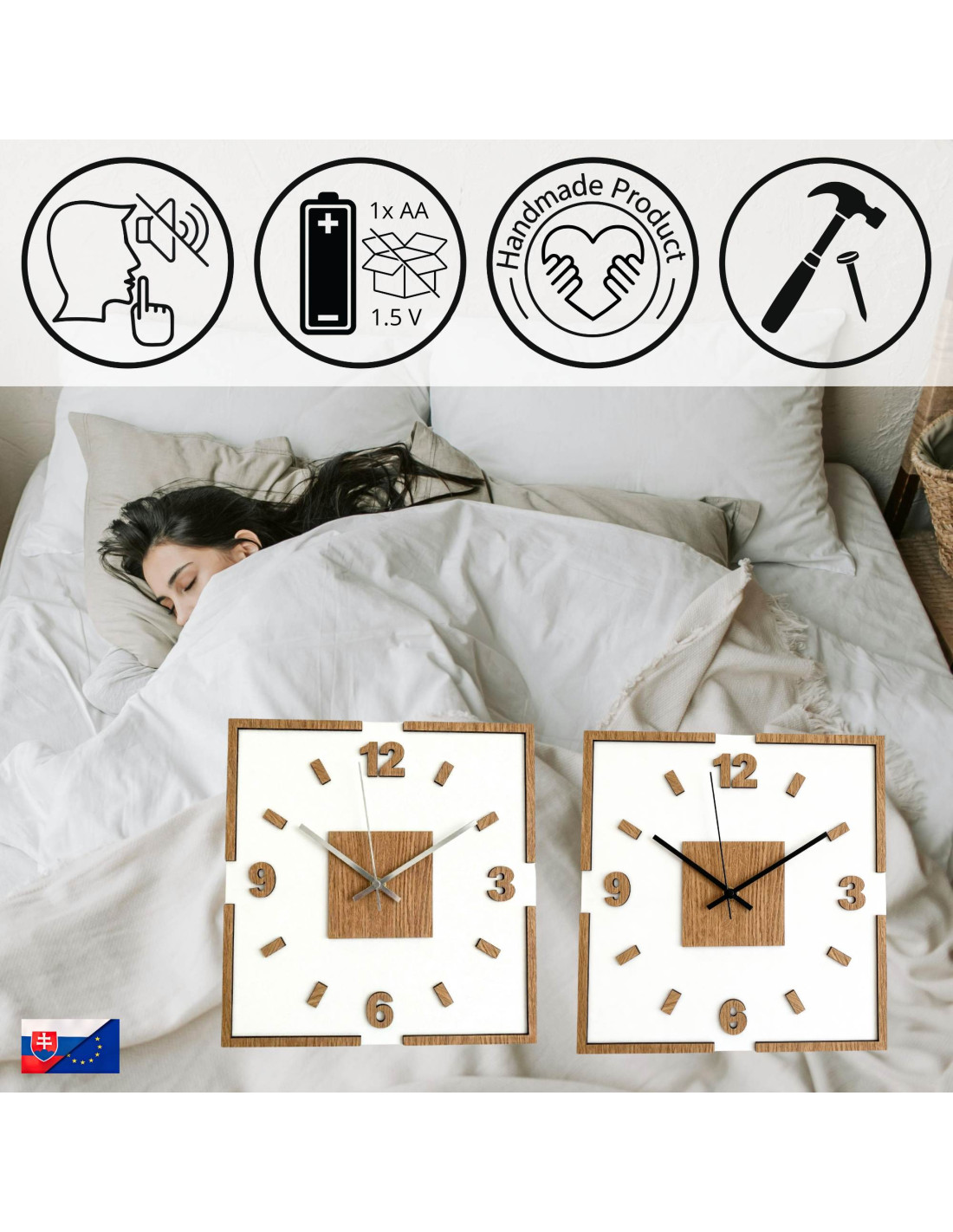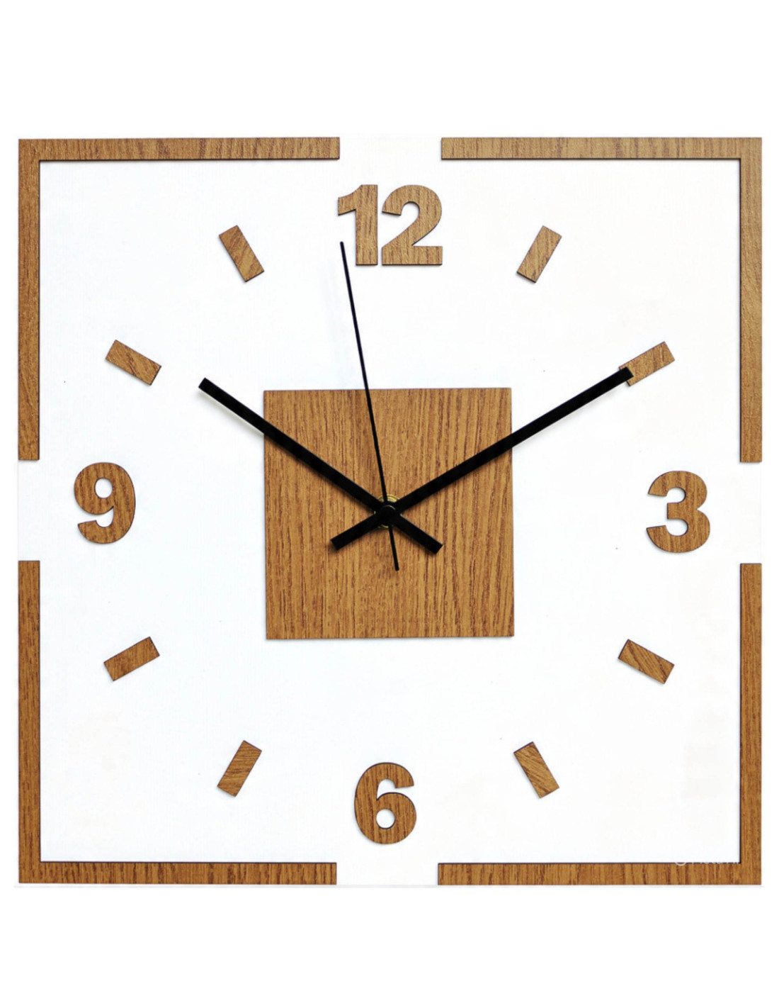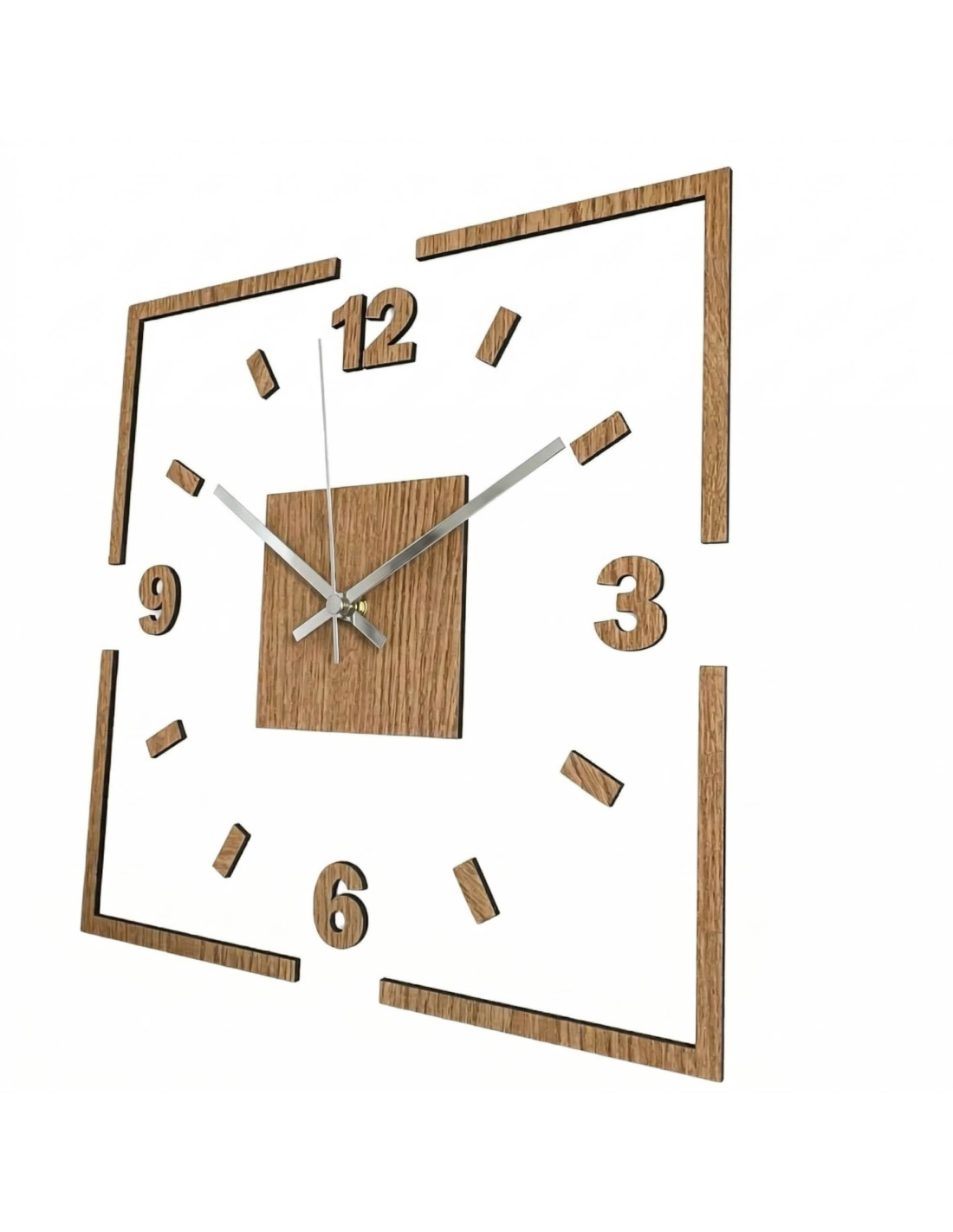 The center of the clock is highlighted by an oak square, from which black or silver hands emerge for perfect contrast and legibility.