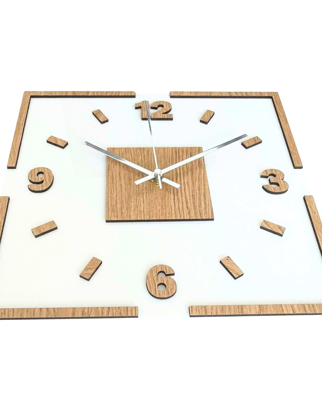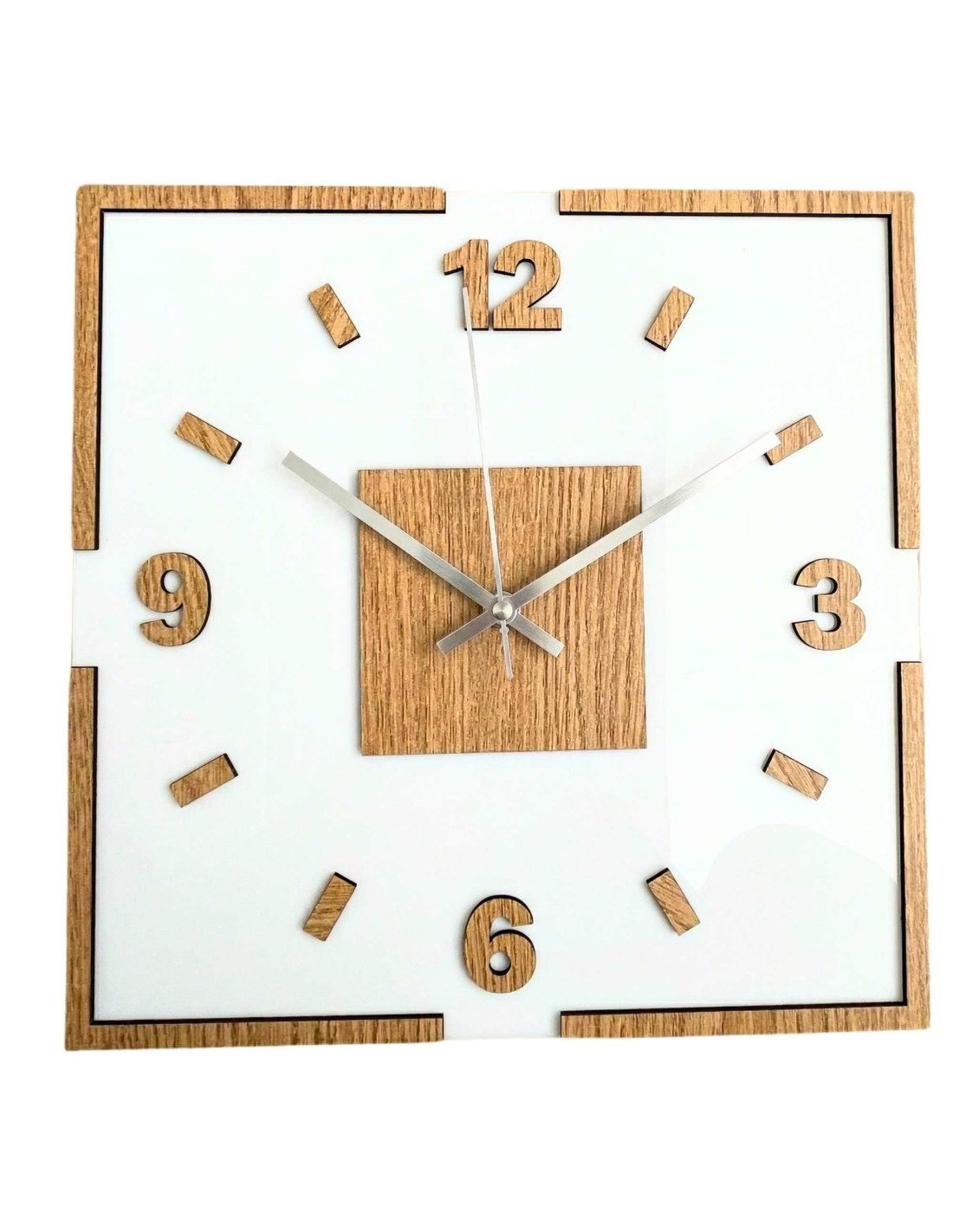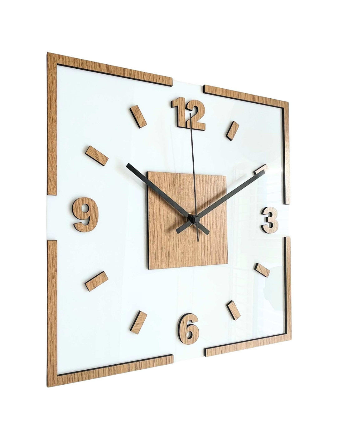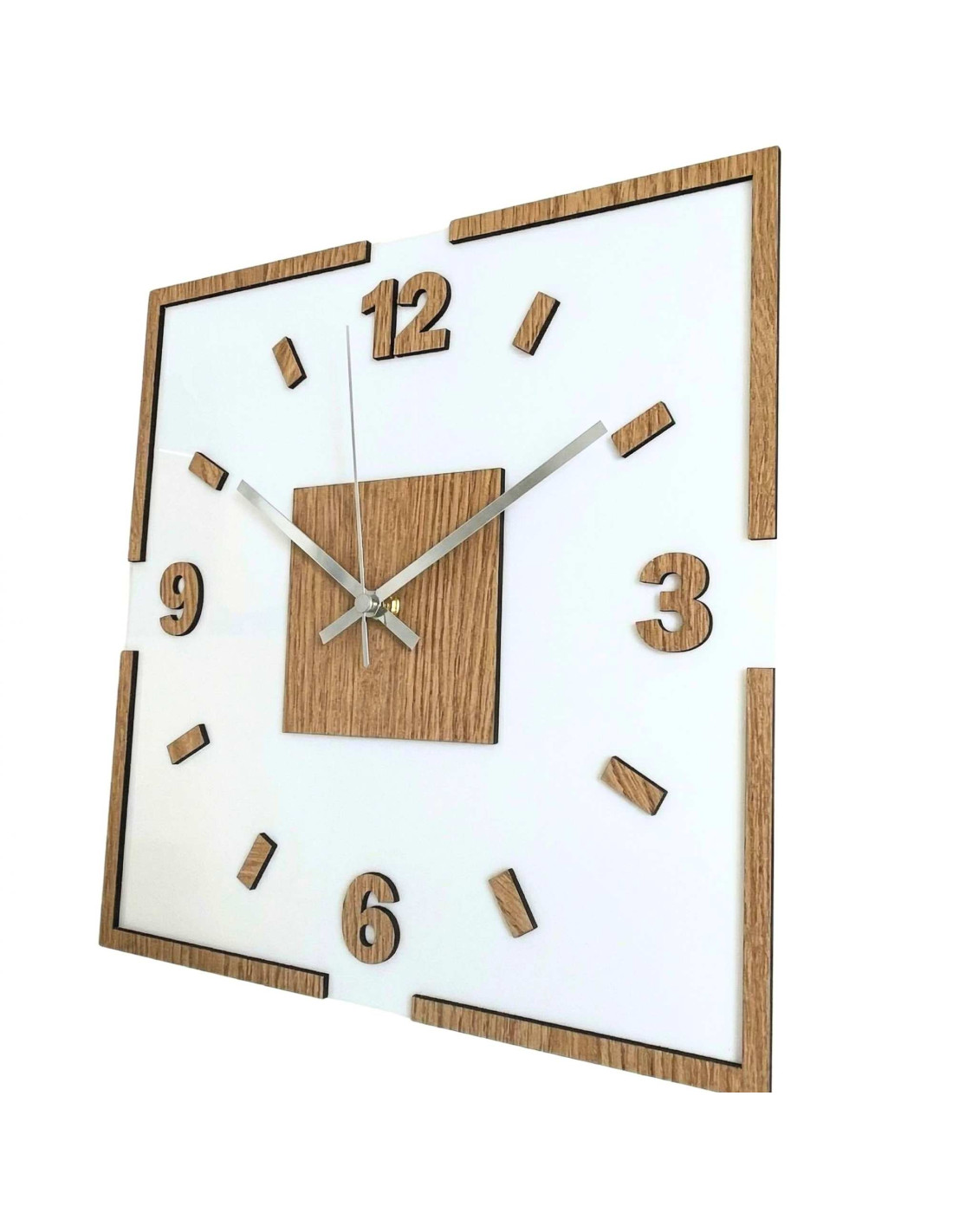 The center of the clock is highlighted by an oak square, from which black or silver hands emerge for perfect contrast and legibility.