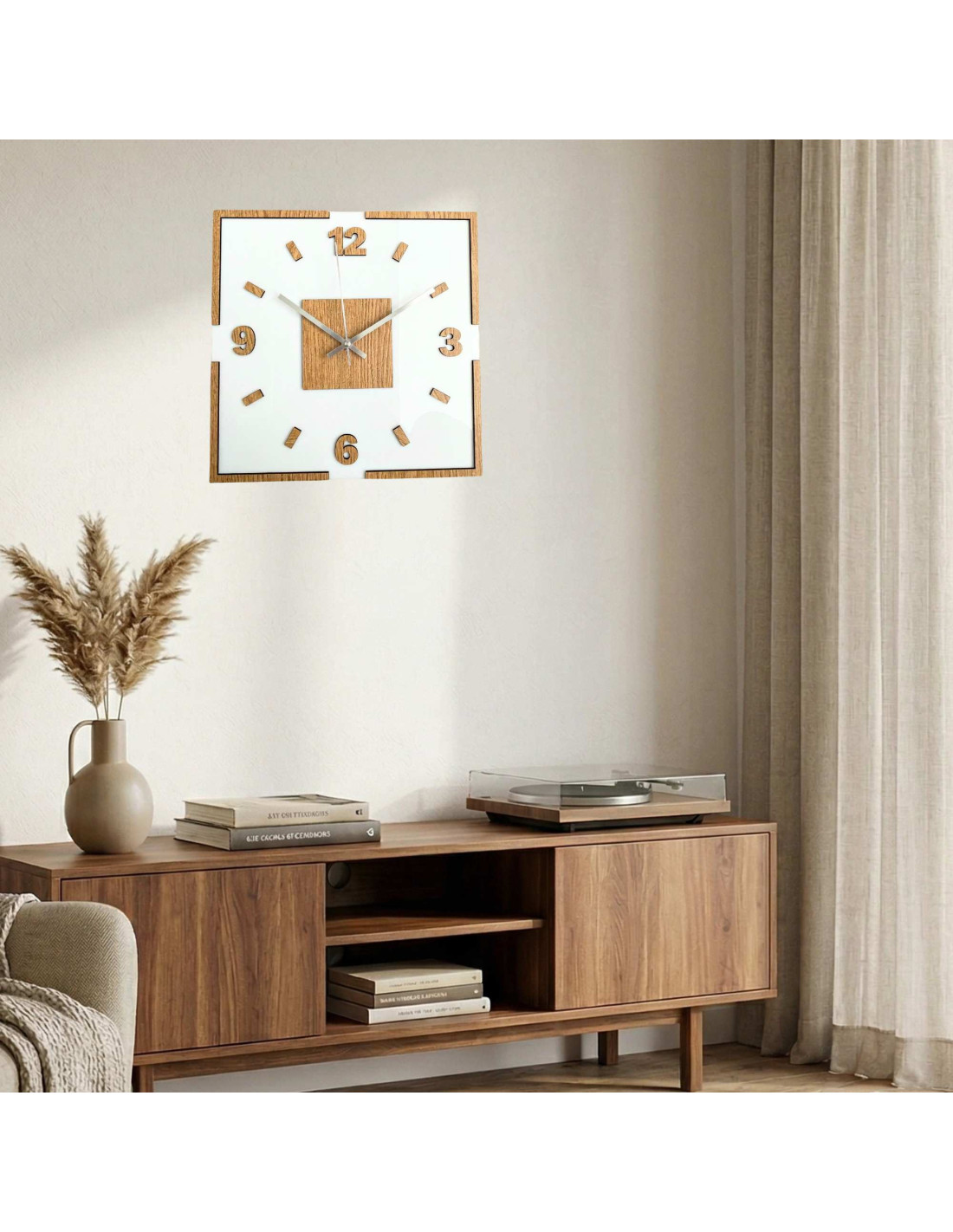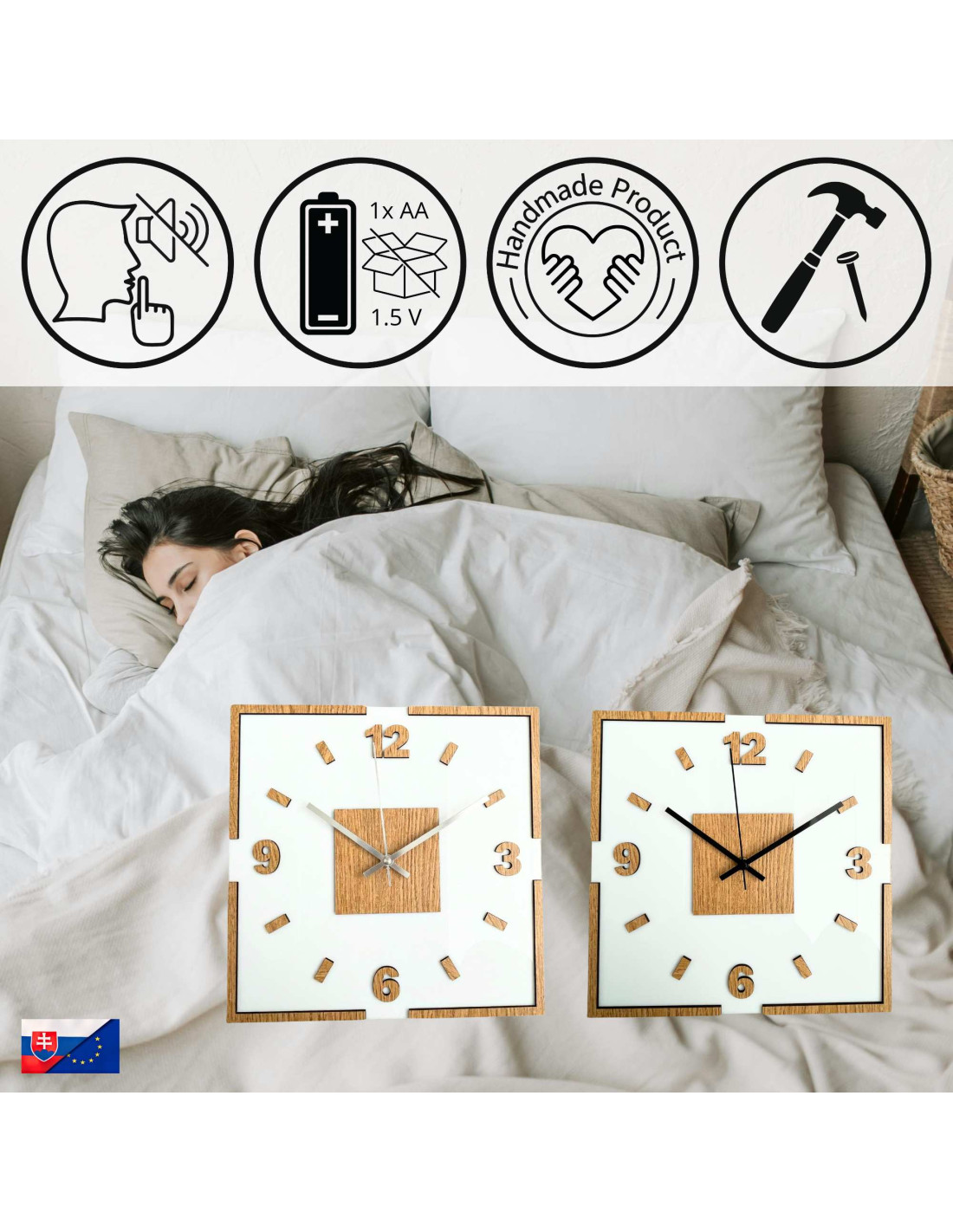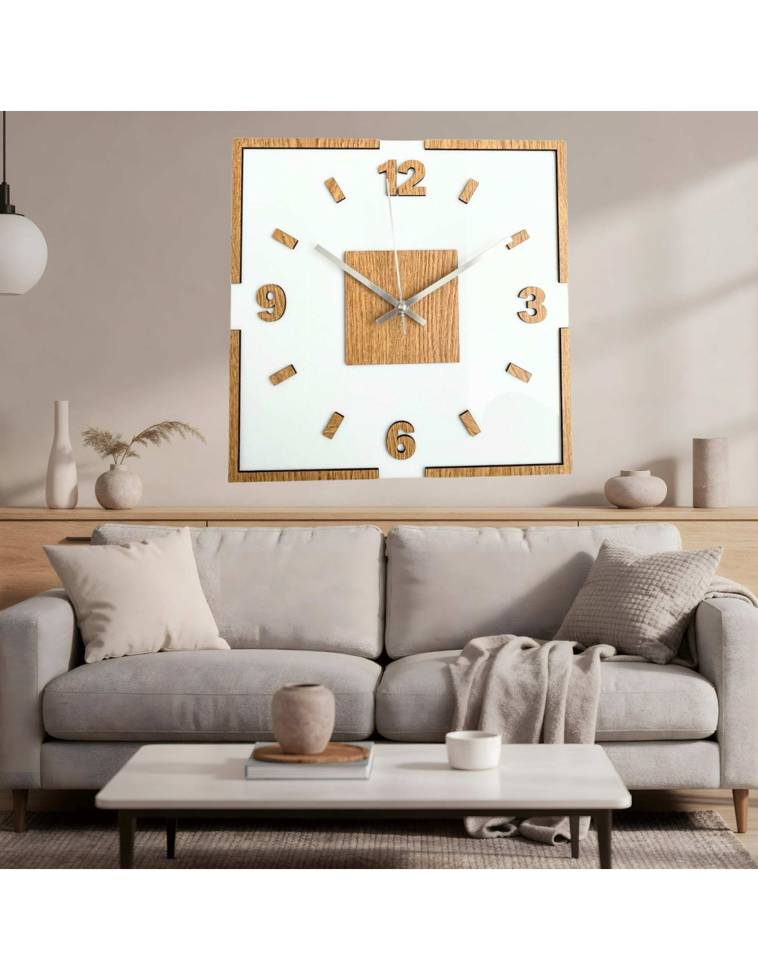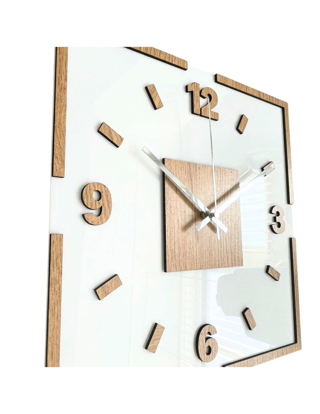 The center of the clock is highlighted by an oak square, from which black or silver hands emerge for perfect contrast and legibility.