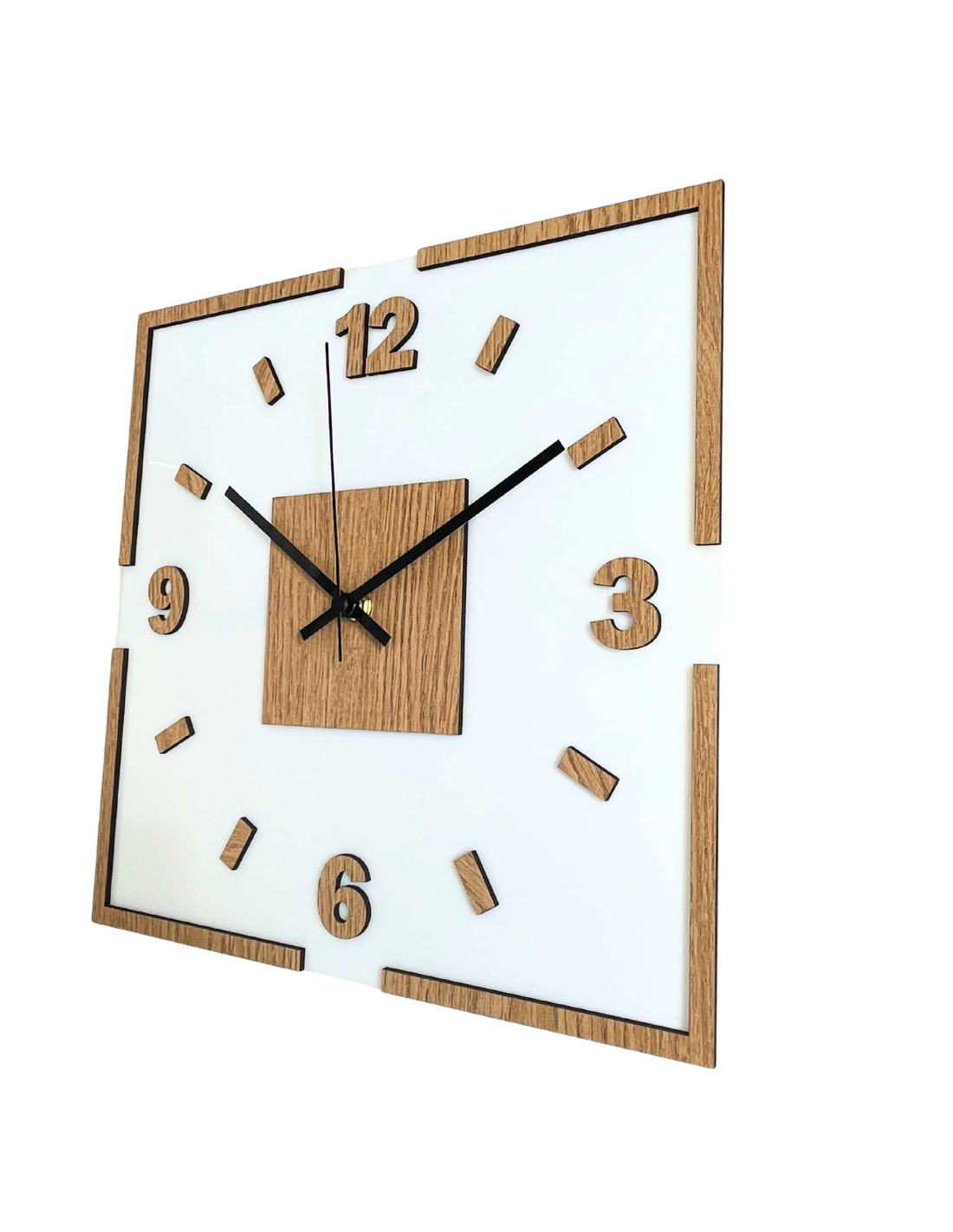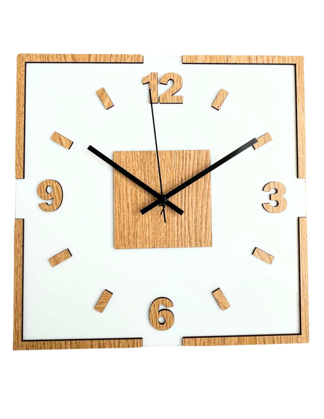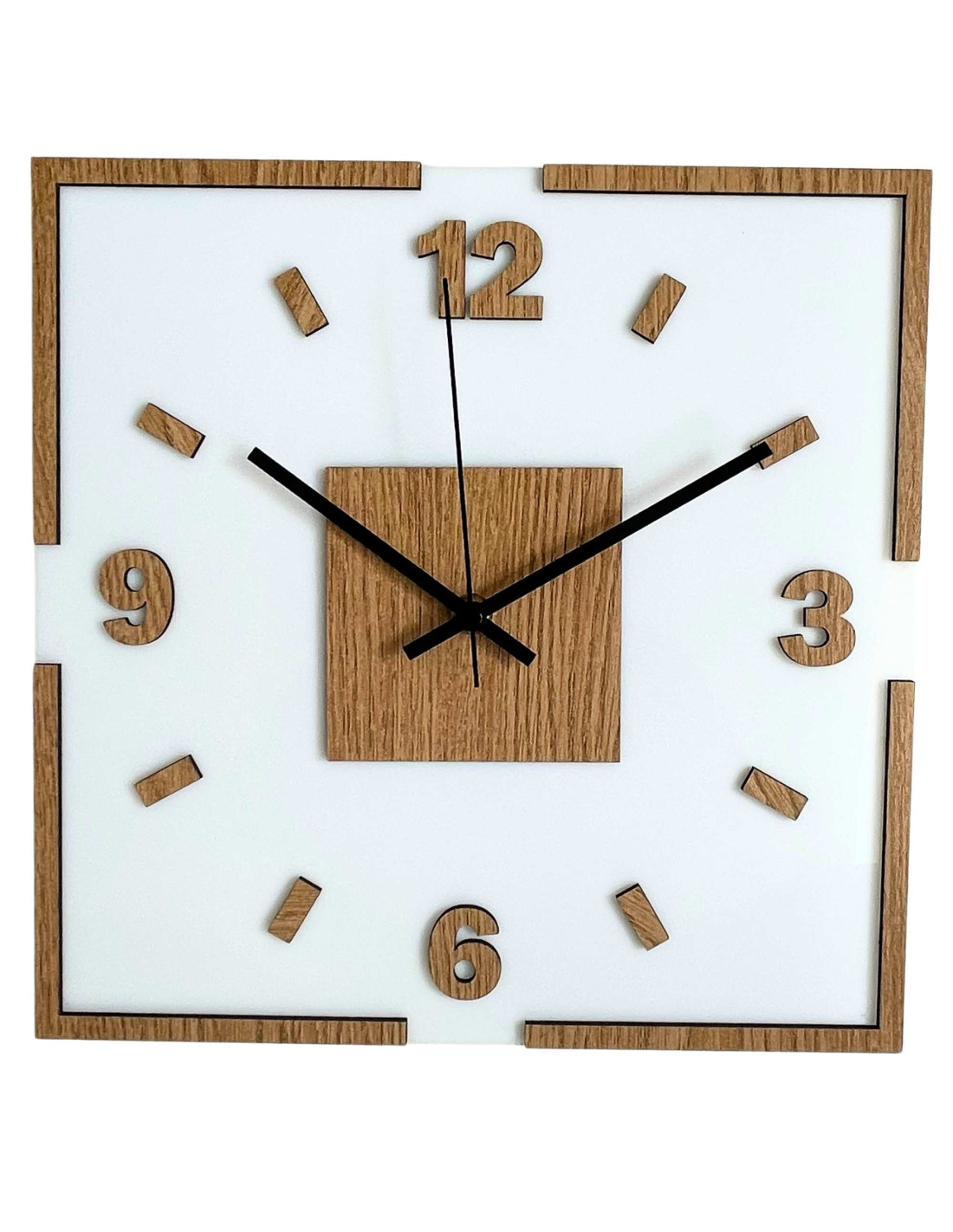 The center of the clock is highlighted by an oak square, from which black or silver hands emerge for perfect contrast and legibility.