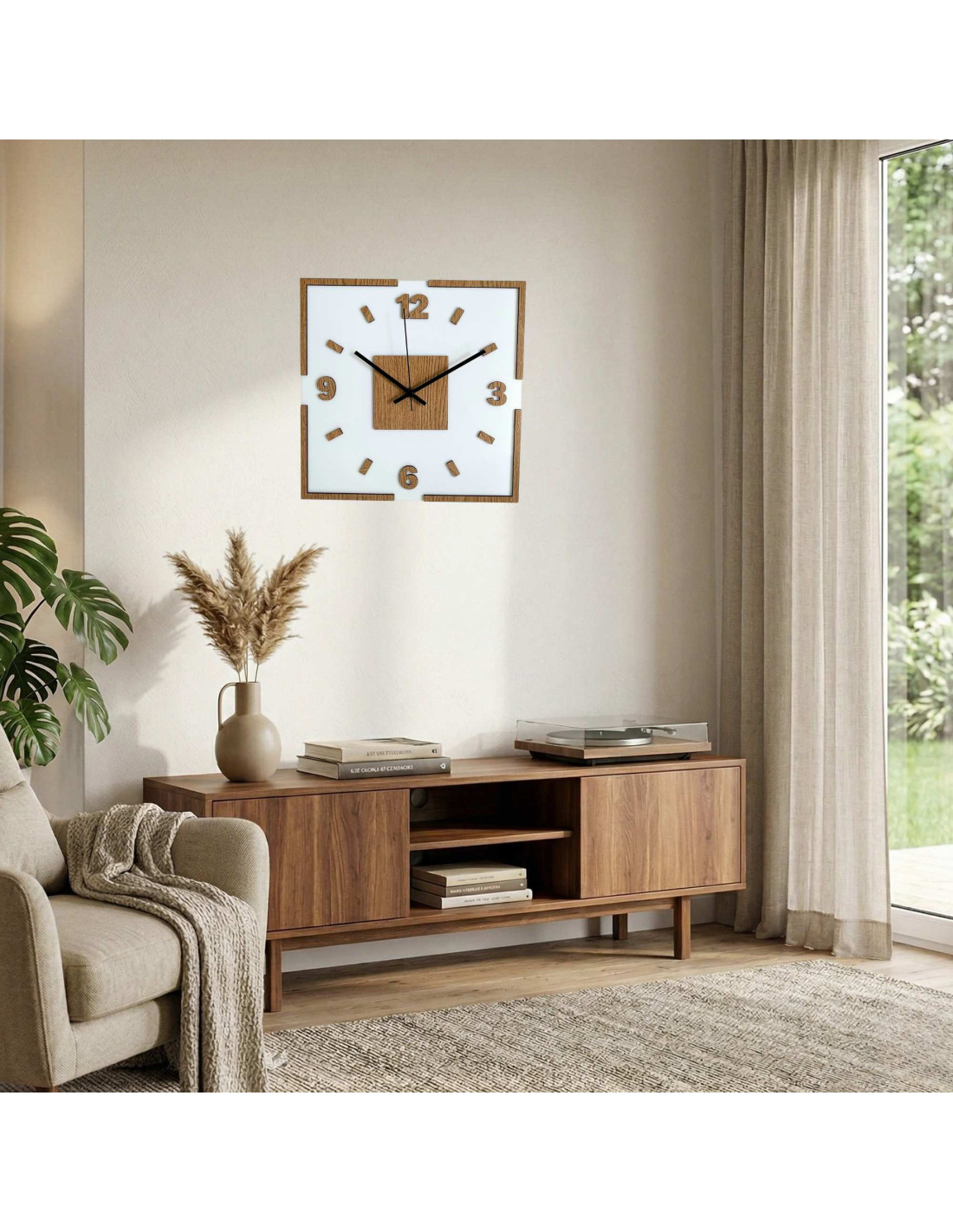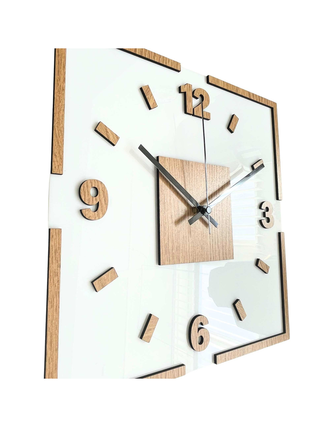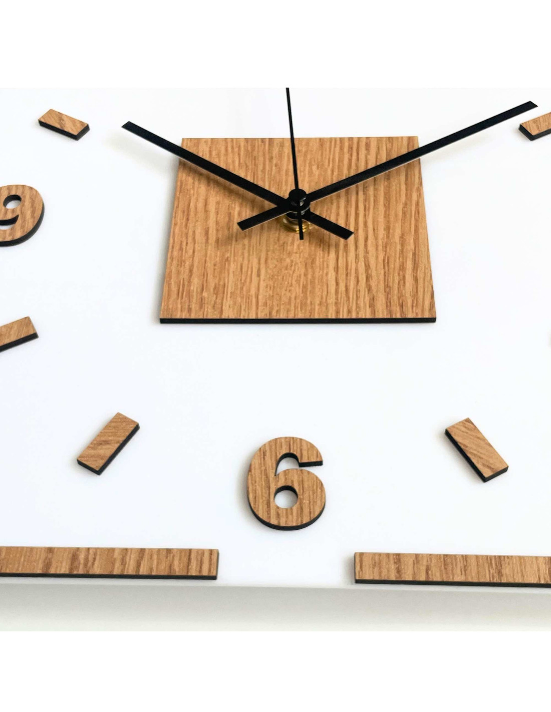 The center of the clock is highlighted by an oak square, from which black or silver hands emerge for perfect contrast and legibility.